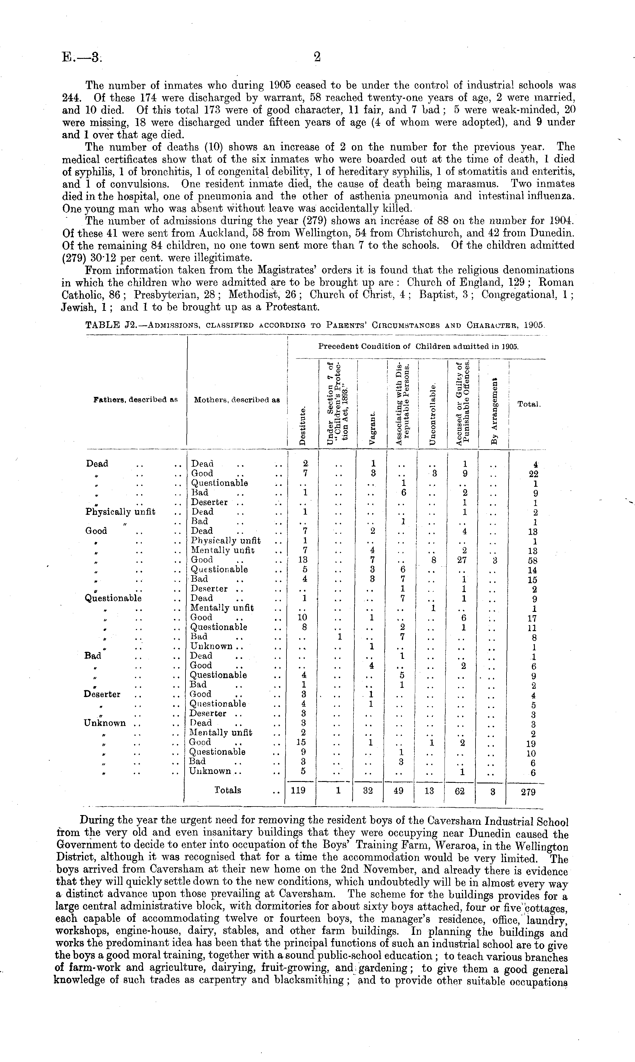 The number of inmates who during 1905 ceased to be under the control of industrial schools was 244. Of these 174 were discharged by warrant, 58 reached twenty-one years of age, 2 were married, and 10 died. Of this total 173 were of good character, 11 fair, and 7 bad ; 5 were weak-minded, 20 were missing, 18 were discharged under fifteen years of age (4 of whom were adopted), and 9 under and 1 over that age died. The number of deaths (10) shows an increase of 2 on the number for the previous year. The medical certificates show that of the six inmates who were boarded out at the time of death, 1 died of syphilis, 1 of bronchitis, 1 of congenital debility, 1 of hereditary syphilis, 1 of stomatitis and enteritis, and 1 of convulsions. One resident inmate died, the cause of death being marasmus. Two inmates died in the hospital, one of pneumonia and the other of asthenia pneumonia and intestinal influenza. One young man who was absent without leave was accidentally killed. The number of admissions during the year (279) shows an increase of 88 on the number for 1904. Of these 41 were sent from Auckland, 58 from Wellington, 54 from Christchurch, and 42 from Dunedin. Of the remaining 84 children, no one town sent more than 7to the schools. Of the children admitted (279) 30-12 per cent, were illegitimate. From information taken from the Magistrates' orders it is found that the religious denominations in which the children who were admitted are to be brought up are : Church of England, 129 ; Roman Catholic, 86 ; Presbyterian, 28 ; Methodist, 26 ; Church of Christ, 4 ; Baptist, 3 ; Congregational, 1 ; Jewish, 1 ; and 1 to be brought up as a Protestant.