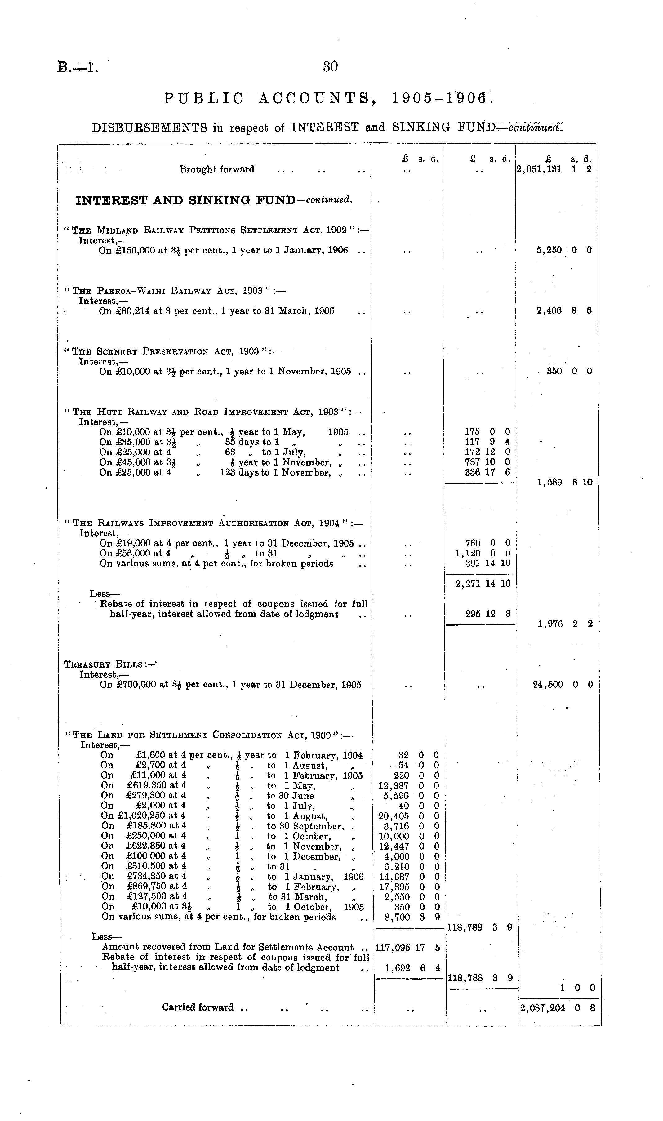 Brought forward £ s. £ s. d. a. £ £ s. d. £ s. d. 2,051,131 1 2 s. d. INTEREST AND SINKING FUND -continued. " The Midland Railway Petitions Settlement Act, 1902 ":— Interest, — On £150,000 at 3J per cent., 1 year to 1 January, 1906 .. I 5,250 0 0 " The Paeeoa-Waihi Railway Act, 1903 " :— Interest, — On £80,214 at 3 per oent., 1 year to 31 March, 1906 2,406 8 6 " The Soeneby Preservation Act, 1903 " :— Interest, — On £10,000 at 3J per cent., 1 year to 1 November, 1905 .. ■ 350 0 0 "The Hutt Railway and Road Improvement Act, 1903": — Interest, — On £', 0,000 at 3J per oent., J year to 1 May, 1905 .. On £35,000 at 3J „ 35 days to 1 „ „ .. On £25,000 at 4 „ 63 „ to 1 July, On £45,000 at „ £ year to 1 November, „ On £25,000 at 4 „ 123 days to 1 Noverrber, „ 175 0 0 117 9 4 ! 172 12 0 : 787 10 0 336 17 6 1,589 8 10 " The Railways Improvement Authorisation Act, 1904 " :— Interest, — On £19,000 at 4 per cent., 1 year to 31 December, 1905 .. On £56,000 at 4 J „ to 31 „ „ .. On various sums, at 4 per cent., for broken periods 760 0 0 1,120 0 0 391 14 10 Less — " Bebate of interest in respect of coupons issued for full half-year, interest allowed from date of lodgment 2,271 14 10 295 12 8 1,976 2 2 Tbbasuey Bills:—Interest, — On £700,000 at 3J per cent., 1 year to 31 December, 1905 24,500 0 0 • " The Land for Settlement Consolidation Act, 1900 ":— Interest, — On £1,600 at 4 per oent., J year to 1 February, 1904 On £2,700 at 4 „ }', to 1 August, On £11,000 at 4 „ | „ to 1 February, 1905 On £619.350 at 4 „ | „ to 1 May, On £279,800 at 4 „ | „ to 30 June On £2,000 at 4 „ | „ to 1 July, On £1,020,250 at 4 „ { „ to 1 August, On £185.800 at 4 „ \ „ to 30 September, ., On £250,000 at 4 „ 1 „ to 1 October, On £622,350 at 4 „ J „ to 1 November, „ On £100 000 at 4 „ 1 „ to 1 December, „ On £310.500 at i „ J „ to 31 ; ■ On £734,350 at 4 „ } , to 1 January, 1906 On £869,760 at 4 ,. J „ to 1 February, „ On £127,500 at 4 \ „ to 31 March, On £10,000 at 3J „ 1 „ to 1 October, 1905 On various sums, at 4 per cent., for broken periods 32 0 0 54 0 0 220 0 0 12,387 0 0 5,596 0 0 40 0 0 20,405 0 0 3,716 0 0 10,000 0 0 12,447 0 0 4,000 0 0 6,210 0 0 [ 14,687 0 0 i 17,395 0 0 2,550 0 0 350 0 0 8,700 3 9 Less— Amount recovered from Land for Settlements Account .. Bebate of interest in respect of coupons issued for full half-year, interest allowed from date of lodgment 118,789 3 9 [ - 117,095 17 5 1,692 6 4 118,788 3 9 10 0 Carried forward 2,087,204 0 8
