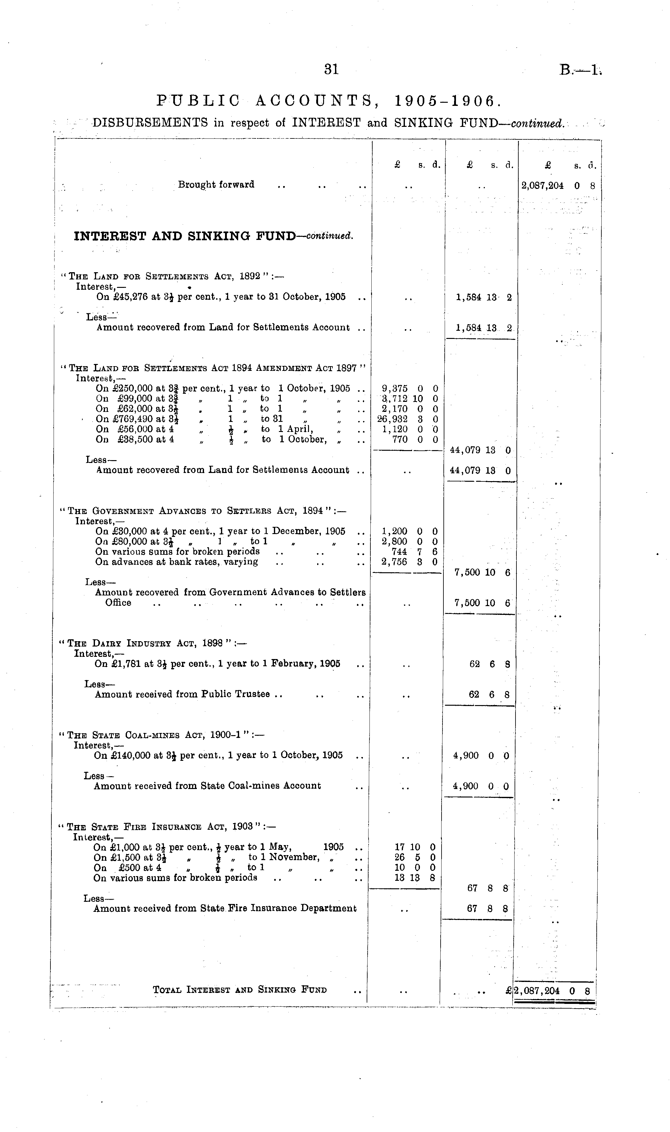 £ s. d. £ s. d. £ s. a. Brought forward .. 2,087,204 0 8 INTEREST AND SINKING FVNB-oontinued. "The Land fob Settlements Act, 1892": — Interest, — • On £45,276 at 3J per cent., 1 year to 31 October, 1905 .. 1,584 13 2 LessAmount recovered from Land for Settlements Account .. 1,584 13 2 " The Land fob Settlements Act 1894 Amendment Act 1897 " Interest, — On £250,000 at 3| per cent., 1 year to 1 October, 1905 .. On £99,000 at 3| 1 „ to 1 „ ..'... On £62,000 at 3$ . 1 „ to 1 „ „ ■ On £769,490 at 3§ . 1 „ to 31 , „ On £56,000 at 4 „ \ „ to 1 April, On £38,500 at 4 , § „ to 1 October, „ 9,375 0 0 $,712 10 0 2,170 0 0 26,932 3 0 1,120 0 0 770 0 0 Less— Amount recovered from Land for Settlements Account .. 44,079 13 0 44,079 13 0 "The Govebnment Advances to Settlers Act, 1894":— Interest, — On £30,000 at 4 per cent., 1 year to 1 December, 1905 .. Oα £80,000 at 3J , 1 . to 1 On various sums for broken periods On advances at bank rates, varying 1,200 0 0 2,800 0 0 744 7 6 2,756 3 0 Less— Amount recovered from Government Advances to Settlers Office .. .. .. .. .. 7,500 10 6 7,500 10 6 " The Dairy Industry Act, 1898 " :— Interest, — On £1,781 at 3J per cent., 1 year to 1 February, 1905 62 6 8 Less— Amount received from Public Trustee 62 6 8 "The State Coal-mines Act, 1900-1":— Interest, — On £140,000 at 3J per cent., 1 year to 1 October, 1905 .. 4,900 0 0 Less — Amount received from State Coal-mines Account 4,900 0 0 "The State Fire Insurance Act, 1903": — Interest, — On £1,000 at 3J per cent., % year to 1 May, 1905 .. On £1,500 at 3 J „ i „ to 1 November, „ Oα £500 at i . * . to 1 On various sums for broken periods 17 10 0 26 5 0 10 0 0 13 13 8 Lesa— Amount received from State Fire Insurance Department 67 8 8 67 8 8 Total Interest and Sinking Fund 2,087,204 0 8