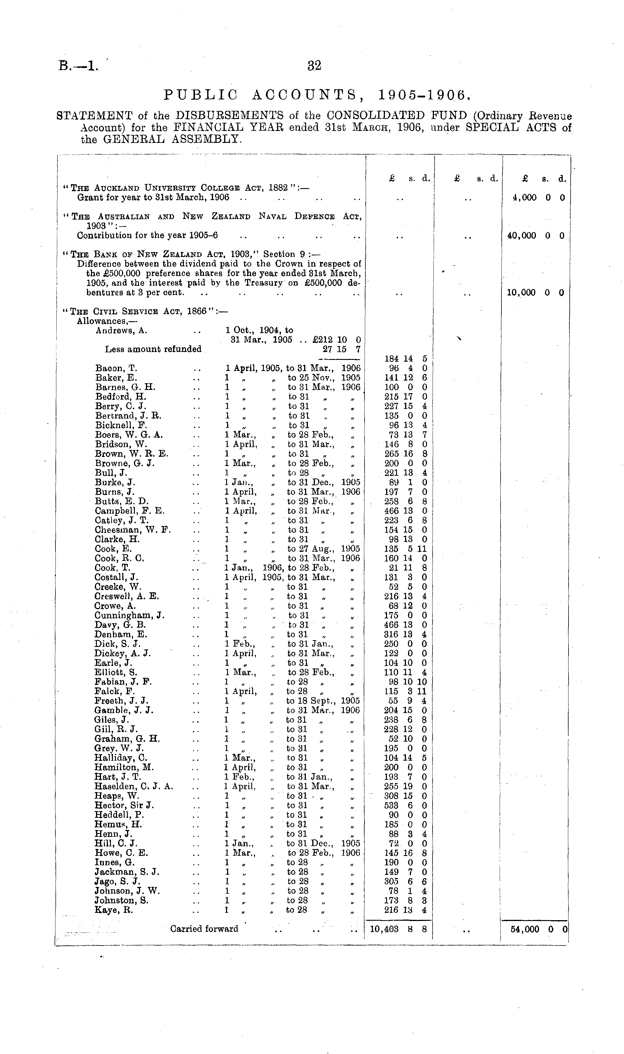 " The Auckland University College Act, 1882 " :— Grant for year to 31st March, 1906 .. £ s. d. £ s. d. £ s. d. 4,000 0 0 " The Austbalian and New Zealand Naval Defence Act, 1903": — Contribution for the year 1905-6 40,000 0 0 "The Bank of New Zealand Act, 1903," Section 9 :— Difference between the dividend paid to the Crown in respect of the £500,000 preference shares for the year ended 31st March, 1905, and the interest paid by the Treasury on £500,000 debentures at 3 per cent. 10,000 0 0 "The Civil Service Act, 1866": — Allowances, — Andrews, A. 1 Oct., 1904, to 31 Mar., 1905 .. £212 10 0 Less amount refunded 27 15 7 a Bacon, T. 1 April, 1905, to 31 Mar., 1906 Baker, E. .. 1 „ „ to 25 Nov., 1905 Barnes, G. H. .. 1 „ „ to 31 Mar., 1906 Bedford, H. .. 1 „ „ to 31 „ Berry, C. J. .. 1 „ „ to 31 Bertrand, J. B. .. 1 „ to 31 Bicknell, F. .. 1 „ „ to 31 „ Boers, W. G. A. .. 1 Mar., „ to 28 Feb., Bridson, W. .. 1 April, „ to 31 Mar., Brown, W. R. E. .. 1 „ „ to 31 „ Browne, G. J. .. 1 Mar., „ to 28 Feb., Bull, J. 1 „ to 28 „ Burke, J. .. 1 Jan., „ to 31 Dec, 1905 Burns, J. .. 1 April, „ to 31 Mar., 1906 Butts, E. D. .. 1 Mar., „ to 28 Feb., Campbell, F. E. ..' 1 April, „ to 31 Mar., Catley, J. T. .. 1 „ to 31 „ Cheesman, W. F. .. 1 „ to 31 „ Clarke, H. 1 „ to 31 „ Cook, E. 1 „ to 27 Aug., 1905 Cook, R. C. . . 1 „ „ to 31 Mar., 1906 Cook, T. .. Uan., 1906, to 28 Feb., Costall, J. .. 1 April, 1905, to 31 Mar., Creeke, W. .. 1 „ „ to 31 „ Creswell, A. E. .. 1 „ „ to 31 Crowe, A. 1 „ „ to 31 „ „ Cunningham, J. .. 1 „ „ to 31 Davy, G. B. .. 1 „ „ to 31 „ Denham, E. 1 to 31 Dick, S. J. .. 1 Feb., „ to 31Jan., Dickey, A. J. .. 1 April, „ to 31 Mar., Earle, J. 1 to 31 „ Elliott, S. .. 1 Mar., „ to 28 Feb., Fabian, J. F. .. 1 „ „ to 28 „ Falck, F. .. 1 April, „ to 28 „ Freeth, J. J. .. 1 „ „ to 18 Sept., 1905 Gamble, J. J. .. 1 „ „ to 31 Mar., 1906 Giles, J. 1 „ to 31 „ Gill, R.J. .. 1 „ „ to 31 „ Graham, G. H. .. 1 „ „ to 31 „ Grey. W. J. .. 1 „ „ to 31 „ Halliday, C. .. 1 Mar., „ to 31 „ Hamilton, M. .. 1 April, „ to 31 „ Hart, J. T. .. 1 Feb., „ to 31 Jan., Haselden, C. J. A. .. 1 April, „ to 31 Mar., Heaps, W. 1 „ to 31 • „ Hector, Sir J. .. 1 „ „ to 31 Heddell, P. .. 1 „ „ to 31 „ Hemus, H. 1 „ to 31 „ Henn, J. 1 „ to 31 „ Hill, C. J. .. 1 Jan., „ to 31 Dec, 1905 Howe, C. E. .. 1 Mar., „ to 28 Feb., 1906 Innes, G. .. 1 „ „ to 28 „ Jackman, S. J. .. 1 „ „ to 28 „ Jago, S. J. .. 1 „ „ to 28 „ Johnson, J. W. .. 1 „ „ to 28 „ Johnston, S. .. 1 „ „ to 28 Kaye, R. .. 1 „ „ to 28 „ 184 14 5 96 4 0 141 12 6 100 0 0 215 17 0 227 15 4 135 0 0 96 13 4 73 13 7 146 8 0 265 16 8 200 0 0 221 13 4 89 1 0 197 7 0 258 6 8 466 13 0 223 6 8 154 15 0 98 13 0 135 5 11 160 14 0 21 11 8 131 3 0 52 5 0 216 13 4 68 12 0 175 0 0 466 13 0 316 13 4 250 0 0 122 0 0 104 10 0 110 11 4 98 10 10 115 3 11 55 9 4 204 15 0 238 6 8 228 12 0 52 10 0 195 0 0 104 14 5 200 0 0 193 7 0 255 19 0 308 15 0 533 6 0 90 0 0 185 0 0 88 3 4 72 0 0 145 16 8 190 0 0 149 7 0 305 6 6 78 1 4 173 8 3 216 13 4 Carried forward .. 10,403 8 8 54,000 0 0