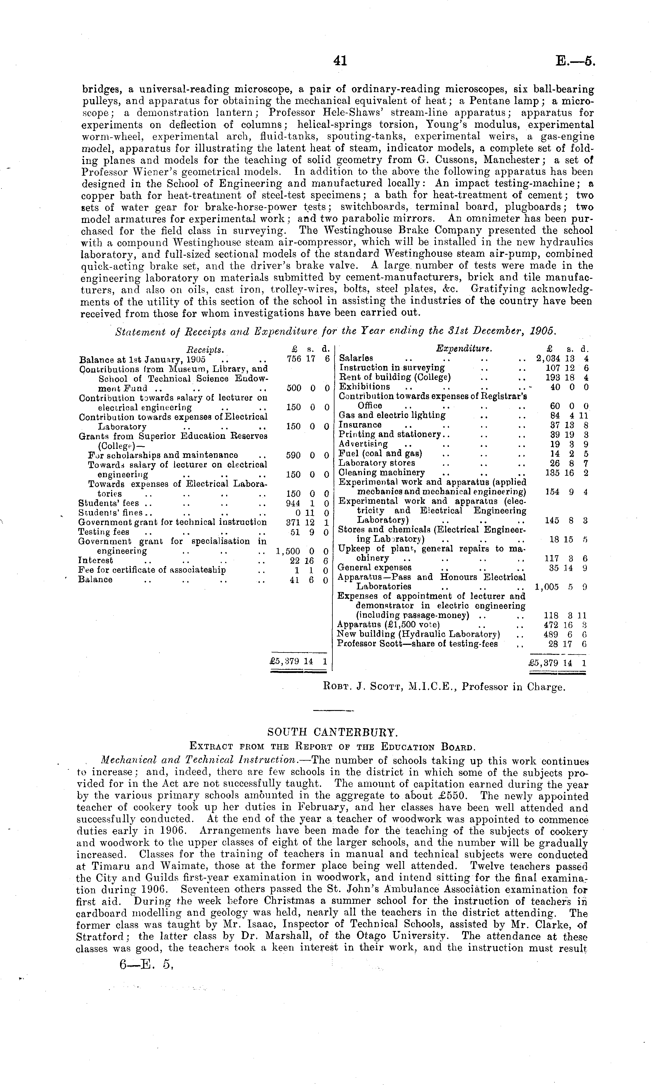 bridges, a universal-reading microscope, a pair of ordinary-reading microscopes, six ball-bearing pulleys, and apparatus for obtaining the mechanical equivalent of heat; a Pentane lamp; a microscope; a demonstration lantern; Professor Hele-Shaws' stream-line apparatus; apparatus for experiments on deflection of columns; helical-springs torsion, Young's modulus, experimental worm-wheel, experimental arch, fluid-tanks, spouting-tanks, experimental weirs, a gas-engine model, apparatus for illustrating the latent heat of steam, indicator models, a complete set of folding planes and models for the teaching of solid geometry from G. Cussons, Manchester; a set of Professor Wiener's geometrical models. In addition to the above the following apparatus has been designed in the School of Engineering and manufactured locally: An impact testing-machine; a copper bath for heat-treatment of steel-test specimens; a bath for heat-treatment of cement; two sets of water gear for brake-horse-power tests; switchboards, terminal board, plugboards; two model armatures for experimental work; and two parabolic mirrors. An omnimeter has been purchased for the field class in surveying. The Westinghouse Brake Company presented the school with a compound Westinghouse steam air-compressor, which will be installed in the new hydraulics laboratory, and full-sized sectional models of the standard Westinghouse steam air-pump, combined quick-acting brake set, and the driver's brake valve. A large, number of tests were made in the engineering laboratory on materials submitted by cement-manufacturers, brick and tile manufacturers, and also on oils, cast iron, trolley-wires, bolts, steel plates, &c. Gratifying acknowledgments of the utility of this section of the school in assisting the industries of the country have been received from those for whom investigations have been carried out. Statement of Beceipts and Expenditure for the Year ending the 31st December, 1905. Receipts. £ s. d. Expenditure. £ s. d. Balance at Ist January, 1905 .. .. 756 17 6 Salaries .. .. .. .. 2,034 13 4 Contributions from Museum, Library, and Instruction in surveying .. .. 107 12 6 School of Technical Science Endow- Rent of building (College) .. .. 193 18 4 merit Fund .. .. .. 500 0 0 Exhibitions .. .. .. ..- 40 0 0 Contribution towards salary of lecturer on Contribution towards expenses of Registrar's electrical engineering .. .. 150 0 0 Office .. .. .. .. 60 0 0 Contribution towards expenses of Electrical Gas and electric lighting .. .. 84 4 11 Laboratory .. .. .. 150 0 0 Insurance .. .. .. .. 37 13 8 Grants from Superior Education Reserves Printing and stationery.. .. .. 39 19 3 (Collegt-)— Advertising .. .. .. .. 19 3 9 For scholarships and maintenance .. 590 0 0 Fuel (coal and gas) .. .. .. 14 2 5 Towards salary of lecturer on electrical Laboratory stores .. .. .. 26 8 7 engineering .. .. .. 150 0 0 Cleaning machinery .. .. .. 135 16 2 Towards expenses of Electrical Labora- Experimental work and apparatus (applied tories .. ~ .. 150 0 0 mechanios and mechanical engineering) 154 9 4 Students' fees .. .. .. .. 944 1 0 Experimental work and apparatus (eleoStudents'fines.. .. .. .. 011 0 tricky and Electrical Engineering Government grant for technical instruction 37112 1 Laboratory) .. .. .. 145 8 3 Testing fees .. .. .. .. 51 9 0 Stores and chemicals (Electrical EngineerGovernment grant for specialisation in ing Laboratory) .. .. .. 18 15 5 engineering .. .. .. 1,500 0 0 Upkeep of plant, general repairs to maInterest .. .. .. .. 22 16 6 chinery .. .. .. .. 117 3 6 Fee for certificate of associateship .. 110 General expenses .. .. .. 35 14 9 Balance .. .. .. 41 6 0 -Apparatus—Pass and Honours Electrioal Laboratories .. .. .. 1,005 5 9 Expenses of appointment of lecturer and demonstrator in electric engineering (including rassage-money) .. .. 118 3 11 Apparatus (£1,500 vote) .. .. 472 16 3 New building (Hydraulic Laboratory) .. 489 6 6 Professor Scott—share of testing-fees .. 28 17 6 £5,379 14 1 £5,379 14 1 Robt. J. Scott, M.1.C.E., Professor in Charge.