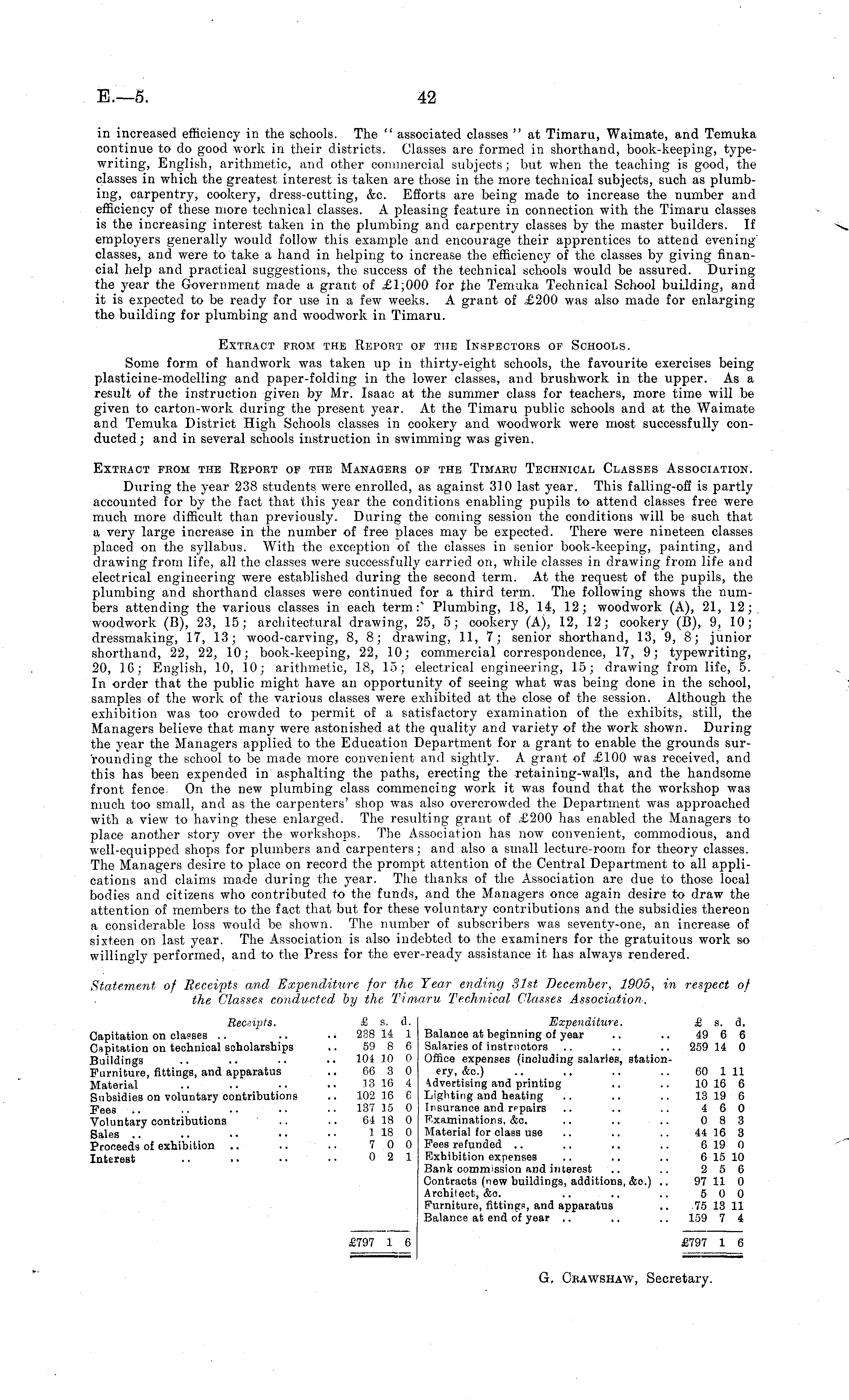 in increased efficiency in the schools. The " associated classes "at Timaru, Waimate, and Temuka continue to do good work in their districts. Classes are formed in shorthand, book-keeping, typewriting, English, arithmetic, and other commercial subjects; but when the teaching is good, the classes in which the greatest interest is taken are those in the more technical subjects, such as plumbing, carpentry, cookery, dress-cutting, &c. Efforts are being made to increase the number and efficiency of these more technical classes. A pleasing feature in connection with the Timaru classes is the increasing interest taken in the plumbing and carpentry classes by the master builders. If employers generally would follow this example and encourage their apprentices to attend eveningclasses, and were to take a hand in helping to increase the efficiency of the classes by giving financial help and practical suggestions, the success of the technical schools would be assured. During the year the Government made a grant of £1;000 for the Temuka Technical School building, and it is expected to be ready for use in a few weeks. A grant of £200 was also made for enlarging the building for plumbing and woodwork in Timaru. Extract from the Report of the Inspectors of Schools. Some form of handwork was taken up in thirty-eight schools, the favourite exercises being plasticine-modelling and paper-folding in the lower classes, and brushwork in the upper. As a result of the instruction given by Mr. Isaac at the summer class for teachers, more time will be given to carton-work during the present year. At the Timaru public schools and at the Waimate and Temuka District High Schools classes in cookery and woodwork were most successfully conducted; and in several schools instruction in swimming was given. Extract from the Report of the Managers of the Timaru Technical Classes Association. During the year 238 students were enrolled, as against 310 last year. This falling-off is partly accounted for by the fact that this year the conditions enabling pupils to attend classes free were much more difficult than previously. During the coming session the conditions will be such that a very large increase in the number of free places may be expected. There were nineteen classes placed on the syllabus. With the exception of the classes in senior book-keeping, painting, and drawing from life, all the classes were successfully carried on, while classes in drawing from life and electrical engineering were established during the second term. At the request of the pupils, the plumbing and shorthand classes were continued for a third term. The following shows the numbers attending the various classes in each term:" Plumbing, 18, 14, 12; woodwork (A), 21, 12; woodwork (B), 23, 15; architectural drawing, 25, 5; cookery (A), 12, 12; cookery (B), 9, 10; dressmaking, 17, 13; wood-carving, 8, 8; drawing, 11, 7; senior shorthand, 13, 9, 8; junior shorthand, 22, 22, 10; book-keeping, 22, 10; commercial correspondence, 17, 9; typewriting, 20, 16; English, 10, 10; arithmetic, 18, 15; electrical engineering, 15; drawing from life, 5. In order that the public might have an opportunity of seeing what was being done in the school, samples of the work of the various classes were exhibited at the close of the session. Although the exhibition was too crowded to permit of a satisfactory examination of the exhibits, still, the Managers believe that many were astonished at the quality and variety of the work shown. During the year the Managers applied to the Education Department for a grant to enable the grounds surrounding the school to be made more convenient and sightly. A grant of £100 was received, and this has been expended in asphalting the paths, erecting the retaining-walls, and the handsome front fence On the new plumbing class commencing work it was found that the workshop was much too small, and as the carpenters' shop was also overcrowded the Department was approached with a view to having these enlarged. The resulting grant of £200 has enabled the Managers to place another story over the workshops. The Association has now convenient, commodious, and well-equipped shops for plumbers and carpenters; and also a small lecture-room for theory classes. The Managers desire to place on record the prompt attention of the Central Department to all applications and claims made during the year. The thanks of the Association are due to those local bodies and citizens who contributed to the funds, and the Managers once again desire to draw the attention of members to the fact that but for these voluntary contributions and the subsidies thereon a considerable loss would be shown. The number of subscribers was seventy-one, an increase of sixteen on last year. The Association is also indebted to the examiners for the gratuitous work so willingly performed, and to the Press for the ever-ready assistance it has always rendered. Statement of Beceipts and Expenditure for the Year ending 31st December, 1905, in respect of the Classes conducted by the Timaru Technical Classes Association. Receipts. £ s. d. Expenditure. £ s. d. Capitation on classes .. .. 238 14 1 Balance at beginning of year .. .. 49 6 6 Capitation on technical scholarships .. 59 8 6 Salaries of instructors .. .. .. 259 14 0 Buildings .. .. ■. • • 104 10 0 Office expenses (including salaries, stationFurniture, fittings, and apparatus .. 66 3 0 cry, &c.) .. .. .. .. 60 111 Material .. .. .. .. 13 16 4 Advertising and printing .. .. 10 16 6 Subsidies on voluntary contributions .. 102 16 6 Lighting and heating .. .. .. 13 19 6 Fees .. .. .. •• •• 137 15 0 Insurance and repairs .. .. .. 4 6 0 Voluntary contributions .. .. 64 18 0 Examinations, &c. .. .. .. 0 8 3 Sales .. .. .. •• •• 118 0 Material for class use .. .. .. 44 16 3 Proceeds of exhibition .. .. .. 7 0 0 Fees refunded .. .. .. .. 619 0 Interest .. .. • • • • 0 2 1 Exhibition expenses .. .. .. 615 10 Bank