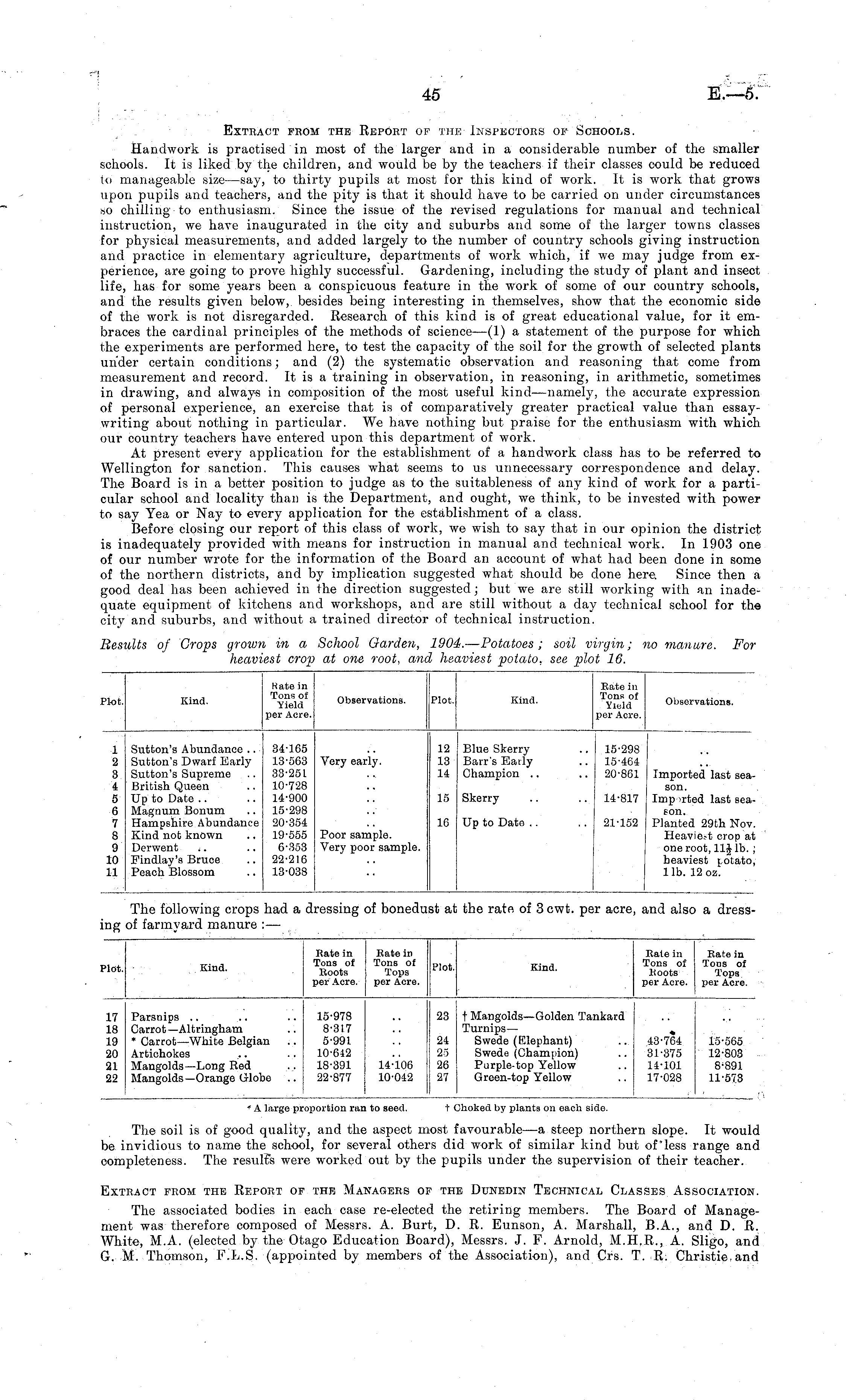 The soil is of good quality, and the aspect most favourable—a steep northern slope. It would be. invidious to name the school, for several others did work of similar kind but of'less range and completeness. The results were worked out by the pupils under the supervision of their teacher. Extract from the Report of the Managers of the Dunedin Technical Classes Association. The associated bodies in each case re-elected the retiring members. The Board of Management was therefore composed of Messrs. A. Burt, D. R. Eunson, A. Marshall, 8.A., and D. R. White, M.A. (elected by the Otago Education Board), Messrs. J. F. Arnold, M.H.R., A. Sligo, and G. M. Thomson, F.L.S. (appointed by members of the Association), and Crs. T. R. Christie,and