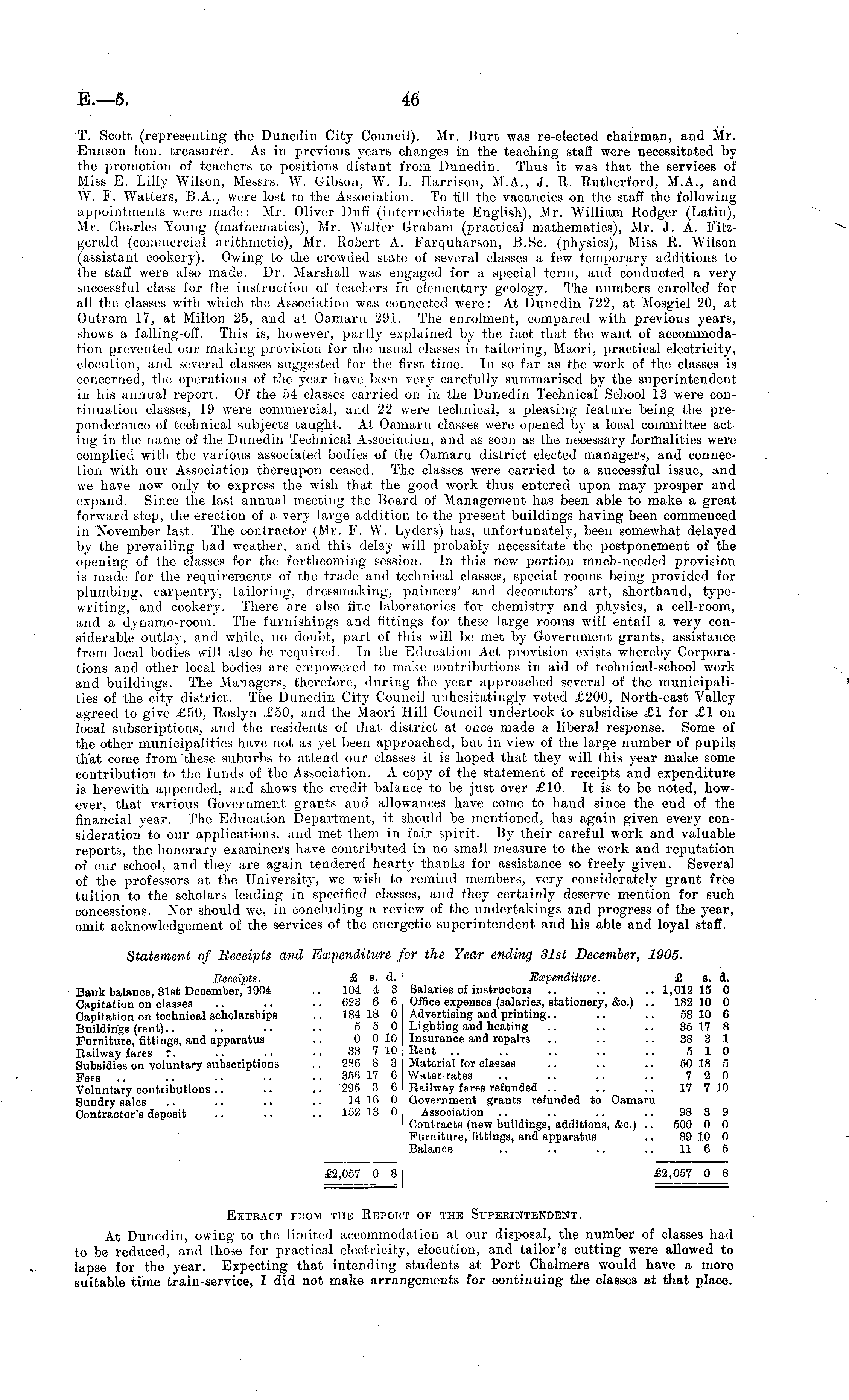 T. Scott (representing the Dunedin City Council). Mr. Burt was re-elected chairman, and Mr. Eunson hon. treasurer. As in previous years changes in the teaching stafi were necessitated by the promotion of teachers to positions distant from Dunedin. Thus it was that the services of Miss E. Lilly Wilson, Messrs. W. Gibson, W. L. Harrison, M.A., J. R. Rutherford, M.A., and W. F. Watters, 8.A., were lost to the Association. To fill the vacancies on the staff the following appointments were made: Mr. Oliver Duff (intermediate English), Mr. William Rodger (Latin), Mr. Charles Young (mathematics), Mr. Walter Graham (practical mathematics), Mr. J. A. Fitzgerald (commercial arithmetic), Mr. Robert A. Farquharson, B.Sc. (physics), Miss R. Wilson (assistant cookery). Owing to the crowded state of several classes a few temporary additions to the staff were also made. Dr. Marshall was engaged for a special term, and conducted a very successful class for the instruction of teachers in elementary geology. The numbers enrolled for all the classes with which the Association was connected were: At Dunedin 722, at Mosgiel 20, at Outram 17, at Milton 25, and at Oamaru 291. The enrolment, compared with previous years, shows a falling-off. This is, however, partly explained by the fact that the want of accommodation prevented our making provision for the usual classes in tailoring, Maori, practical electricity, elocution, and several classes suggested for the first time. In so far as the work of the classes is concerned, the operations of the year have been very carefully summarised by the superintendent in his annual report. Of the 54 classes carried on in the Dunedin Technical School 13 were continuation classes, 19 were commercial, and 22 were technical, a pleasing feature being the preponderance of technical subjects taught. At Oamaru classes were opened by a local committee acting in the name of the Dunedin Technical Association, and as soon as the necessary formalities were complied with the various associated bodies of the Oamaru district elected managers, and connection with our Association thereupon ceased. The classes were carried to a successful issue, and we have now only to express the wish that the good work thus entered upon may prosper and expand. Since the last annual meeting the Board of Management has been able to make a great forward step, the erection of a very large addition to the present buildings having been commenced in November last. The contractor (Mr. F. W. Lyders) has, unfortunately, been somewhat delayed by the prevailing bad weather, and this delay will probably necessitate the postponement of the opening of the classes for the forthcoming session. In this new portion much-needed provision is made for the requirements of the trade and technical classes, special rooms being provided for plumbing, carpentry, tailoring, dressmaking, painters' and decorators' art, shorthand, typewriting, and cookery. There are also fine laboratories for chemistry and physics, a cell-room, and a dynamo-room. The furnishings and fittings for these large rooms will entail a very considerable outlay, and while, no doubt, part of this will be met by Government grants, assistance from local bodies will also be required. In the Education Act provision exists whereby Corporations and other local bodies are empowered to make contributions in aid of technical-school work and buildings. The Managers, therefore, during the year approached several of the municipalities of the city district. The Dunedin City Council unhesitatingly voted £200, North-east Valley agreed to give £50, Roslyn £50, and the Maori Hill Council undertook to subsidise £1 for £1 on local subscriptions, and the residents of that district at once made a liberal response. Some of the other municipalities have not as yet been approached, but in view of the large number of pupils that come from these suburbs to attend our classes it is hoped that they will this year make some contribution to the funds of the Association. A copy of the statement of receipts and expenditure is herewith appended, and shows the credit balance to be just over £10. It is to be noted, however, that various Government grants and allowances have come to hand since the end of the financial year. The Education Department, it should be mentioned, has again given every consideration to our applications, and met them in fair spirit. By their careful work and valuable reports, the honorary examiners have contributed in no small measure to the work and reputation of our school, and they are again tendered hearty thanks for assistance so freely given. Several of the professors at the University, we wish to remind members, very considerately grant free tuition to the scholars leading in specified classes, and they certainly deserve mention for such concessions. Nor should we, in concluding a review of the undertakings and progress of the year, omit acknowledgement of the services of the energetic superintendent and his able and loyal staff. Statement of Receipts and Expenditure for the Year ending 31st December, 1905. Receipts, £ s. d. Expenditure. £ s. d. Bank balance, 31st Deoember, 1904 .. 104 4 3 Salaries of instructors .. .. .. 1,012 15 0 Capitation on classes .. .. ■. 623 6 6 Office expenses (salaries, stationery, &c.) .. 132 10 0 Capitation on technical scholarships .. 184 18 0 Advertising and printing.. .. .. 58 10 6 Buildings (rent).. .. .. •• 55 0 Lighting and heating .. .. .. 35 17 8 Furniture, fittings, and apparatus .. 0 010 Insurance and repairs .. .. .. 38 3 1 Railway fares t. .. •• ■• 33 710 Rent .. .. .. .. .. 510 Subsidies on voluntary subscriptions .. 256 8 3 Material for classes .. .. .. 50 13 5 Pees .. .. .. •• .. 356 17 6 Water-rates .. .. .. .. 7 2 0 Voluntary contributions .. .. .. 295 3 6 Railway fares refunded .. .. .. 17 710 Sundry sales .. .. .. .. 14 16 0 Government grants refunded to Oamaru Contractor's deposit .. • • •