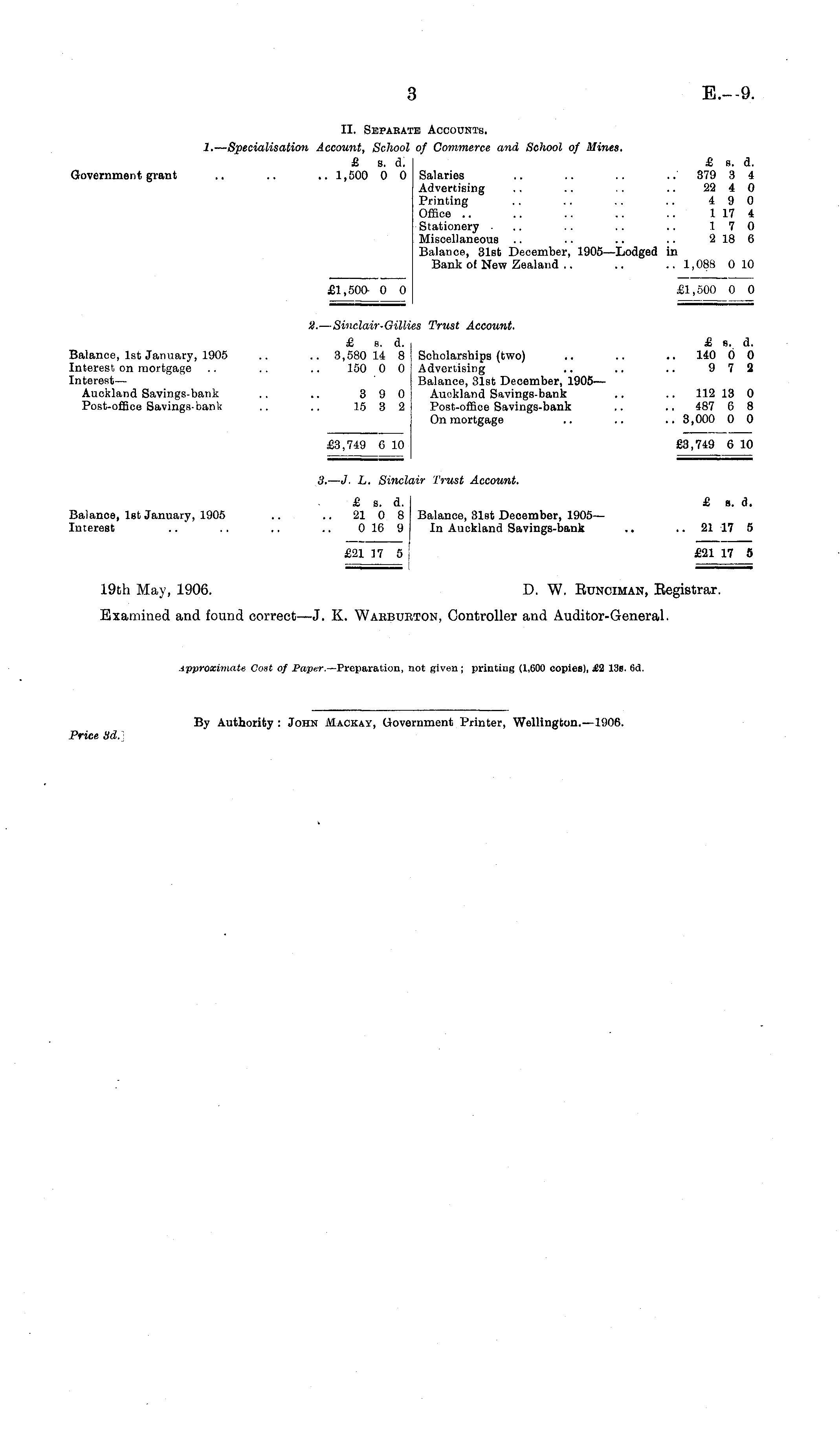 11. Sepabate Accounts. I. — Specialisation Account, School of Commerce and School of Mines. £ B. d. £ s. d. Government grant .. .. .. 1,500 0 0 Salaries .. .. .. .. 379 3 4 Advertising .. .. .. .. 22 4 0 Printing .. .. .. .. 4 9 0 Office .. .. .. .. .. 1 17 4 Stationery ... .. .. .. 170 Miscellaneous .. .. .. .. 2 18 6 Balance, 31st December, 1905 —Lodged in Bank of New Zealand .. .. .. 1,088 0 10 £1,500- 0 0 £1,600 0 0 li. — Sinclair-Gillies Trust Account. £ s. d. £ s. d. Balance, Ist January, 1905 .. .. 3,580 14 8 Scholarships (two) .. .. .. 140 6 0 Interest on mortgage .. .. .. 150 0 0 Advertising .. .. .. 9 7 2 Interest— Balance, 31st December, 1905— Auckland Savings-bank .. .. 3 9 0 Auckland Savings-bank .. .. 112 13 0 Post-office Savings-bank .. .. 15 3 2 Post-office Savings-bank .. .. 487 6 8 On mortgage .. .. .. 3,000 0 0 £3,749 6 10 £3,749 6 10 3. — J. L. Sinclair Trust Account. £ a. d. £ s. d. Balance, Ist January, 1905 .. .. 21 0 8 Balance, 31st December, 1905— Interest .. .. .. .. 0 16 9 In Auckland Savings-bank .. 21 17 5 £21 17 5 £21 17 5 19th May, 1906. D. W. Runciman, Registrar. Examined and found correct—J. K. Waebueton, Controller and Auditor-General.