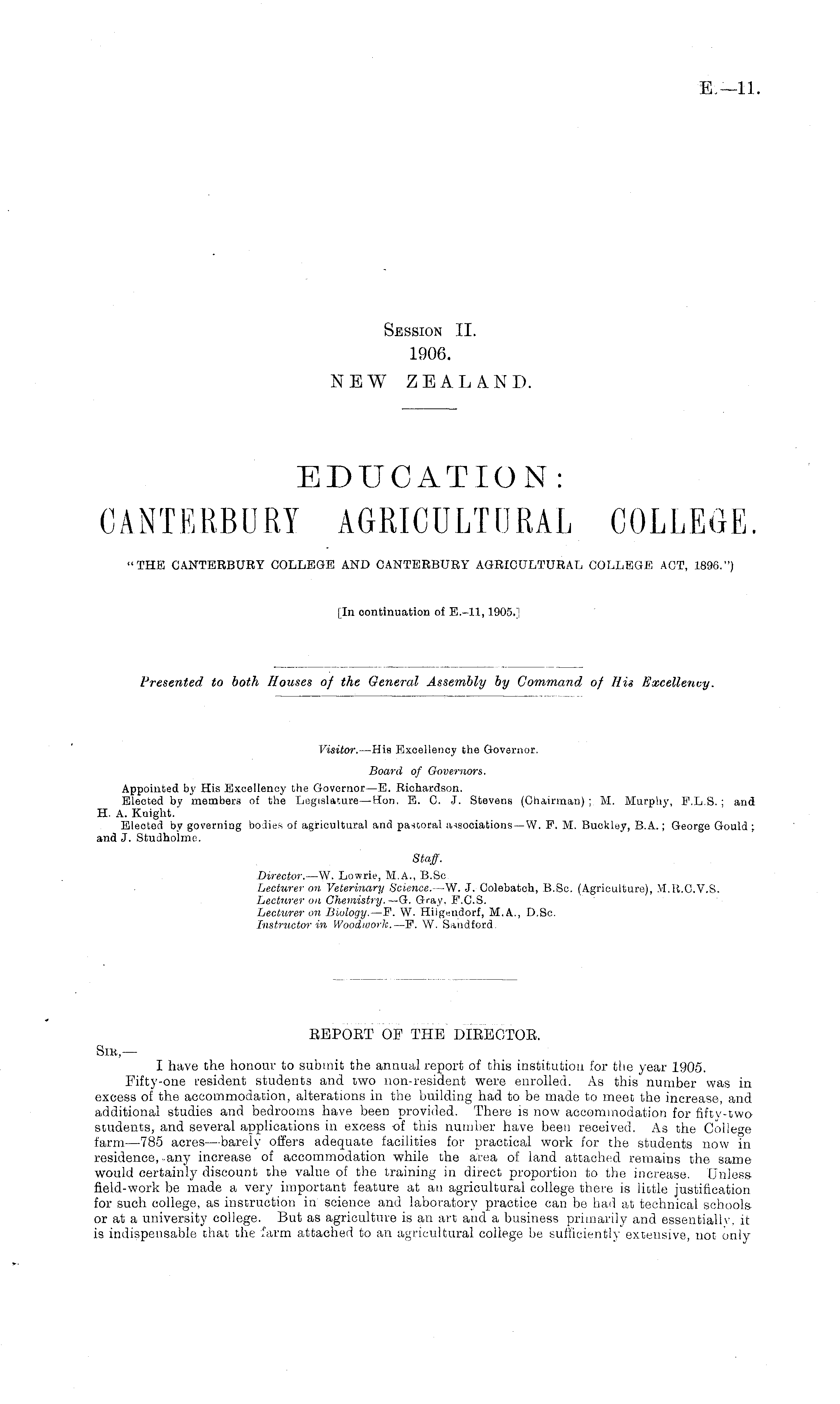 EDUCATION: CANTERBURY AGRICULTURAL COLLEGE. "THE CANTERBURY COLLEGE AND CANTERBURY AGRICULTURAL COLLEGE ACT, 1896.") [In continuation of E.-11, 1905.]