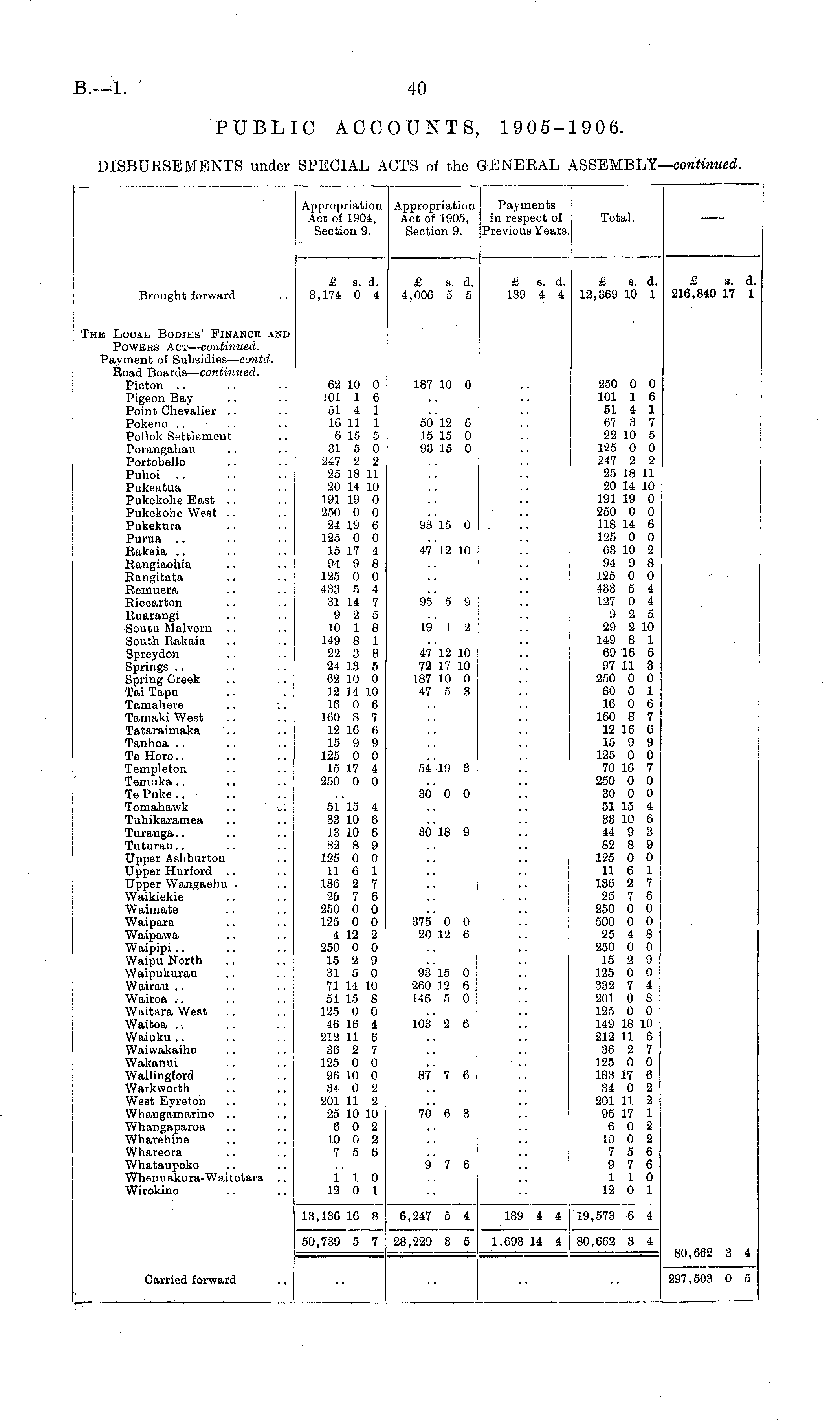 Appropriation Act of 1904, Section 9. Appropriation Act of 1905, Section 9. Payments in respect of Previous Years. Total. Brought forward £ s. d. 8,174 0 4 £ s. d. 4,006 5 5 £ s. d. 189 4 4 £ s. d. 12,369 10 1 £ s. d. 216,840 17 1 'he Local Bodies' Finance and Powers Act— continued. Payment of Subsidies — contd. Road Boards — continued. Picton Pigeon Bay Point Chevalier Pokeno Pollok Settlement Porangahau Portobello Puhoi Pukeatua Pukekohe East Pukekohe West Pukekura Purua Rakaia .. Rangiaohia Rangitata Remuera Ricoarton Ruarangi South Malvern South Rakaia Spreydon Springs Spring Creek Tai Tapu Tamahere Tamaki West Tataraimaka Tauhoa .. Te Horo Templeton Temuka Te Puke Tomahawk Tuhikaramea Turanga.. Tuturau.. Upper Ashburton Upper Hurford Upper Wangaehu . Waikiekie Waimate Waipara Waipawa Waipipi Waipu North Waipukurau Wairau Wairoa Waitara West Waitoa Waiuku Waiwakaiho Wakanui Wallingford Warkworth West Eyreton Whangamarino Whangaparoa Wharehine Whareora Whataupoko Whenuakura-Waitotara .. Wirokino 62 10 0 101 1 6 51 4 1 16 11 1 6 15 5 31 5 0 247 2 2 25 18 11 20 14 10 191 19 0 250 0 0 24 19 6 125 0 0 15 17 4 94 9 8 125 0 0 433 5 4 31 14 7 9 2 5 10 1 8 149 8 1 22 3 8 24 13 5 62 10 0 12 14 10 16 0 6 160 8 7 12 16 6 15 9 9 125 0 0 15 17 i 250 0 0 187 10 0 50 12 6 15 15 0 93 15 0 93 15 0 47 12 10 95 5 9 19 1 2 47 12 10 72 17 10 187 10 0 47 5 3 5<i' 19 3 250 0 0 101 1 6 51 4 1 67 3 7 22 10 5 125 0 0 247 2 2 25 18 11 20 14 10 191 19 0 250 0 0 118 14 6 125 0 0 63 10 2 94 9 8 125 0 0 433 5 4 127 0 4 9 2 5 29 2 10 149 8 1 69 16 6 97 11 3 250 0 0 60 0 1 16 0 6 160 8 7 12 16 6 15 9 9 125 0 0 70 16 7 250 0 0 30 0 0 51 15 4 33 10 6 44 9 3 82 8 9 125 0 0 11 6 1 136 2 7 25 7 6 250 0 0 500 0 0 25 4 8 250 0 0 15 2 9 125 0 0 332 7 4 201 0 8 125 0 0 149 18 10 212 11 6 36 2 7 125 0 0 183 17 6 34 0 2 201 11 2 95 17 1 6 0 2 10 0 2 7 5 6 9 7 6 110 12 0 1 30 0 0 51 15 4 33 10 6 13 10 6 82 8 9 125 0 0 11 6 1 136 2 7 25 7 6 250 0 0 125 0 0 4 12 2 250 0 0 15 2 9 31 5 0 71 14 10 54 15 8 125 0 0 46 16 4 212 11 6 36 2 7 125 0 0 96 10 0 34 0 2 201 11 2 25 10 10 6 0 2 10 0 2 7 5 6 30 18 9 375' 0 0 20 12 6 93 15 0 260 12 6 146 5 0 103 2 6 87 7 6 70 6 3 9 7 6 i' 1 0 12 0 1 13,136 16 8 6,247 5 4 189 4 4 19,573 6 4 Carried forward 50,739 5 7 28,229 3 5 1,693 14 4 80,662 3 4 80,662 3 4 297,503 0 5