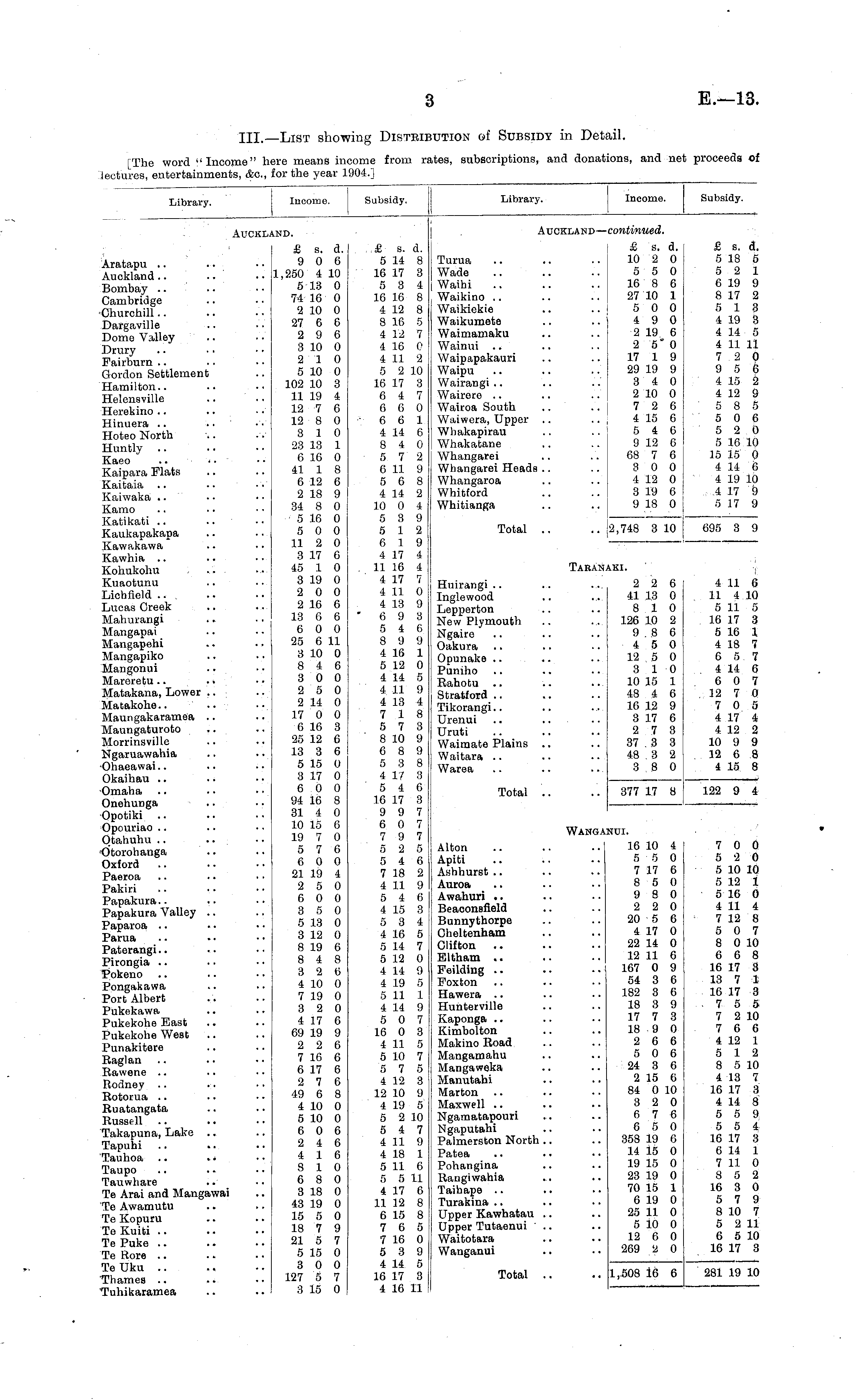 III.—List showing Distribution of Subsidy in Detail. [The word "Income" here means income from rates, subscriptions, and donations, and net proceeds of lectures, entertainments, &c., for the year 1904.]