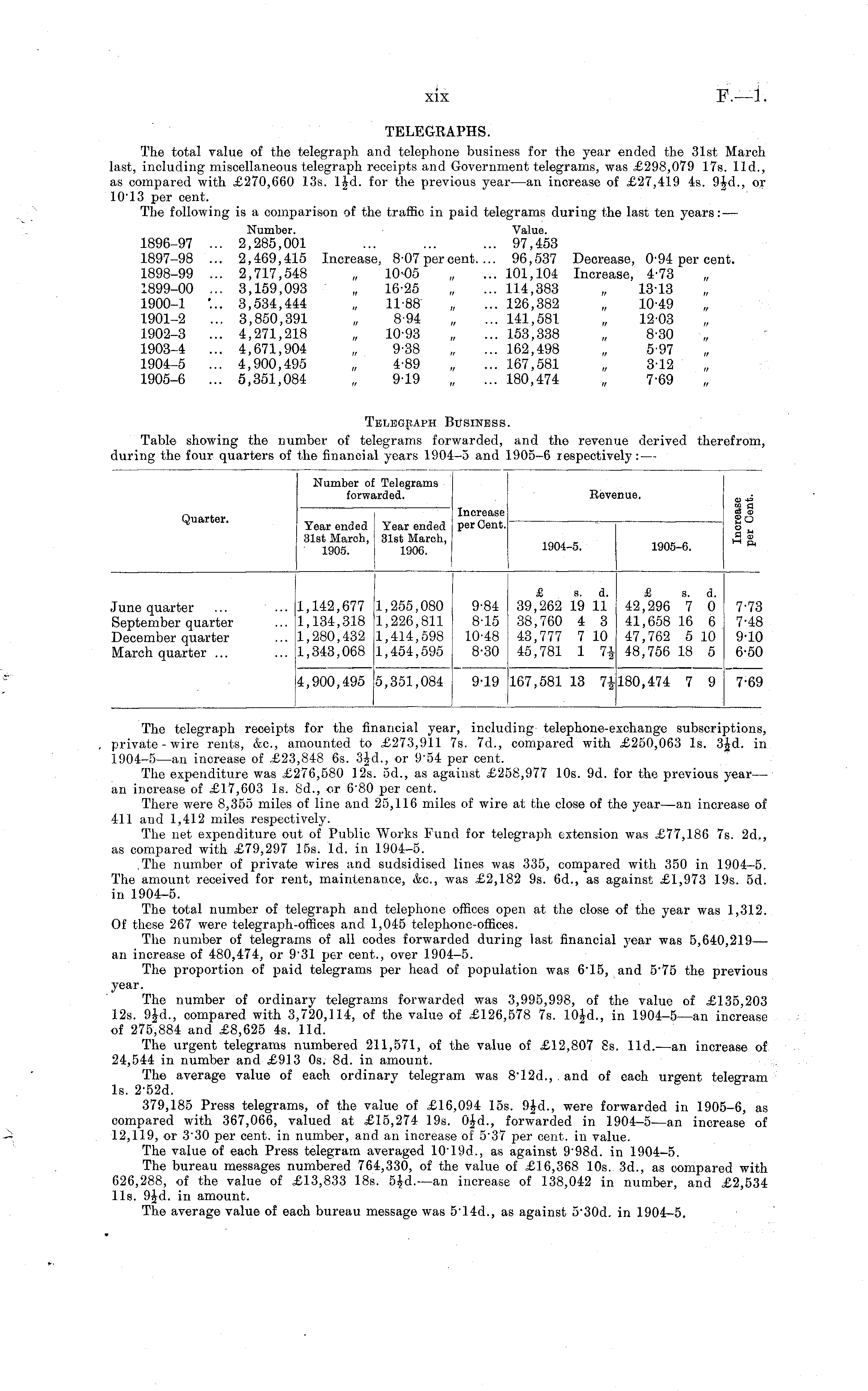 Number of forwa Telegrams irded. Revi snue, Quarter. Increase per Cent. in a co nx 1-1 Ox Year ended 31st March, 1905. Year ended 31st March, 1906. 1904-5. 1905-6. June quarter September quarter December quarter March quarter ... 1,142,677 1,134,318 1,280,432 1,343,068 1,255,080 1,226,811 1,414,598 1,454,595 9-84 8-15 10-48 8-30 £ a. d. 39,262 19 11 38,760 4 3 43,777 7 10 45,781 1 li £ a. d. 42,296 7 0 41,658 16 6 47,762 5 10 48,756 18 5 7-73 7-48 9-10 6-50 4,900,495 5,351,084 9'19 167,581 13 71 2 180,474 7 9 7-69