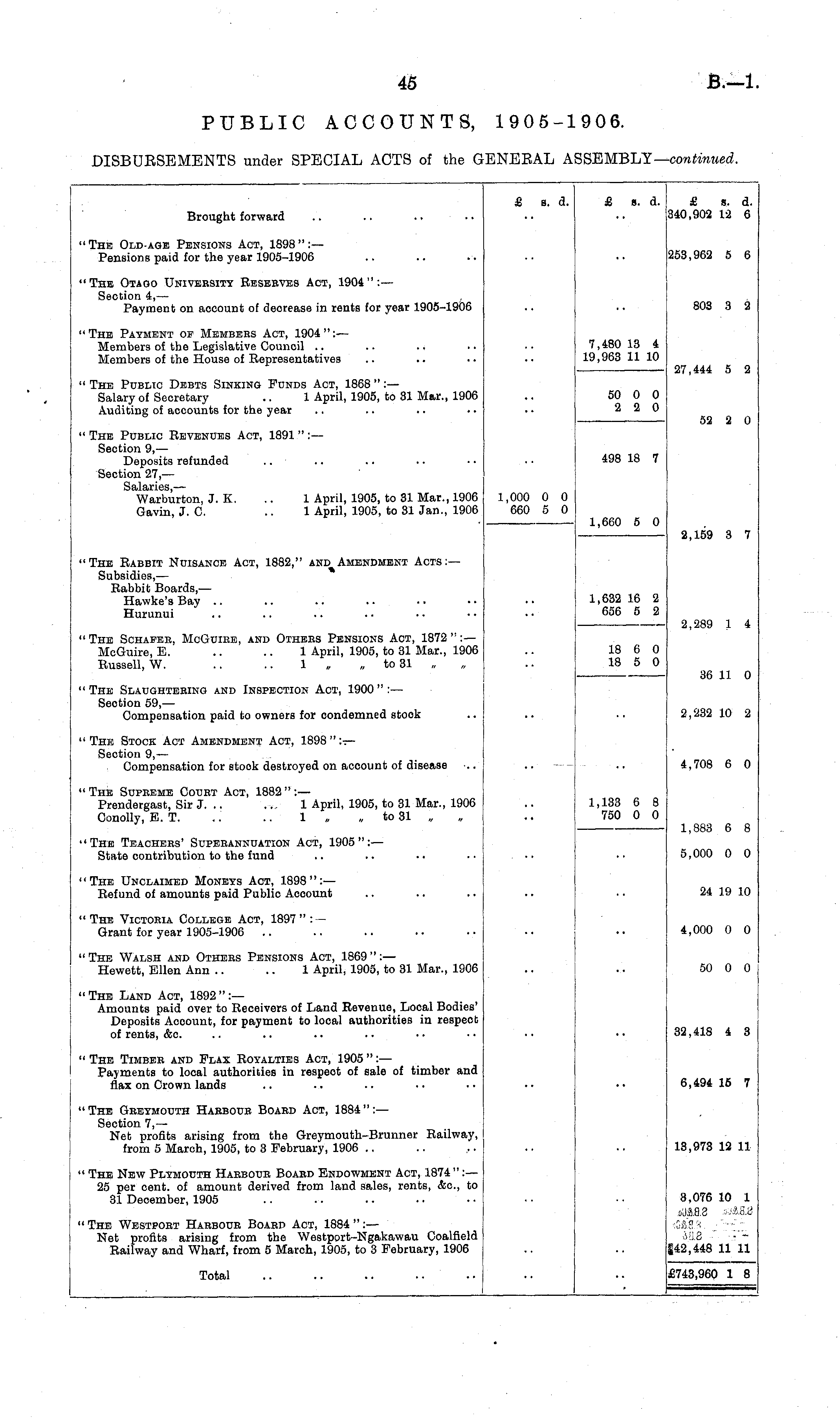 & a. a. £ s. a. £ s. d. 340,902 12 6 Brought forward .. .. .. "The Old-age Pensions Act, 1898": — Pensions paid for the year 1905-1906 253,962 5 6 "The Otago Univebsity Resebves Act, 1904":— Section 4, — Payment on account of decrease in rents for year 1905-1906 803 3 2 " The Payment of Members Act, 1904 ":— Members of the Legislative Council Members of the House of Eepresentatives 7,480 13 4 19,963 11 10 27,444 5 2 " The Publtc Debts Sinking Funds Act, 1868 ":— Salary of Secretary .. 1 April, 1905, to 31 Mar., 1906 Auditing of accounts for the year 50 0 0 2 2 0 52 2 0 " The Public Revenues Act, 1891 " :— Section 9, — Deposits refunded Section 27, — Salaries, — Warburton, J. K. .. 1 April, 1905, to 31 Mar., 1906 Gavin, J. C. .. 1 April, 1905, to 31 Jan., 1906 498 18 7 1,000 0 0 660 5 0 1,660 5 0 2,159 3 7 "The Rabbit Nuisance Act, 1882," and Amendment Acts:— Subsidies, — Rabbit Boards, — Hawke's Bay Hurunui 2,289 1 4 1,632 16 2 656 5 2 " The Schafer, McGuiee, and Othebs Pensions Act, 1872 " :— McGuire, E. .. .. 1 April, 1905, to 31 Mar., 1906 Russell, W. .. .. 1 . „ to 31 , 18 6 0 18 5 0 36 11 0 " The Slaughtebing and Inspection Act, 1900 " :— Seotion 59, — Compensation paid to owners for condemned stook 2,232 10 2 " The Stock Act Amendment Act, 1898 " :— Section 9, — Compensation for stock destroyed on account of disease 4,708 6 0 " The Supeemb Coubt Act, 1882 " :— Prendergast, Sir J. .. ... 1 April, 1905, to 31 Mar., 1906 Conolly, E. T. .. .. 1 „ „ to 31 „ 1,133 6 8 750 0 0 1,883 6 8 "The Teachees' Supeeannuation Act, 1905": — State contribution to the fund 5,000 0 0 "The Unclaimed Moneys Act, 1898": — Refund of amounts paid Public Account 24 19 10 " The Victoeia College Act, 1897" : — Grant for year 1905-1906 4,000 0 0 "The Walsh and Othebs Pensions Act, 1869":— Hewett, Ellen Ann .. .. 1 April, 1905, to 31 Mar., 1906 50 0 0 "The Land Act, 1892":— Amounts paid over to Receivers of Land Revenue, Local Bodies' Deposits Account, for payment to local authorities in respect of rents, &c. 32,418 4 3 " The Timbeb and Flax Royalties Act, 1905 ":— Payments to local authorities in respect of sale of timber and flax on Crown lands 6,494 15 7 " The Gbeymouth Habboue Boaed Act, 1884 ":— Section 7, — Net profits arising from the Greymouth-Brunner Railway, from 5 March, 1905, to 3 February, 1906 .. 13,973 12 11 " The New Plymouth Haeboue Boaed Endowment Act, 1874 " :— 25 per cent, of amount derived from land sales, rents, &c, to 31 December, 1905 3,076 10 1 142,448 11 11 £743,960 1 8 11 The Westpobt Habbode Boabd Act, 1884 " :— Net profits arising from the Westport-Ngakawau Coalfield Railway and Wharf, from 5 March, 1905, to 3 February, 1906 Total