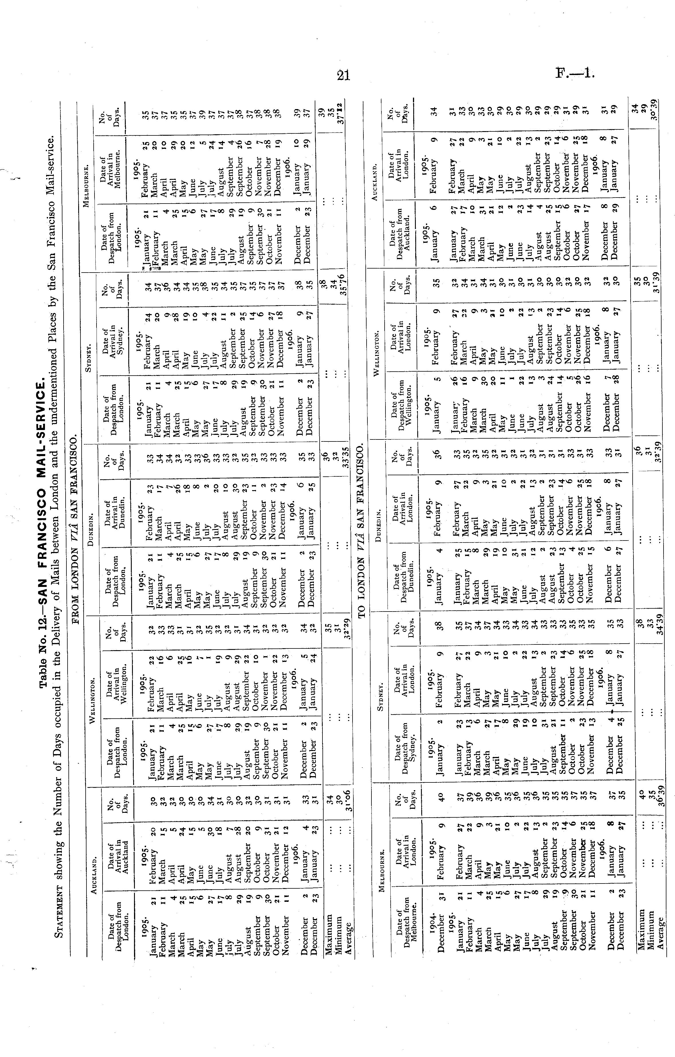 FROM LONDON Vll SAN FRANCISCO. Dunedin. Sydney. Melbourne. Auckland. Wellington. Date of Despatch from London. Date of Arrival in Auckland No. of Days. Date of Despatch from London. Date of Arrival in Wellington. No. of Days. Date of Despatch from London, Date of Arrival in Dunedin. No. of Days. Date of Despatch from London. Date of Arrival in Sydney. No. of Days. Date of Despatch from London. Date of Arrival in Melbourne. No. of Days. ! I , 1905. ~J anuary 2 1 -(February 1 1 March 4 March 25 April 15 May 6 May 27 June 17 July 8 July 29 August 19 September 9 September 30 October 21 November 11 February 25 March 20 April 1 o April 29 May 20 June 12 July 5 July 24 August 14 September 4 September 26 October 16 November 7 November 28 December 19 1906. January 10 January 29 1905. January February March March April May May June July July August September September October November 21 II 4 6 17 8 29 19 9 3° 21 11 1905. February 20 March 15 April 5 April 24 May 15 June 5 June 30 July 18 August 7 August 28 September 20 October 9 October 3 1 November 21 December 12 1906. January 4 January 23 3° 32 3° 3° 3° 34 3 1 3° 3° 32 3° 3' 3' 3 1 1905. January 2 1 February 1 1 March 4 March 25 April 15 May 6 May 27 [une 17 July 8 July 29 August 19 September 9 September 30 October 2 1 November 1 1 1905. February 22 March 16 April 6 April 25 May 16 June 7 July 1 July 19 August 9 August 29 September 22 October 10 November 1 November 22 December 13 1906. January 5 January 24 32 33 33 3i 3' 32 35 32 32 3i 34 3i 32 32 32 1905. January 21 February 11 March 4 March 25 April 15 May 6 May 27 June 17 July 8 July 29 August 19 September 9 September 30 October 2 1 November 11 1905. February 23 March 17 April 7 April 26 May 18 June 8 July 2 July 20 August 10 August 30 September 23 October 1 1 November 2 November 23 December 14 1906. January 6 January 25 33 34 34 32 SS 33 36 33 33 32 35 32 33 33 33 1905. January 21 February 11 March 4 March 25 April 15 May 6 May 27 June 17 July 8 July 29 August 19 September 9 September 30 October 2 1 November 11 1905. February 24 March 20 April 9 April 28 May 19 June 10 July 4 July 22 August 11 September 2 September 25 October 14 November 6 November 27 December 18 1906. January 9 January 27 34 37 36 34 34 35 38 35 34 35 37 35 37 37 37 35 37 37 35 35 37 39 37 37 37 38 37 38 38 38 December December 2 23 33 3' December 2 December 23 34 32 December 2 December 23 35 33 December 2 December 23 38 35 December 2 December 23 39 37 Maximum Minimum Average 34 3° 3 |- ° 6 35 3i 32-29 36 32 33'35 38 34 3576 39 35 37"»2 'O LONDON Vll SAN FRANCISCO. Wellington. Auckland. Melbourne. Sydney. Dunedin. Date of Despatch from Melbourne. Date of Arrival in London. No. of Days. Date of Despatch from Sydney. Date of Arrival in London. No. of Days. Date of Despatch from Dunedin. Date of Arrival in London. 1 No. of Days. Date of Despatch from Wellington. Date of Arrival in London. No. of Days. Date of Despatch from Auckland. Date of Arrival in London. No. of Days. I 1905. February 9 1904. December 3 1 1905. February 9 40 1905. January 2 1905. February 9 38 1905. January 4 1905. February 9 36 1905. January 5 1905. February 9 35 I 9 0 S . January 6 34 1905. January 2 1 February 11 March 4 March 25 April 15 May 6 May 27 June 17 July 8 July 29 August 19 September 9 September 30 October 2 1 November 11 February 27 March 22 April 9 May 3 May 21 June 10 July 2 July 22 August 13 September 2 September 23 October 14 November 6 November 25 December 18 1906. January 8 January 27 37 39 36 39 36 35 36 35 36 35 35 35 37 35 37 January 23 February 13 March 6 March 27 April 17 May 8 May 29 J une 19 July 10 July 3 1 August 21 September 1 1 October 2 October 23 November 13 February 27 March 2 2 April 9 May 3 May 21 June 10 July 2 July 22 August 13 September 2 September 23 October 14 November 6 November 25 December 18 1906. J. January 8 January 27 35 37 34 37 34 33 34 33 34 33 33 33 35 33 35 January 25 j February 15 March 8 March 29 April 19 May 10 May 31 June 2 1 July 12 August 2 August 23 September 13 October 4 October 25 November 15 I February 27 March 22 April 9 May 3 May 21 June 10 July 2 July 22 August 13 September 2 September 23 October 14 November 6 November 25 December 18 1906. January 8 January 27 33 35 32 35 32 3> 32 3' 32 3i 3' 3' 33 3< 33 January 26 February 16 March 9 March 30 April 20 May 11 June 1 June 22 July 13 August 3 August 24 September 14 October 5 October 26 November 16 February 27 March 22 April 9 May 3 May 21 June 1o July 2 July 22 August 13 September 2 September 23 October 14 November 6 November 25 December 18 1906. January 8 January 27 32 34 31 34 3i 3° 31 3° 3 1 3° 3° 3° 32 3° 32 January 27 February 17 March 10 March 3 1 April 2 1 May 12 June 2 June 23 July 14 August 4 August 25 September 15 October 6 October 27 November 17 February 27 March 22 April 9 May 3 May 21 June 10 July 2 July 22 August 13 September 2 September 23 October 14 November 6 November 25 December 18 1906. January 8 January 27 31 33 3° 33 3° 29 3° 29 3° 29 29 29 3i 29 3" December 2 December 23 37 35 December 4 December 25 35 S3 December 6 December 27 33 3i December 7 December 28 32 3° December 8 December 29 3' 29 Maximum Minimum Average 40 35 38 33 34"39 36 : 32-39 35 I 3'"39 34 29 3°'39