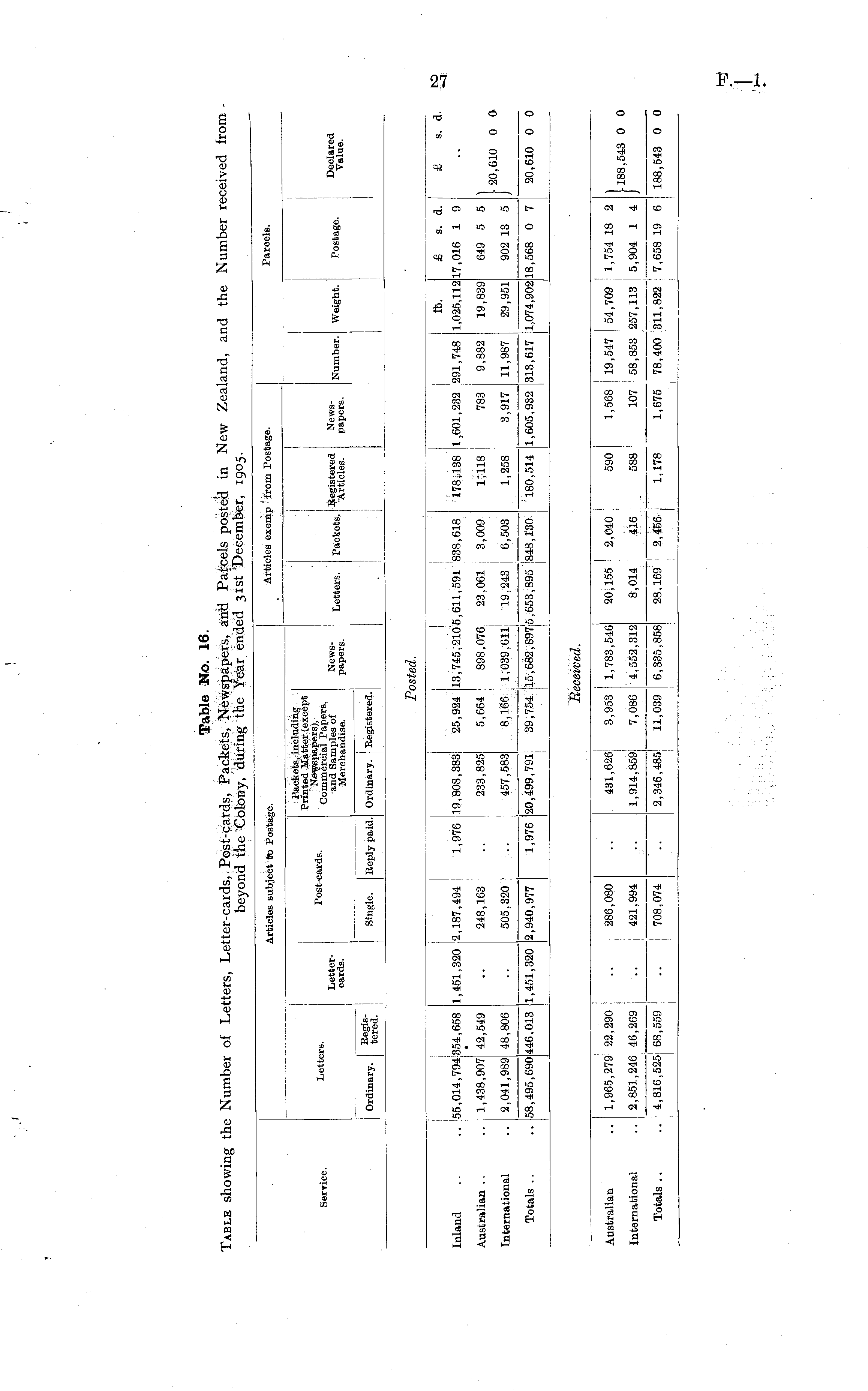 Table No. 16. Table showing the Number of Letters, Letter-cards, Post-cards, Packets, Newspapers, and Parcels posted in New Zealand, and the Number received from beyond the Colony, during the Year ended 31st December, 1905.