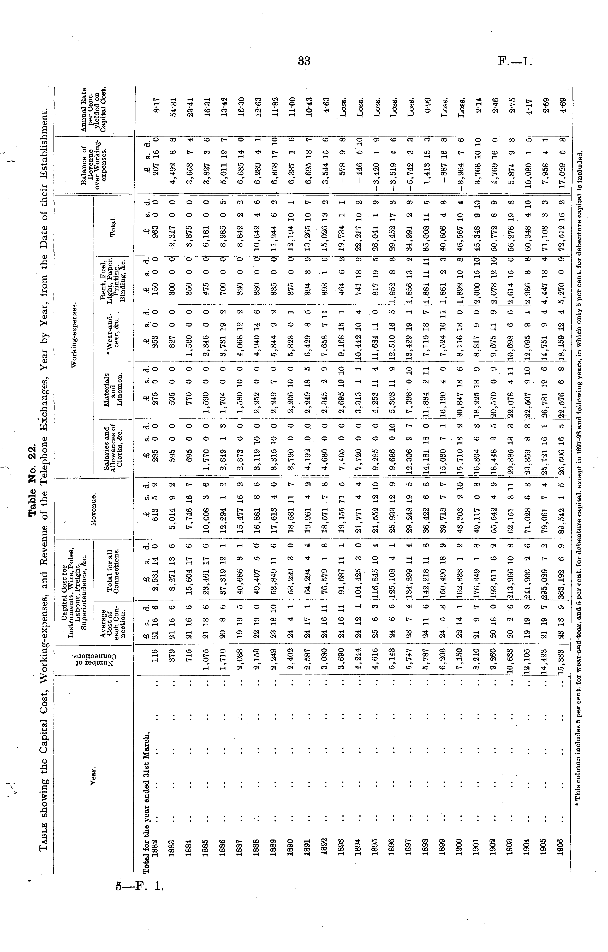 Table No. 22. Table showing the Capital Cost, Working-expenses, and Revenue of the Telephone Exchanges, Year by Year, from the Date of their Establishment.