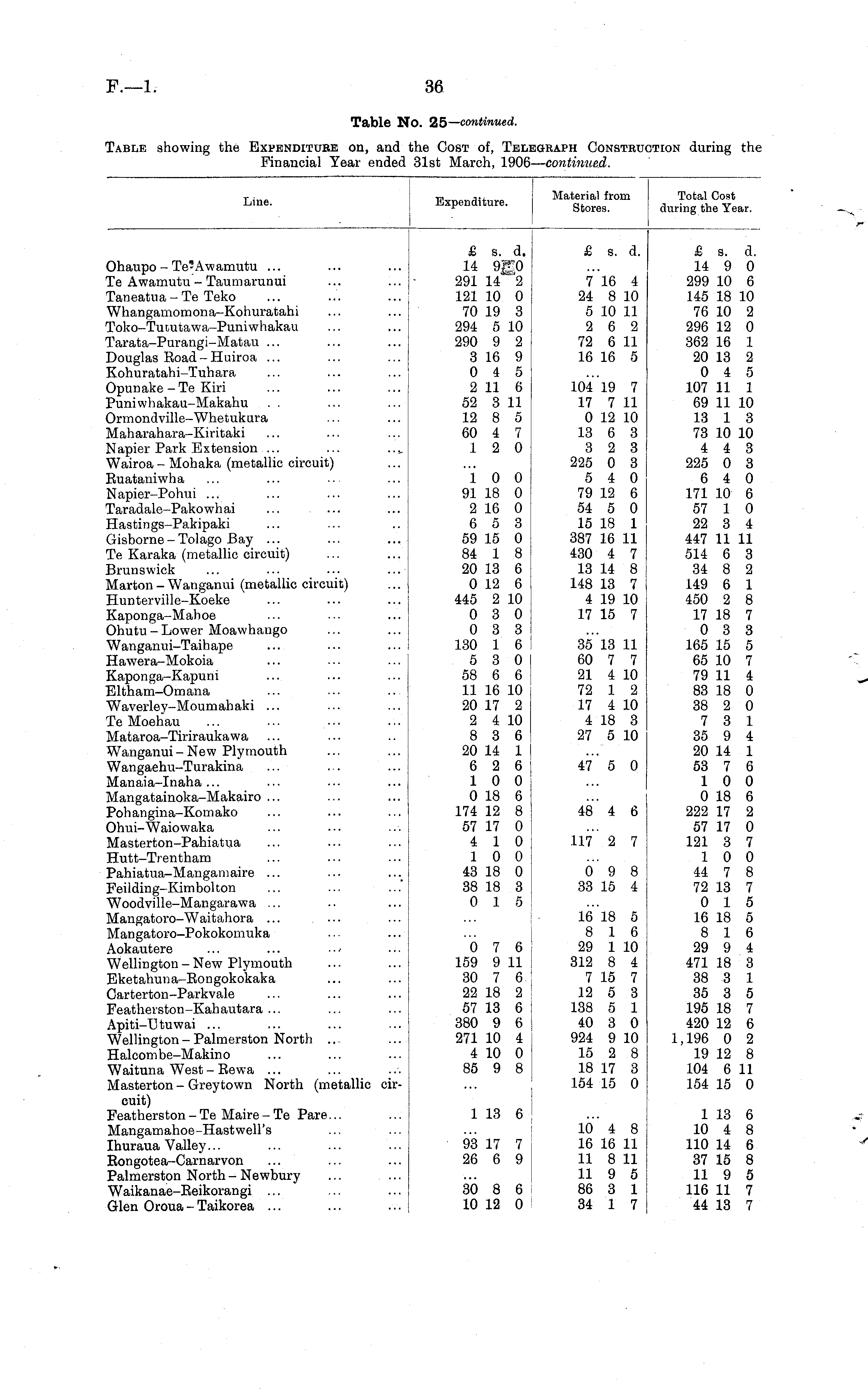 Line. Expenditure. Material from Stores. Total Cost during the Year. Ohaupo - Te'Awamutu ... Te Awamutu - Taumarunui Taneatua - Te Teko Whangamomona-Kohuratahi Toko-Tmutawa-Puniwhakau Tarata-Purangi-Matau ... Douglas Road - Huiroa ... Kohuratahi-Tuhara Opunake - Te Kiri Puni whakau-Makahu Ormondville-Whetukura Maharahara-Kiritaki Napier Park Extension ... Wairoa- Mohaka (metallic circuit) Ruataniwha Napier-Pohui ... Taradale-Pako wh ai Hastin gs-Pakipaki Gisborne - Tolago Bay ... Te Karaka (metallic circuit) Brunswick Marton - Wanganui (metallic circuit) Hunterville-Koeke Kaponga-Mahoe Ohutu-Lower Moawhango Wanganui-Taihape Hawera-Mokoia Kaponga-Kapuni Eltham-Omana Waverley-Moumahaki ... Te Moehau Mataroa-Tiriraukawa Wanganui-New Plymouth Wangaehu-Turakina ... Manaia-Inaha ... Mangatainoka-Makairo ... Pohangina-Komako Ohui-Waiowaka Masterton-Pahiatua Hutt-Trentham Pahiatua-Manganiaire ... Feilding-Kim bol ton Woodville-Mangarawa ... Mangatoro-Waitahora ... Mangatoro-Pokokomuka Aokautere Wellington - New Plymouth Eketahuna-Eongokokaka Garterton-Parkvale Featherston-Kahautara ... Apiti-Utuwai ... Wellington-Palmerston North .... Halcombe-Makino Waituna West - Eewa ... Masterton - Greytown North (metallic circuit) Featherston - Te Maire - Te Pare... Mangamahoe-Hastwell's Ihuraua Valley... Eongotea-Carnarvon Palmerston North - Newbury ... ... Waikanae-Eeikorangi ... Glen Oroua - Taikorea ... £ s. d. 14 9JS0 291 14 *2 121 10 0 70 19 3 294 5 10 290 9 2 3 16 9 0 4 5 2 11 6 52 3 11 12 8 5 60 4 7 12 0 £ S. d. 7 16 4 24 8 10 5 10 11 2 6 2 72 6 11 16 16 5 £ s. d. 14 9 0 299 10 6 145 18 10 76 10 2 296 12 0 362 16 1 20 13 2 0 4 5 107 11 1 69 11 10 13 1 3 73 10 10 4 4 3 225 0 3 6 4 0 171 10 6 57 1 0 22 3 4 447 11 11 514 6 3 34 8 2 149 6 1 450 2 8 17 18 7 0 3 3 165 15 5 65 10 7 79 11 4 83 18 0 38 2 0 7 3 1 35 9 4 20 14 1 53 7 6 10 0 0 18 6 222 17 2 57 17 0 121 3 7 1 0 0 44 7 8 72 13 7 0 15 16 18 5 8 16 29 9 4 471 18 3 38 3 1 35 3 5 195 18 7 420 12 6 1,196 0 2 19 12 8 104 6 11 154 15 0 10 0 91 18 0 2 16 0 6 5 3 59 15 0 84 1 8 20 13 6 0 12 6 445 2 10 0 3 0 0 3 3 130 1 6 5 3 0 58 6 6 11 16 10 20 17 2 2 4 10 8 3 6 20 14 1 6 2 6 10 0 0 18 6 174 12 8 57 17 0 4 10 1 0 0 43 18 0 38 18 3 0 15 104 19 7 17 7 11 0 12 10 13 6 3 3 2 3 225 0 3 5 4 0 79 12 6 54 5 0 15 18 1 387 16 11 430 4 7 13 14 8 148 13 7 4 19 10 17 15 7 35 13 11 60 7 7 21 4 10 72 1 2 17 4 10 4 18 3 27 5 10 47' 5 0 48" 4 6 117 2 7 0 9 8 33 15 4 0 7 6 159 9 11 30 7 6 22 18 2 57 13 6 380 9 6 271 10 4 4 10 0 85 9 8 16 18 5 8 16 29 1 10 312 8 4 7 15 7 12 5 3 138 5 1 40 3 0 924 9 10 15 2 8 18 17 3 154 15 0 1 13 6 10 4 8 16 16 11 11 8 11 11 9 5 86 3 1 34 1 7 1 13 6 10 4 8 110 14 6 37 15 8 11 9 5 116 11 7 44 13 7 93 17 7 26 6 9 30 8 6 10 12 0