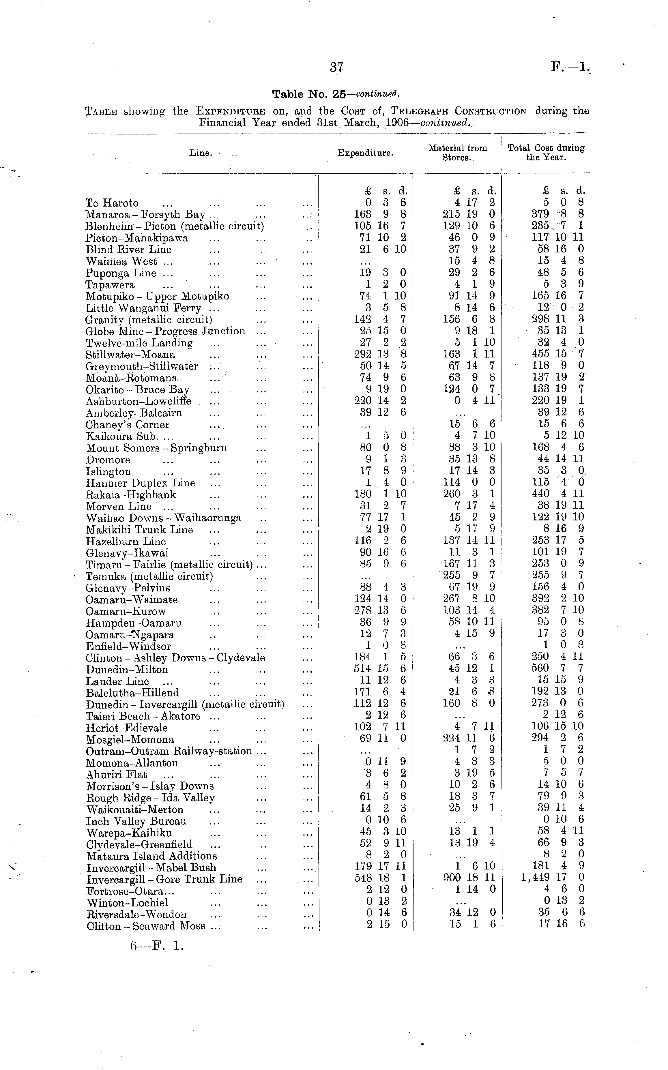 Line. Expenditure. Material from Stores. Total Cost during the Year. Te Haroto Manaroa - Forsyth Bay ... ... Blenheim - Picton (metallic circuit) Picton-Mahakipawa Blind Eiver Line Waimea West ... Puponga Line ... Tapawera Motupiko - U pper Motupiko Little Wanganui Ferry ... Granity (metallic circuit) Globe Mine - Progress Junction ... Twelve-mile Landing ... ... - Stillwater-Moana Greymouth-Stillwater ... Moana-Eotomana ... Okarito - Bruce Bay Ashburton-Lowcliffe Amberley-Balcairn Chaney's Corner ..... Kaikoura Sub. ... Mount Somers - Springburn Dromore Islington ... ... Hanmer Duplex Line Eakaia-Highbank Morven Line ... Waihao Downs - Waihaorunga Makikihi Trunk Line Hazelburn Line Glenavy-Ikawai Timaru - Fairlie (metallic circuit) ... Temuka (metallic circuit) Glenavy-Pelvins Oamaru-Waimate Oamaru-Kurow Hampden-Oamaru Oamaru-Ngapara Enfield-Windsor Clinton - Ashley Downs - Clydevale Dunedin-Milton Lauder Line Balclutha-Hillend Dunedin - Invercargill (metallic circuit) Taieri Beach - Akatore ... Heriot-Edievale Mosgiel-Momona Outram-Outram Eailway-station ... Momona-Allan ton Ahuriri Flat Morrison's-Islay Downs Eough Eidge - Ida Valley Waikouaiti-Merton Inch Valley Bureau Warepa-Kaihiku Clydevale-Greenfield Mataura Island Additions Invercargill - Mabel Bush Invercargill - Gore Trunk Line Fortrose-Otara... Winton-Lochiel Eiversdale -Wendon Clifton - Seaward Moss ... £ s. d. 0 3 6 163 9 8 105 16 7 71 10 2 21 6 10 ! 19 3 0 12 0 74 1 10 3 5 8 142 4 7 26 15 0 27 2 2 292 13 8 50 14 5 74 9 6 9 19 0 220 14 2 39 12 6 "l 5 0 80 0 8 9 13 17 8 9 14 0 180 1 10 31 2 7 77 17 1 2 19 0 116 2 6 90 16 6 85 9 6 88 4 3 124 14 0 278 13 6 36 9 9 12 7 3 1 0 8 184 1 5 514 15 6 11 12 6 171 6 4 112 12 6 2 12 6 102 7 11 69 11 0 "6 11 9 3 6 2 4 8 0 61 5 8 14 2 3 0 10 6 45 3 10 52 9 11 8 2 0 179 17 11 548 18 1 2 12 0 0 13 2 0 14 6 2 15 0 £ s. d. 4 17 2 215 19 0 129 10 6 46 0 9 37 9 2 15 4 8 29 2 6 4 19 91 14 9 8 14 6 156 6 8 9 18 1 5 1 10 163 1 11 67 14 7 63 9 8 124 0 7 0 4 11 15 6 6 4 7 10 88 3 10 35 13 8 17 14 3 114 0 0 260 3 1 7 17 4 45 2 9 5 17 9 137 14 11 11 3 1 167 11 3 255 9 7 67 19 9 267 8 10 103 14 4 58 10 11 4 15 9 66 3 6 45 12 1 4 3 3 21 6 8 160 8 0 4 7 11 224 11 6 17 2 4 8 3 3 19 5 10 2 6 18 3 7 25 9 1 13" 1 1 13 19 4 1 6 10 900 18 11 1 14 0 3412 0 15 1 6 £ S. d. 5 0 8 379 8 8 235 7 1 117 10 11 58 16 0 15 4 8 48 5 6 5 3 9 165 16 7 12 0 2 298 11 3 35 13 1 32 4 0 455 15 7 118 9 0 137 19 2 133 19 7 220 19 1 39 12 6 15 6 6 5 12 10 168 4 6 44 14 11 35 3 0 115 4 0 440 4 11 38 19 11 122 19 10 8 16 9 253 17 5 101 19 7 253 0 9 255 9 7 156 4 0 392 2 10 382 7 10 95 0 8 17 3 0 10 8 250 4 11 560 7 7 15 15 9 192 13 0 273 0 6 2 12 6 106 15 10 294 2 6 17 2 5 0 0 7 5 7 14 10 6 79 9 3 39 11 4 0 10 6 58 4 11 66 9 3 8 2 0 181 4 9 1,449 17 0 4 6 0 0 13 2 35 6 6 17 16 6