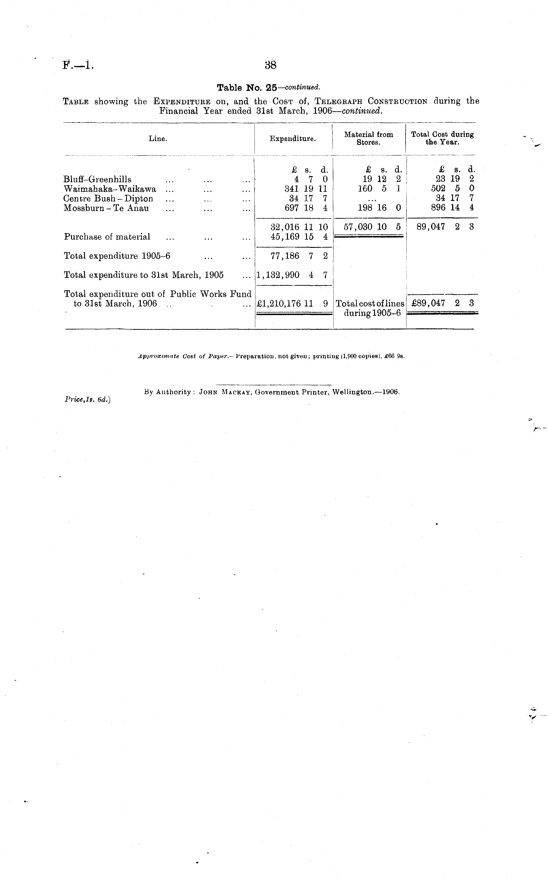 Line. i Expenditure. Material from Stores. Total Cost during the Year. Bluff-Greenhills Waimahaka-Waikawa ... Centre Bush - Dipton Mossburn - Te Anau £ s. d. 4 7 0 341 19 11 34 17 7 697 18 4 £ S. d. 19 12 2 160 5 1 £ 8. d. 23 19 2 502 5 0 34 17 7 896 14 4 198 16 0 Purchase of material 32,016 11 10 45,169 15 4 57,030 10 5 89,047 2 8 Total expenditure 1905-6 77,186 7 2 Total expenditure to 31st March, 1905 1,132,990 4 7 Total expenditure out of Public Works Fund to 31st March, 1906 ... £1,210,176 11 9 Total cost of lines during 1905-6 £89,047 2 3