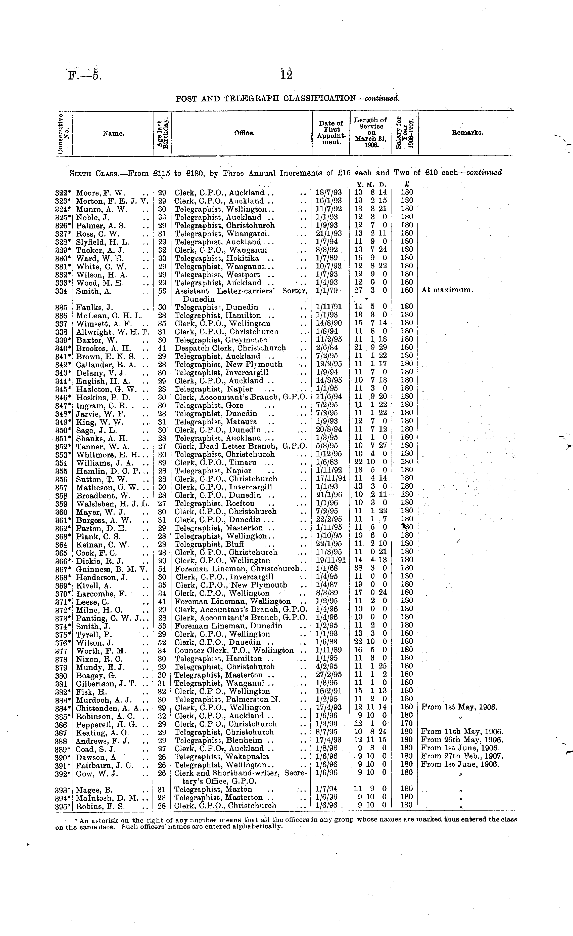 ► Id s* a o 3 Name. "8 «? 03 T3 ■"5 Office. Date of First Appointment. Length of g t Service *; g g on u ©7 March 31, ,3J«g 1906. $ S Remarks. Iixth Class.—From S115 to £180, by Three Annual Increme mts of £1! each and Two ol £10 each— continued 122* 123* 124* 525* 126* S27* 128* 129* S30* S31* 132* S33* S34 Moore, F. W. Morton, F. E. J. V. Munro, A. W. Noble, J. Palmer, A. S. Ross, C. W. Slyfield, H. L. Tucker, A. J. Ward, W. E. White, C. W. Wilson, H. A. Wood, M. E. Smith, A. 29 29 30 33 29 31 29 32 33 29 29 29 53 Clerk, C.P.O., Auckland Clerk, C.P.O., Auckland .. Telegraphist, Wellington.. :.. Telegraphist, Auckland Telegraphist, Christohurch Telegraphist, Whangarei. Telegraphist, Auckland Clerk, C.P.O., Wanganui Telegraphist, Hokitika Telegraphist, Wanganui Telegraphist, Westport Telegraphist, Auckland Assistant Letter-carriers' Sorter, Dunedin Telegraphist Dunedin Telegraphist, Hamilton ... Clerk, C.P.O., Wellington Clerk, C.P.O., Christohurch Telegraphist, Greymouth Despatch Clerk, Christchurch Telegraphist, Auckland Telegraphist, New Plymouth Telegraphist, Invercargill Clerk, C.P.O., Auckland Telegraphist, Napier Clerk, Accountant's Branch, G.P.O. Telegraphist, Gore Telegraphist, Dunedin Telegraphist, Mataura Clerk, C.P.O., Dunedin ... Telegraphist, Auckland ... Clerk, Dead Letter Branch, G.P.O. Telegraphist, Christchurch Clerk, G.P.O., Timaru ... Telegraphist, Napier Clerk, C.P.O., Christchuroh Clerk, C.P.O., Invercargill Clerk, C.P.O., Dunedin Telegraphist, Reefton Clark, C.P.O., Christchurch Clerk, C.P.O., Dunedin Telegraphist, Masterton Telegraphist, Wellington Telegraphist, Bluff Clerk, O.P.O., Christchurch Clerk, C.P.O., Wellington Foreman Lineman, Christchurch.. Clerk, C.P.O., Invercargill Clerk, C.P.O., New Plymouth Clerk, C.P.O., Wellington Foreman Lineman, Wellington .. Clerk, Accountant's Branoh, G.P.O. Clerk, Accountant's Branch, G.P.O. Foreman Lineman, Dunedin Clerk, C.P.O., Wellington Clerk, C.P.O., Dunedin .. Counter Clerk, T.O., Wellington .. Telegraphist, Hamilton .. Telegraphist, Christohurch Telegraphist, Masterton Telegraphist, Wanganui .. ... Clerk, C.P.O., Wellington Telegraphist, Palmerston N. Clerk, C.P.O., Wellington Clerk, C.P.O., Auckland .. Clerk, C.P.O., Christohurch Telegraphist, Christchuroh Telegraphist, Blenheim Clerk, C.P.Of, Auckland Telegraphist, Wakapuaka Telegraphist, Wellington.. Clerk and Shorthand-writer, Secretary's Office, G.P.O. Telegraphist, Marton Telegraphist, Masterton Clerk, C.P.O., Christchuroh 18/7/93 16/1/93 11/7/92 1/1/93 1/9/93 21/1/93 1/7/94 8/8/92 1/7/89 10/7/93 1/7/93 1/4/93 1/1/79 Y. M. D. 13 8 14 13 2 15 13 8 21 12 3 0 12 7 0 13 2 11 11 9 0 13 7 24 16 9 0 12 8 22 12 9 0 12 0 0 27 3 0 £ 180 180 180 180 180 180 180 180 180 180 180 180 160 At maximum. )35 )36 137 J38 139* 540* 141* !42* S43* 144* !45* 146* 147* 148* J49* 150* 151* 152* S53* )54 )55 156 S57 158 S59 )60 161* •62* 163* 164 J65 S66* 567* S68* 169* S70* 171* !72* 173* 174* 175* 176* 177 S78 179 !80 181 182* )83* 184* 185* 186 S87 188 189* 190* 191* S92* Faulks, J. McLean, 0. H. L. Wimsett, A. F. Allwright, W. H. T. Baxter, W. Brookes, A. H. Brown, E. N. S. Callander, R. A. Delany, V. J. English, H. A. Hazleton, G. W. Hoskins, P. D. Ingram, C. R. . Jarvie, W. F. King, W. W. Sage, J. L. Shanks, A. H. Tanner, W. A. Whitmore, E. H. .. Williams, J. A. Hamlin, D. C. P. .. Sutton, T. W. Matheson, C. W. Broadbent, W. Walsleben, H. J. L. Mayer, W. J. Burgess, A. W. Parton, D. E. Plank, C. S. Keinan, C. W. Cook, F. C. Dickie, R. J. Guinness, B. M. V. Henderson, J. Kivell, A. Larcombe, F. Leese, C. Milne, H. C. Panting, C. W.J... Smith, J. Tyrell, P. Wilson, J. Worth, F. M. Nixon, R. C. Mundy, E. J. Boagey, G. Gilbertson, J. T. Fisk, H. Murdoch, A. J. Chittenden, A. A... Robinson, A. C. Pepperell, H. G. .. Keating, A. 0. Andrews, F.J. Coad, S. J. Dawson, A, Fairbairn, J. C. Gow, W. J. 30 28 35 31 30 41 29 28 30 29 28 30 30 28 31 30 28 27 30 39 28 28 30 28 27 30 31 29 28 28 28 29 54 30 35 34 41 29 28 53 29 52 34 30 29 30 31 32 30 29 32 29 29 29 27 26 26 26 1/11/91 1/1/93 14/8/90 1/8/94 11/2/95 2/6/84 7/2/95 12/2/95 1/9/94 14/8/95 1/1/95 11/6/94 7/2/95 7/2/95 1/9/93 20/8/94 1/3/95 5/8/95 1/12/95 1/6/83 1/11/92 17/11/94 1/1/93 21/1/96 1/1/96 7/2/95 22/2/95 1/11/95 1/10/95 22/1/95 11/3/95 19/11/91 1/1/68 1/4/95 1/4/87 8/3/89 1/2/95 1/4/96 1/4/96 1/2/95 1/1/93 1/6/83 1/11/89 1/1/95 4/2/95 27/2/95 1/3/95 16/2/91 1/2/95 17/4/93 1/6/96 1/3/93 8/7/95 17/4/93 1/8/96 1/6/96 1/6/96 1/6/96 14 5 0 13 3 0 15 7 14 11 8 0 11 1 18 21 9 29 11 1 22 11 1 17 11 7 0 10 7 18 11 3 0 11 9 20 11 1 22 11 1 22 12 7 0 11 7 12 11 1 0 10 7 27 10 4 0 22 10 0 13 5 0 11 4 14 13 3 0 10 2 11 10 3 0 11 1 22 11 1 7 11 5 0 10 6 0 11 2 10 11 0 21 14 4 13 38 3 0 11 0 0 19 0 0 17 0 24 II 2 0 10 0 0 10 0 0 11 2 0 13 3 0 22 10 0 16 5 0 11 3 0 11 1 25 11 1 2 11 1 0 15 1 13 11 2 0 12 11 14 9 10 0 12 1 0 10 8 24 12 11 15 9 8 0 9 10 0 9 10 0 9 10 0 180 180 180 180 180 180 180 180 180 180 180 180 180 180 180 180 180 180 180 180 180 180 180 180 180 180 180 *80 180 180 180 180 180 ISO 180 180 180 180 180 180 180 180 180 180 180 180 180 180 180 180 180 170 180 180 180 180 180 180 From 1st May, 1906. From 11th May, 1906. From 26th May, 1906. From 1st June, 1906. From 27th Feb., 1907. From 1st June, 1906. 193* 194* 195* Magee, B. Mcintosh, D. M. .. Robins, F. S. .. 31 28 28 1/7/94 1/6/96 1/6/96 11 9 0 9 10 0 9 10 0 180 180 180 * An asterisk on the right of any number means that all the officers in any group whose names are ie same date. Such officers' names are entered alphabetically. larked thus entered the clasi >n i!