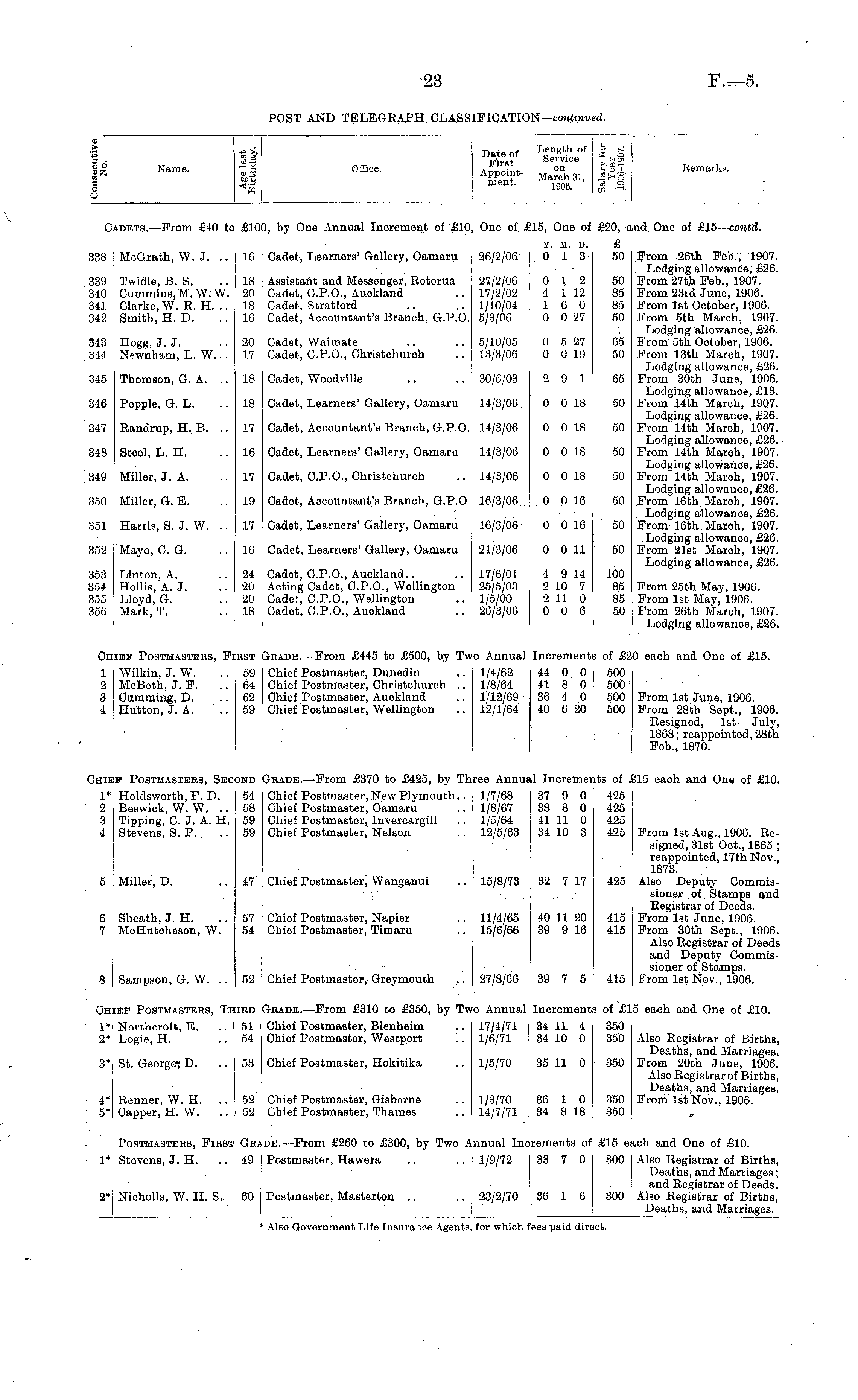 9 > Sd a o o Name. +> ►, tan "a Office. Date of L ,? n S th of I ES Svcf Service .as on &§! Remarks. Appoint- March31 s^g ment - 1906. £ 3 c. Cadets. —From £40 to £100, by One Annual Increment of £10, £1( , One of £15, One of One of £15, One of £20, and One of £15— contd. *. ** T. O £20, i £ 50 338 18 McGrath, W.J. .. 16 Cadet, Learners' Gallery, Oamaru 16 y. m. d. 26/2/06 0 13 Y. M. D. £ 26/2/06 0 13 50 From 26th Feb., 1907. Lodging allowance, £26. 27/2/06 0 12 50 From 27th Feb., 1907. 17/2/02 4 1 12 85 From 23rd June, 1906. 1/10/04 16 0 85 From 1st October, 1906. 5/3/06 0 0 27 50 From 5th Maroh, 1907. Lodging allowance, £26. 5/10/05 0 5 27 65 From 5th October, 1906. 13/3/06 0 0 19 50 From 13th March, 1907. Lodging allowanoe, £26. 30/6/03 2 9 1 65 From 30th June, 1906. Lodging allowance, £13. 14/3/06 0 0 18 50 From 14th March, 1907. Lodging allowance, £26. 14/3/06 0 0 18 50 From 14th March, 1907. Lodging allowance, £26. 14/3/06 0 0 18 50 From 14th March, 1907. Lodging allowance, £26. 14/3/06 0 0 18 50 From 14th Maroh, 1907. Lodging allowance, £26. 16/3/06 0 0 16 50 From 16th March, 1907. Lodging allowance, £26. 16/3/06 0 0 16 50 From 16th March, 1907. Lodging allowance, £26. 21/3/06 0 0 11 50 From 21st March, 1907. Lodging allowance, £26. 17/6/01 4 9 14 100 339 340 341 342 19 Twidle, B. S. 10 Cummins, M. W. W. 11 Clarke, W. R. H. .. 12 Smith, H. D. 18 Assistant and Messenger, Rotorua 20 Cadet, C.P.O., Auckland 18 Cadet, Stratford 16 Cadet, Accountant's Branch, G.P.O. L8 20 18 10 27/2/06 0 12 17/2/02 4 1 12 1/10/04 16 0 5/3/06 0 0 27 50 85 85 50 343 344 13 Hogg, J. J. 14 Newnham, L. W... 20 Cadet, Waimate 17 Cadet, O.P.O., Christchurch 20 17 5/10/05 0 5 27 13/3/06 0 0 19 65 50 345 15 Thomson, G. A. 18 Cadet, Woodville 18 30/6/03 2 9 1 65 346 16 Popple, G. L. 18 Cadet, Learners' Gallery, Oamaru 18 14/3/06 0 0 18 50 347 17 Randrup, H. B. 17 Cadet, Accountant's Branch, G.P.O. 17 14/3/06 0 0 18 50 348 18 Steel, L. H. 16 Cadet, Learners' Gallery, Oamaru 16 14/3/06 0 0 18 50 349 19 Miller, J. A. 17 Cadet, C.P.O., Christohurch 17 14/3/06 0 0 18 50 350 50 Miller, G. E. 19 Cadet, Accountant's Branch, G.P.O 19 16/3/06 0 0 16 50 351 il Harris, S. J. W. 17 Cadet, Learners' Gallery, Oamaru 17 16/3/06 0 0 16 50 352 52 Mayo, C. G. 16 Cadet, Learners' Gallery, Oamaru 16 21/3/06 0 0 11 50 353 354 355 356 53 Linton, A. 54 Hollis, A. J. 55 Lloyd, G. 56 Mark, T. 24 Cadet, C.P.O., Auckland.. 20 Acting Cadet, C.P.O., Wellington 20 Cader, C.P.O., Wellington 18 Cadet, C.P.O., Auokland 24 20 20 18 17/6/01 4 9 14 25/5/03 2 10 7 1/5/00 2 11 0 26/3/06 0 0 6 iy/o/ui a » 14 iuu 25/5/03 2 10 7 85 From 25th May, 1906. 1/5/00 2 11 0 85 From 1st May, 1906. 26/3/06 0 0 6 50 From 26th Maroh, 1907. Lodging allowance, £26. 100 85 85 50 Chief Postmasters, Fi rst Grade. —From £445 to £500, by Tw r o Annual Increment! i Annual Increments of £20 each and One of £15. 3 of £S Oi RST 1 Wilkin, J. W. 2 McBeth, J. F. 3 Cumming, D. 4 Hutton, J. A. 1 2 3 4 59 Chief Postmaster, Dunedin 64 Chief Postmaster, Christchurch .. 62 Chief Postmaster, Auckland 59 Ohief Postmaster, Wellington 59 64 62 59 1/4/62 44 0 0 1/8/64 41 8 0 1/12/69 36 4 0 12/1/64 40 6 20 1/4/62 44 0 0 500 ) 1/8/04 41 8 U OUU 1/12/69 36 4 0 500 From 1st June, 1906. 12/1/64 40 6 20 500 From 28th Sept., 1906. Resigned, 1st July, 1868; reappointed, 28th Feb., 1870. 500 500 500 500 Chii 1* 2 3 4 hief Postmasters, Seci 1* Holdsworth.F. D. 2 Beswiok, W. W. 3 Tipping, C. J. A. H. 4 Stevens, S. P. ond Grade.—From £370 to £425, by Thi 54 Chief Postmaster, New Plymouth.. 58 Chief Postmaster, Oamaru 59 Chief Postmaster, Invercargill 59 Chief Postmaster, Nelson iND 54 58 59 59 ree Annual Incremer 1/7/68 37 9 0 1/8/67 38 8 0 1/5/64 41 11 0 12/5/63 34 10 3 ee Annual Increments of £15 eaoh and One of £10. 1/7/68 37 9 0 425 1/8/67 38 8 0 425 its of 425 425 425 425 5 Miller, D. 6 Sheath, J. H. 7 MoHutoheson, W. 47 Chief Postmaster, Wanganui 47 15/8/73 32 7 17 1/5/64 41 11 0 425 12/5/63 34 10 3 425 From 1st Aug., 1906. Resigned, 31st Oct., 1865 ; reappointed, 17th Nov., 1873. 15/8/73 32 7 17 425 Also Deputy Commissioner of Stamps and Registrar of Deeds. 11/4/65 40 11 20 415 From 1st June, 1906. 15/6/66 39 9 16 415 From 30th Sept., 1906. Also Registrar of Deeds and Deputy Commissioner of Stamps. 27/8/66 39 7 5 415 From 1st Nov., 1906. 425 415 415 6 7 57 Chief Postmaster, Napier 54 Chief Postmaster, Timaru 57 54 11/4/65 40 11 20 15/6/66 39 9 16 8 Sampson, G. W. .. 52 | Chief Postmaster, Greymouth 27/8/66 39 7 5 415 8 Git Ohief Postmasters, Th [IRD Grade.—From £310 to £350, by Tw 'o Annual Inorementi i Annual Increments of £15 each and One of £10. 1 H IA 111 OA 11 A OKC\ s of £1 1* 2* 1* Northcroft, E. 2* Logie, H. 51 Chief Postmaster, Blenheim 54 Chief Postmaster, Westport 17/4/71 34 11 4 1/6/71 34 10 0 17/4/71 34 11 4 350 1/6/71 34 10 0 350 Also Registrar of Births, Deaths, and Marriages. 1/5/70 35 11 0 350 From 20th June, 1906. Also Registrar of Births, Deaths, and Marriages. 1/3/70 36 10 350 From 1st Nov., 1906. 1 A mini Q,1 Q 1 Q QKfl 350 350 3* 3* St. George; D. 53 Chief Postmaster, Hokitika 1/5/70 35 11 0 350 4* 5* 4* Renner, W. H. 5* Capper, H. W. 52 Chief Postmaster, Gisborne 52 Chief Postmaster, Thames 52 52 1/3/70 36 10 14/7/71 34 8 18 350 350 14/7/71 34 8 18 350 Postmasters, First Grade.—From £260 to £300, by Two A: Gr. .nnual Increments of mual Increments of £15 each and One of £10. £15 ei 1* Stevens, J. H. ..I 2* Nicholls, W. H. S. 49 Postmaster, Hawera 49 1/9/72 33 7 0 1/9/72 33 7 0 300 Also Registrar of Births, Deaths, and Marriages; and Registrar of Deeds. 23/2/70 36 1 6 300 Also Registrar of Births, Deaths, and Marriages. 300 60 Postmaster, Masterton 23/2/70 36 1 6 300 60 * Also Government Life Insurance Agents, for which fees paid direct.
