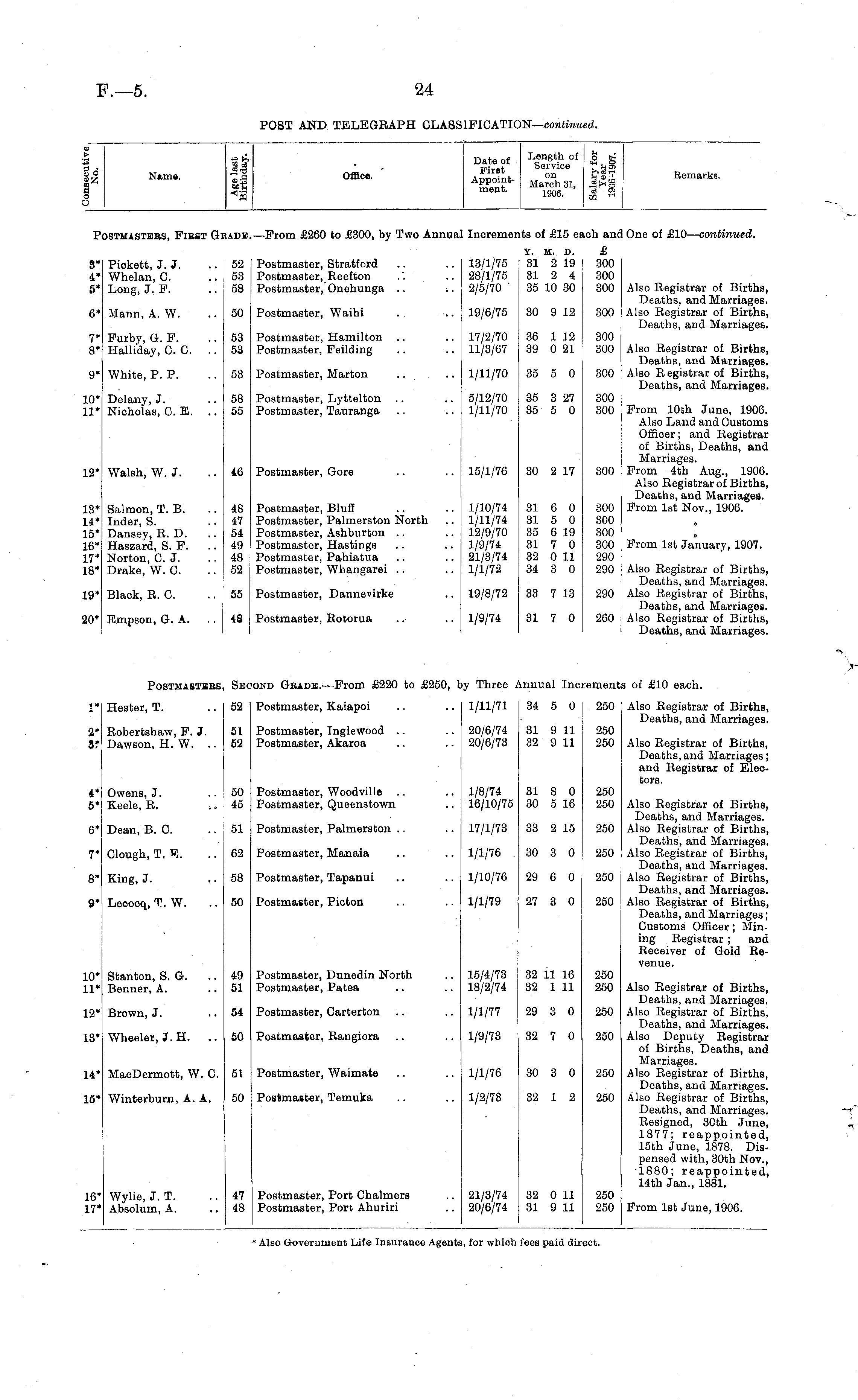 .5 So a o o Name. ■» ►> • 5 tan Office. Date of First Appointment. Length of o Service *n§ on &SV March 31, A I" § 1906. ,g 3 Remarks. P. iSTMASTERS, FIRST Gl ;ADE —From £260 to £300, by Two Annual I Increments of £15 ei Inoreme: ,ch ani One of £10 — continued. 3* 4* 5* Piokett, J.J. Whelan, C. Long, J. F. 52 53 58 Postmaster, Stratford Postmaster, Reefton Postmaster, Onehunga Y. M. D. 13/1/75 31 2 19 28/1/75 31 2 4 2/5/70 ' 35 10 30 13/1/75 28/1/75 2/5/70 ' £ 300 300 300 Also Registrar of Births, Deaths, and Marriages. Also Registrar of Births, Deaths, and Marriages. 6* Mann, A. W. 50 Postmaster, Waihi . , 19/6/75 30 9 12 19/6/75 300 7* 8* Furby, G. F. Halliday, C. C. 53 53 Postmaster, Hamilton Postmaster, Feilding 17/2/70 36 1 12 11/3/67 39 0 21 17/2/70 11/3/67 300 300 Also Registrar of Births, Deaths, and Marriages. Also Registrar of Births, Deaths, and Marriages. 9* White, P. P. 53 Postmaster, Marton 1/11/70 35 5 0 1/11/70 300 10* 11* Delany, J. Nicholas, C. E. .. 58 55 Postmaster, Lyttelton Postmaster, Tauranga 5/12/70 35 3 27 1/11/70 35 5 0 5/12/70 1/11/70 300 300 From 10th June, 1906. Also Land and Customs Officer; and Registrar of Births, Deaths, and Marriages. From 4th Aug., 1906. Also Registrar of Births, Deaths, and Marriages. From 1st Nov., 1906. Walsh, W. J. Postmaster, Gore 15/1/76 30 2 17 12* 46 300 13* 14* 15* 16* 17* 18* Salmon, T. B. Inder, S. Dansey, R. D. Haszard, S. F. Norton, C. J. Drake, W. C. 48 47 54 49 48 52 Postmaster, Bluff Postmaster, Palmerston North Postmaster, Ashburton Postmaster, Hastings Postmaster, Pahiatua Postmaster, Whangarei 1/10/74 31 6 0 1/11/74 31 5 0 12/9/70 35 6 19 1/9/74 31 7 0 21/3/74 32 0 11 1/1/72 34 3 0 300 300 300 300 290 290 From 1st January, 1907. 19* 20* Black, R. C. Empson, G. A. 55 48 Postmaster, Dannevirke Postmaster, Rotorua 19/8/72 33 7 13 1/9/74 31 7 0 290 260 Also Registrar of Births, Deaths, and Marriages. Also Registrar of Births, Deaths, and Marriages. Also Registrar of Births, Deaths, and Marriages. Postmasters 'ond Grade.—From £220 to £250, t >y Three Annual Inc: ! of £10 each. Sbi :ement: 1 * Hester, T. 52 Postmaster, Kaiapoi 1/11/71 34 5 0 250 Also Registrar of Births, Deaths, and Marriages. 2* 3* Robertshaw, F. J. Dawson, H. W. 51 52 Postmaster, Inglewood Postmaster, Akaroa 20/6/74 31 9 11 20/6/73 32 9 11 250 250 Also Registrar of Births, Deaths, and Marriages; and Registrar of Electors. 4* 5* Owens, J. Keele, R. 50 45 Postmaster, Woodville Postmaster, Queenstown 1/8/74 31 8 0 16/10/75 30 5 16 250 250 6* 7* 8* Dean, B. 0. Clough, T. Vj. King, J. 51 62 58 Postmaster, Palmerston Postmaster, Manaia Postmaster, Tapanui 17/1/73 33 2 15 1/1/76 30 3 0 1/10/76 29 6 0 250 250 250 Also Registrar of Births, Deaths, and Marriages. Also Registrar of Births, Deaths, and Marriages. Also Registrar of Births, Deaths, and Marriages. Also Registrar of Births, Deaths, and Marriages. Also Registrar of Births, Deaths, and Marriages; Customs Officer; Mining Registrar ; and Receiver of Gold Re9* Lecooq, T. W. 50 Postmaster, Pioton 1/1/79 27 3 0 250 Stanton, S. G. Benner, A. Postmaster, Dunedin North Postmaster, Patea 32 11 16 32 1 11 venue. 10* 11* 49 51 15/4/73 18/2/74 250 250 Also Registrar of Births, Deaths, and Marriages. Also Registrar of Births, Deaths, and Marriages. Also Deputy Registrar of Births, Deaths, and Marriages. Also Registrar of Births, Deaths, and Marriages. Also Registrar of Births, Deaths, and Marriages. Resigned, 30th June, 1877; reappointed, 15th June, 1878. Dispensed with, 30th Nov., 1880; reappointed, 14th Jan., 1881. 12* Brown, J. 54 Postmaster, Carterton 1/1/77 29 3 0 250 13* Wheeler, J. H. £0 Postmaster, Rangiora 1/9/73 32 7 0 250 14* MacDermott, W. C. 51 Postmaster, Waimate 1/1/76 30 3 0 250 15* Winterburn, A. A. 50 Postmaster, Temuka 1/2/73 32 1 2 250 Wylie, J. T. Absolum, A. Postmaster, Port Chalmers Postmaster, Port Ahuriri 16* 17* 47 48 21/3/74 20/6/74 32 0 11 31 9 11 250 250 From 1st June, 1906. * Also Government Life Insurance Agents, for which fees paid di: ■ect,