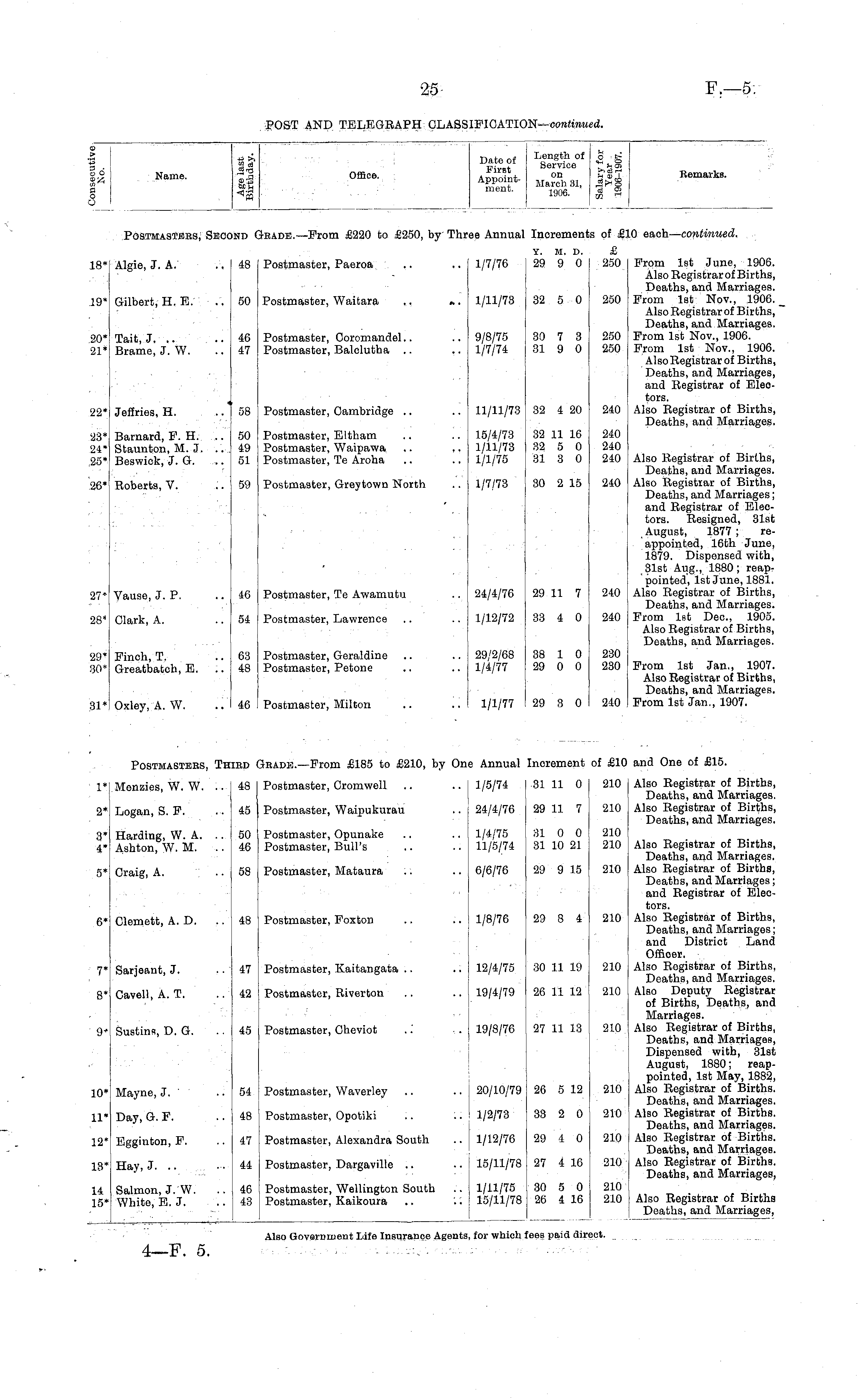 © I ,► go 8« | o O ' Name. 45 ►, <D2j Office. Date of Jj^^ t First on A ment nt " March 31, ment. lm 02 rl Remarks. Postmasters, Sec iND 1-rade.—From £220 to £250, by Three Annual Increments of £10 eaoh— continued. ae Annual Incremen iS of £: 18* Algie, J. A. 48 y. M. d. £ Postmaster, Paeroa .. .. 1/7/76 29 9 0 250 From 1st June, 1906. Also Registrarof Births, Deaths, and Marriages. Postmaster, Waitara .. ... 1/11/73 32 5 0 250 From 1st Nov., 1906. Also Registrar of Births, Deaths, and Marriages. Postmaster, Coromandel.. .. 9/8/75 30 7 3 250 From 1st Nov., 1906. Postmaster, Balclutha .. .. 1/7/74 31 9 0 250 From 1st Nov., 1906. Also Registrar of Births, Deaths, and Marriages, and Registrar of Electors. Postmaster, Cambridge .. .. 11/11/73 32 4 20 240 Also Registrar of Births, Deaths, and Marriages. Y. M. D. 1/7/76 29 9 0 £ 250 .19* Gilbert, H. E. .. 50 1/11/73 32 5 0 250 20* 21* Tait, J. .. Brame, J. W. 46 47 9/8/75 30 7 3 1/7/74 31 9 0 250 250 Jeffries, H. 11/11/73 32 4 20 22* 58 11/11/73 240 23* 24* 25* Barnard, F. H. Staunton, M. J. Beswick, J. G. 50 49 51 Postmaster, Eltham .. .. 15/4/73 32 11 16 240 Postmaster, Waipawa .. ,. 1/11/73 32 5 0 240 Postmaster, Te Aroha .. .. 1/1/75 31 3 0 240 Also Registrar of Births, Deaths, and Marriages. Postmaster, Greytown North .. 1/7/73 30 2 15 240 Also Registrar of Births, Deaths, and Marriages; and Registrar of Electors. Resigned, 31st August, 1877; reappointed, 16th June, 1879. Dispensed with, ,31st Aug., 1880; reappointed, 1st June, 1881. Postmaster, Te Awamutu .. 24/4/76 29 11 7 240 Also Registrar of Births, Deaths, and Marriages. Postmaster, Lawrence .. .. 1/12/72 33 4 0 240 From 1st Dec, 1905. Also Registrar of Births, Deaths, and Marriages. Postmaster, Geraldine .. .. 29/2/68 38 1 0 230 Postmaster, Petone .. .. 1/4/77 29 0 0 230 From 1st Jan., 1907. Also Registrar of Births, Deaths, and Marriages. Postmaster, Milton .. .. 1/1/77 29 3 0 240 From 1st Jan., 1907. 15/4/73 32 11 16 1/11/73 32 5 0 1/1/75 31 3 0 15/4/73 1/11/73 1/1/75 240 240 240 26* Roberts, V. 59 1/7/73 30 2 15 1/7/73 240 27' '* Vause, J. P. ..46 27* 46 28' 28' S* Clark, A. .. 54 54 29* 30* 29' 30' )* Finch, T. .. 63 )* Greatbatch, E. .. 48 63 48 31* 31' .*! Oxley, A. W. .. I 46 Postmasters, Third trade.—From £185 to £210, by One Annual Increment of £10 and One of £15. 1' 2' 1* 2* .* Menzies, W. W. .. 48 !* Logan, S. F. .. 45 Postmaster, Cromwell .. .. 1/5/74 31 11 0 210 Also Registrar of Births, Deaths, and Marriages. Postmaster, Waipukurau .. 24/4/76 29 11 7 210 Also Registrar of Births, Deaths, and Marriages. 3' 4' 3* 4* )* Harding, W. A. .. 50 I* Ashton, W. M. .. 46 Postmaster, Opunake .. .. 1/4/75 31 0 0 210 Postmaster, Bull's .. .. 11/5/74 31 10 21 210 Also Registrar of Births, Deaths, and Marriages. Postmaster, Mataura .. .. 6/6/76 29 9 15 210 Also Registrar of Births, Deaths, and Marriages; and Registrar of Electors. Postmaster, Foxton .. :. 1/8/76 29 8 4 210 Also Registrar of Births, Deaths, and Marriages; and District Land Officer. Postmaster, Kaitangata .. .. 12/4/75 30 11 19 210 Also Registrar of Births, Deaths, and Marriages. Postmaster, Riverton .. .. 19/4/79 26 11 12 210 Also Deputy Registrar of Births, Deaths, and Marriages. Postmaster, Cheviot ..' ,. 19/8/76 27 11 13 210 Also Registrar of Births, Deaths, and Marriages, Dispensed with, 31st August, 1880; reappointed, 1st May, 1882, Postmaster, Waverley .. .. 20/10/79 26 5 12 210 Also Registrar of Births. Deaths, and Marriages. Postmaster, Opotiki .. .. 1/2/73 33 2 0 210 Also Registrar of Births. Deaths, and Marriages. Postmaster, Alexandra South .. 1/12/76 29 4 0 210 Also Registrar of Births. Deaths, and Marriages. Postmaster, Dargaville .. .. 15/11/78 27 4 16 210 Also Registrar of Births. Deaths, and Marriages, 5' 5* i* Craig, A. .. 58 6 ; 6* i* Clemett, A. D. .. 48 48 210 T r* Sarjeant, J. .. 47 210 7* 47 8 8* )* Cavell, A. T. .. 42 42 210 9 )•» Sustins, D. G. .. 45 210 9* 45 10 )* Mayne, J. .. 54 10* U 210 11 t* Day, G. F. .. 48 48 210 11* 12 12* 1* Egginton, F. .. 47 47 210 18 13* r Hay, J. .. .. 44 44 210 14 15 14 15* t Salmon, J. W. .. 46 5* White, E. J. .. 43 4fi 4:1 Postmaster, Wellington South .. 1/11/75 30 5 0 210 Postmaster, Kaikoura .. .. 15/11/78 26 4 16 210 Also Registrar of Births Deaths, and Marriages, 210 210 Also Government Life Insurance Agents, for which :ees paid din iot.
