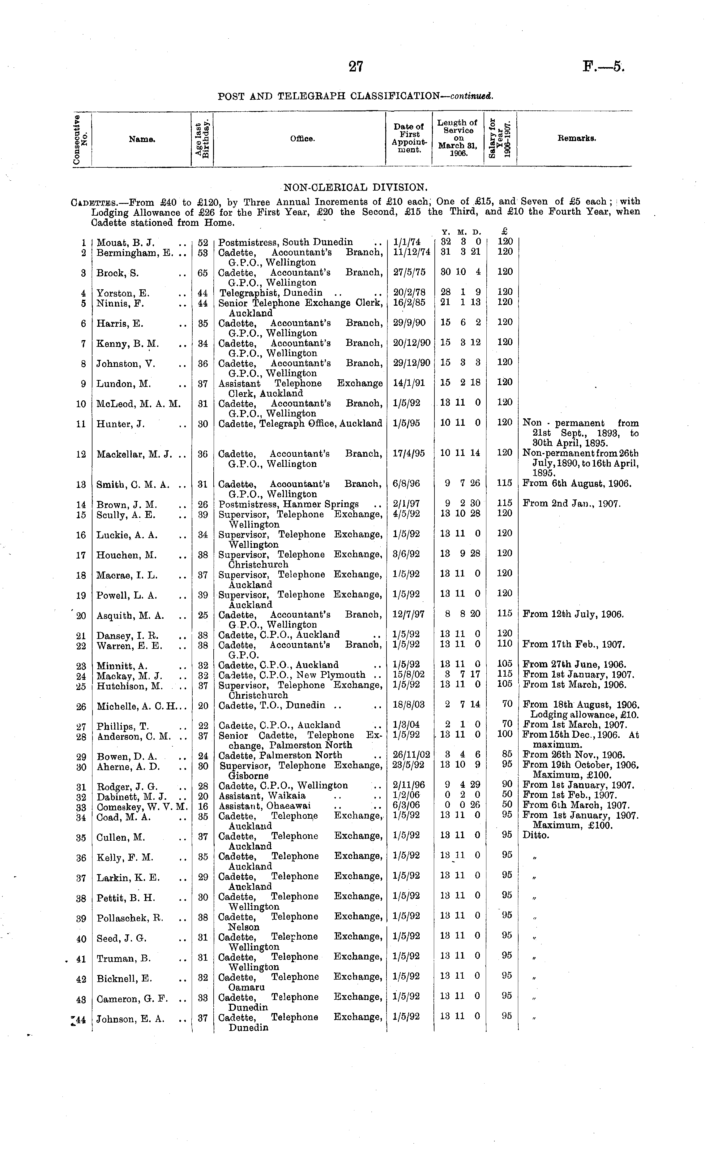 L I Name. 4= >1 Office. Dfttflof Length ol S t; wi«? Service "j g . on **» * -h Appoint- March31 «££ ment - 1906. S Remarks. NON-CLERICAL DI VISION. JiDETTHS. —From £40 to Lodging Allowance oi Cadette stationed froi £12) £26 1 Hi ), by Three Annual Increments of , for the First Year, £20 the Secor ime. £10 each, id, £15 t: One of £1; tie Third, i i, and bnd £V Seven of £5 each ; with ) the Fourth Year, when 1 Mouat, B. J. 2 Bermingham, E. .. 52 53 Postmistress, South Dunedin Cadette, Accountant's Branch, G.P.O., Wellington Cadette, Accountant's Branch, G.P.O., Wellington Telegraphist, Dunedin Senior Telephone Exchange Clerk, Auckland Cadette, Accountant's Branch, G.P.O., Wellington Cadette, Accountant's Branch, G.P.O., Wellington Cadette, Accountant's Branch, G.P.O., Wellington Assistant Telephone Exchange Clerk, Auckland Cadette, Accountant's Branch, G.P.O., Wellington Cadette, Telegraph Office, Auckland 1/1/74 11/12/74 Y. M. D. 32 3 0 31 3 21 £ 120 120 3 Brock, S. 65 27/5/75 30 10 4 120 4 Yorston, E. 5 Ninnis, F. 44 44 20/2/78 16/2/85 28 1 9 21 1 18 120 120 6 Harris, E. 35 29/9/90 15 6 2 120 7 Kenny, B. M. 34 20/12/90 15 3 12 120 8 Johnston, V. 36 29/12/90 15 3 3 120 9 Lundon, M. 37 14/1/91 15 2 18 120 10 McLeod, M. A. M. 31 1/5/92 13 11 0 120 11 Hunter, J. 12 Mackellar, M. J. 30 Cadette, Accountant's Branch, G.P.O., Wellington 1/5/95 17/4/95 10 11 0 10 11 14 120 120 Non - permanent from 21st Sept., 1893, to 30th April, 1895. Non-permanent from 26th July, 1890, to 16th April, 1895. Prom 6th August, 1906. 12 36 13 Smith, C. M. A. 13 81 Cadette, Accountant's Branch, G.P.O., Wellington Postmistress, Hanmer Springs Supervisor, Telephone Exchange, Wellington Supervisor, Telephone Exchange, Wellington Supervisor, Telephone Exchange, Christchureh Supervisor, Telephone Exchange, Auckland Supervisor, Telephone Exchange, Auckland Oadette, Accountant's Branch, GP.O., Wellington Cadette, C.P.O., Auckland Cadette, Accountant's Branch, G.P.O. Cadette, C.P.O., Auckland Cadette, C.P.O., New Plymouth .. Supervisor, Telephone Exchange, Christchurch Cadette, T.O., Dunedin 6/8/96 9 7 26 115 14 Brown, J. M. 15 Scully, A. E. 14 15 26 39 2/1/97 4/5/92 9 2 30 13 10 28 115 120 Prom 2nd Jan., 1907. 1C 16 Luckie, A. A. 34 1/5/92 13 11 0 120 17 17 Houchen, M. 38 3/6/92 13 9 28 120 18 18 Macrae, I. L. 19 19 Powell, L. A. 37 39 1/5/92 1/5/92 13 11 0 13 11 0 120 120 From 12th July, 1906. 20 20 Asquith, M. A. 25 12/7/97 8 8 20 115 21 22 21 Dansey, I. B. 22 Warren, E. E. 38 38 1/5/92 1/5/92 13 11 0 13 11 0 120 110 From 17th Feb., 1907. 23 Minnitt, A. 24 Mackay, M. J. 25 Hutchison, M. 23 24 '25 32 32 37 1/5/92 15/8/02 1/5/92 13 11 0 3 7 17 13 11 0 ; i 105 115 105 Prom 27th June, 1906. Prom 1st January, 1907. From 1st Maroh, 1906. 26 26 Michelle, A. C. H... I 20 18/8/03 j 2 7 14 [ 70 From 18th August, 1906. Lodging allowance, £10. Prom 1st March, 1907. From 15th Dec., 1906. At maximum. From 26th Nov., 1906. Prom 19th October, 1906. Maximum, £100. Prom 1st January, 1907. Prom 1st Feb., 1907. From 6t,h March, 1907. Prom 1st January, 1907. Maximum, £100. Ditto. 27 28 27 Phillips, T. 28 Anderson, CM. 22 37 Cadette, C.P.O., Auckland Senior Cadette, Telephone Exchange, Palmerston North Cadette, Palmerston North Supervisor, Telephone Exchange, Gisborne Cadette, C.P.O., Wellington Assistant, Waikaia Assistant, Ohaeawai Cadette, Telephone Exchange, Auckland Cadette, Telephone Exchange, Auckland Cadette, Telephone Exchange, Auckland Cadette, Telephone Exchange, Auckland Cadette, Telephone Exchange, Wellington Cadette, Telephone Exchange, Nelson Cadette, Telephone Exchange, Wellington Cadette, Telephone Exchange, Wellington Cadette, Telephone Exchange, Oamaru Oadette, Telephone Exchange, Dunedin Cadette, Telephone Exchange, Dunedin 1/3/04 1/5/92 2 10 . 13 11 0 70 I 100 29 30 29 Bowen, D. A. 30 Aherne, A. D. 24 30 26/11/02 23/5/92 3 4 6 13 10 9 85 95 31 32 33 34 31 Rodger, J. G. 32 Dabinett, M. J. 33 Oomeskey, W. V. M. 34 Coad, M. A. 28 20 16 35 2/11/96 1/2/06 6/3/06 1/5/92 9 4 29 0 2 0 0 0 26 13 11 0 90 50 50 95; 88 35 Cullen, M. 37 1/5/92 13 11 0 95 j 36 Kelly, P. M. 36 35 1/5/92 13 11 0 ' 95: 37 37 Larkin, K. E. 29 1/5/92 13 11 0 95; 38 Pettit, B. H. 38 30 1/5/92 13 11 0 95 89 39 Pollaschek, R. 38 1/5/92 13 11 0 95 40 40 Seed, J. G. 31 1/5/92 13 11 0 95 41 41 Truman, B. 81 1/5/92 13 11 0 95 42 42 Bicknell, E. .. I 32 1/5/92 18 11 0 95 43 43 Cameron, G. P. 33 1/5/92 13 11 0 95 44 44 Johnson, E. A. 37 1/5/92 13 11 0 95