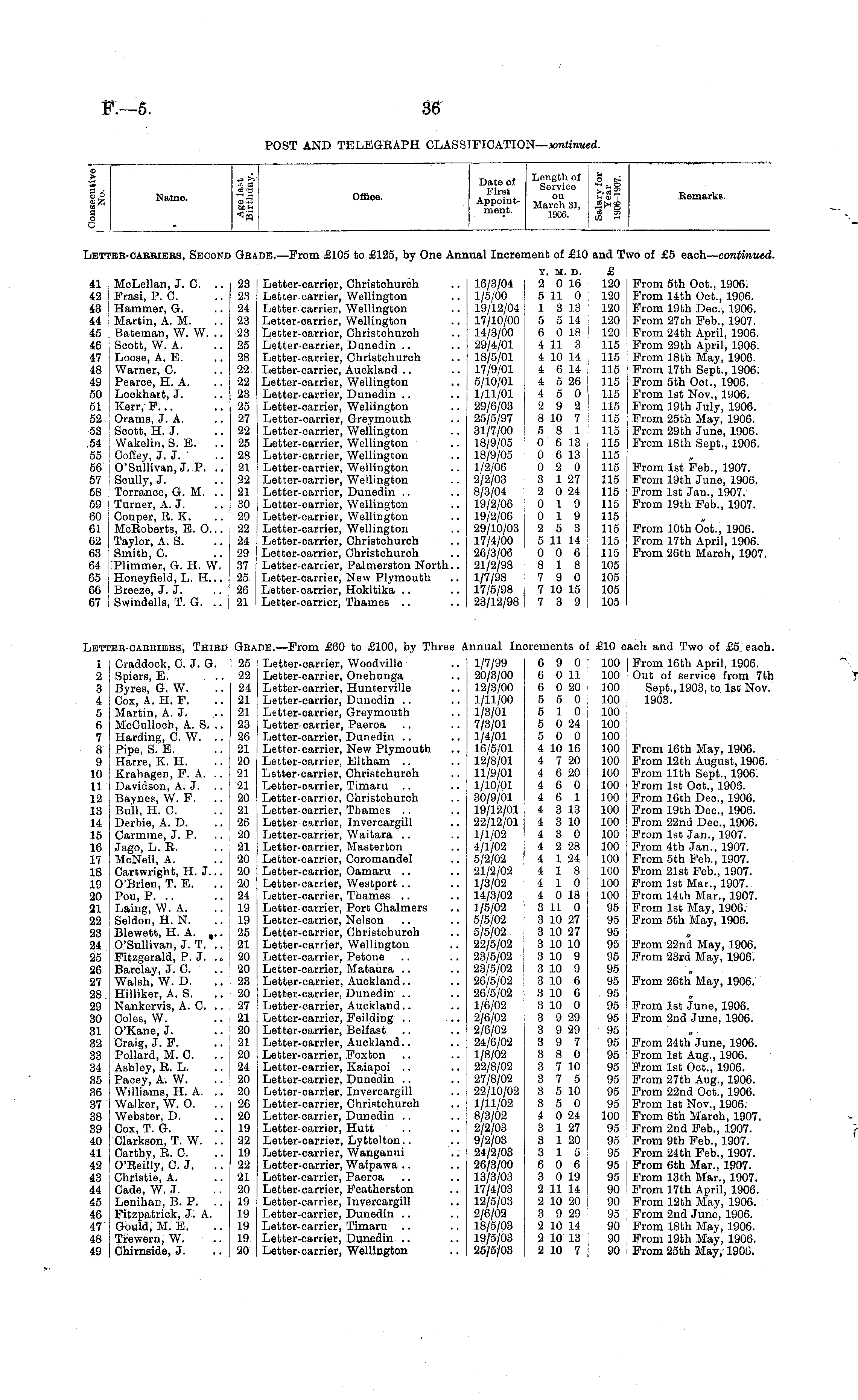 I O a Name. Office. Dfltnnf Length Of o fc Appoint- Mar °E 8 l, «££ meI ? t - 1906. $ I Remarks. iBT , ?EB-OABBIEBS, SECOND GbA ,db. —From £105 to £125, by One Annual Increi lent of £10 and T^ to of £5 each— continued. 41 42 43 44 45 46 47 48 49 50 51 52 53 54 55 56 57 58 59 60 61 62 63 64 65 66 67 McLellan, J. C. .. 23 Frasi, P. C. .. 23 Hammer, G. .. 24 Martin, A. M. .. 23 Bateman, W. W. .. 23 Scott, W. A. .. 25 Loose, A. B. .. 28 Warner, C. .. 22 Pearoe, H. A. .. 22 Lookhart, J. .. 23 Kerr, F. .. .. 25 Orams, J. A. .. 27 Scott, H. J. .. 22 Wakelin, S. E. .. 25 Coffey, J. J. ' .. 28 O'Sullivan.J. P. .. 21 Scully, J. .. 22 Torranoe, G. M. .. 21 Turner, A. J. .. 30 Couper, R. K. .. 29 McRoberts, E. 0... 22 Taylor, A. S. .. 24 I Smith, 0. .. 29 ■Plimmer, G. H. W. 37 Honeyfield, L. H... 25 Breeze, J. J. .. 26 Swindells, T. G. .. 21 Letter-carrier, Christchurch .. 16/3/04 Letter-carrier, Wellington .. 1/5/00 Letter-carrier, Wellington .. 19/12/04 Letter-oarrier, Wellington .. 17/10/00 Letter-carrier, Christchurch .. 14/3/00 Letter-carrier, Dunedin .. .. 29/4/01 Letter-carrier, Christchurch .. 18/5/01 Letter-carrier, Auckland .. .. 17/9/01 Letter-carrier, Wellington .. 5/10/01 Letter-carrier, Dunedin .. .. 1/11/01 Letter-carrier, Wellington .. 29/6/03 Letter-carrier, Greymouth .. 25/5/97 Letter-carrier, Wellington .. 31/7/00 Letter-carrier, Wellington .. 18/9/05 Letter-carrier, Wellington .. 18/9/05 Letter-carrier, Wellington .. 1/2/06 Letter-carrier, Wellington .. 2/2/03 Letter-carrier, Dunedin .. .. 8/3/04 Letter-carrier, Wellington .. 19/2/06 Letter-carrier, Wellington .. 19/2/06 Letter-carrier, Wellington .. 29/10/03 I Letter-carrier, Christohurch .. 17/4/00 Letter-carrier, Christchuroh .. 26/3/06 Letter-carrier, Palmerston North.. 21/2/98 Letter-carrier, New Plymouth .. 1/7/98 Letter-carrier, Hokitika .. .. 17/5/98 Letter-carrier, Thames .. .. 23/12/98 Y. M. D. 2 0 16 5 11 0 1 3 13 5 5 14 6 0 18 4 11 3 4 10 14 4 6 14 4 5 26 4 5 0 2 9 2 8 10 7 5 8 1 0 6 13 0 6 13 0 2 0 3 1 27 2 0 24 0 19 0 19 2 5 3 5 11 14 0 0 6 8 18 7 9 0 7 10 15 7 3 9 £ 120 120 120 120 120 115 115 115 115 115 115 115 115 115 115 115 115 115 115 115 115 115 115 105 105 105 105 From 5th Oct., 1906. From 14th Oct., 1906. From 19th Dec, 1906. From 27th Feb., 1907. From 24th April, 1906. From 29th April, 1906. From 18th May, 1906. From 17th Sept., 1906. From 5th Oct., 1906. From 1st Nov., 1906. From 19th July, 1906. From 25th May, 1906. From 29th June, 1906. From 18th Sept., 1906. From 1st Feb., 1907. From 19th June, 1906. From 1st Jan., 1907. From 19th Feb., 1907. From 10th Oct., 1906. From 17th April, 1906. From 26th March, 1907. :eb-cabbiebs, Thibd Gea: Craddook, 0. J. G. 25 Spiers, E. .. 22 Byres, G. W. .. 24 Cox, A. H. F. .. 21 Martin, A. J. .. 21 McOulioch, A. S. .. 23 Harding, 0. W. .. 26 Pipe, S. E. .. 21 Harre, K. H. .. 20 Krahagen, F. A. .. 21 Davidson, A. J. .. 21 Baynes, W. F. .. 20 Bull, H. C. .. 21 ! Derbie, A. D. .. 26 Carmine, J. P. .. 20 Jago, L. R. . -. 21 McNeil, A. ..20 Cartwright, H. J. .. 20 O'Brien, T. E. .. 20 Pou, P. .. .. 24 Laing, W.A. .. 19 Seldon, H. N. .. 19 Blewett, H. A. ... 25 O'Sullivan, J. T. .. 21 Fitzgerald, P. J. .. 20 Barclay, J. C. .. 20 Walsh, W. D. .. 23 Hilliker, A. S. .. 20 Nankervis, A. C. .. 27 Coles, W. .. 21 O'Kane, J. .. 20 Craig, J. F. .. 21 Pollard, M. C. .. 20 Ashley,R. L. .. 24 Pacey, A. W. .. 20 Williams, H. A. .. 20 I Walker, W. O. .. 26 Webster, D. .. 20 Cox, T. G. .. 19 Clarkson, T. W. .. 22 Carthy, R. C. .. 19 O'Reilly, C. J, .. 22 Christie, A. .. 21 Cade, W. J. .. 20 Lenihan, B. P. .. 19 Fitzpatrick, J. A. 19 Gould, M. E. .. 19 Trewern, W. .. 19 I Chirnside, J. .. 20 irements o: £10 ei ich and Two of £5 eaoh. jETI 1 2 3 4 5 6 7 8 9 10 11 12 13 14 15 16 17 18 19 20 21 22 23 24 25 26 27 28. 29 30 31 32 33 34 35 36 37 38 39 40 41 42 43 44 45 46 47 48 49 DK.—From £60 to £100, by Three Annual In. Letter-carrier, Woodville .. 1/7/99 Letter-carrier, Onehunga .. 20/3/00 Letter-carrier, Hunterville .. 12/3/00 Letter-carrier, Dunedin .. .. 1/11/00 Letter-carrier, Greymouth .. 1/3/01 Letter-carrier, Paeroa .. .. 7/3/01 Letter-carrier, Dunedin .. .. 1/4/01 Letter-carrier, New Plymouth .. 16/5/01 Letter-carrier, Eltham .. .. 12/8/01 Letter-carrier, Christchurch .. 11/9/01 Letter-carrier, Timaru .. .. 1/10/01 Letter-carrier, Christchurch .. 30/9/01 Letter-carrier, Thames .. .. 19/12/01 Letter oarrier, Invercargill .. 22/12/01 Letter-carrier, Waitara .. .. 1/1/02 Letter-carrier, Masterton .. ] 4/1/02 Letter-carrier, Coromandel .. 5/2/02 Letter-carrier, Oamaru .. .. 21/2/02 Letter-carrier, Westport .. .. 1/3/02 Letter-carrier, Thames .. .. 14/3/02 Letter-carrier, Port Chalmers .. 1/5/02 Letter-carrier, Nelson .. .. 5/5/02 Letter-carrier, Christchurch .. 5/5/02 Letter-carrier, Wellington .. 22/5/02 Letter-carrier, Petone .. .. 23/5/02 Letter-carrier, Mataura .. .. 23/5/02 Letter-carrier, Auckland.. .. 26/5/02 Letter-carrier, Dunedin .. .. 26/5/02 Letter-carrier, Auckland.. .. 1/6/02 Letter-carrier, Feilding .. .. 2/6/02 Letter-oarrier, Belfast .. .. 2/6/02 Letter-oarrier, Auckland.. .. 24/6/02 Letter-carrier, Foxton .. .. 1/8/02 Letter-carrier, Kaiapoi .. .. 22/8/02 Letter-carrier, Dunedin .. .. 27/8/02 Letter-oarrier, Invercargill .. 22/10/02 Letter-carrier, Christchurch .. 1/11/02 Letter-carrier, Dunedin .. .. 8/3/02 Letter-carrier, Hutt .. .. 2/2/03 Letter-carrier, Lyttelton.. .. 9/2/03 Letter-carrier, Wanganni .. 24/2/03 Letter-carrier, Waipawa .. .. 26/3/00 Letter-carrier, Paeroa .. .. 13/3/03 Letter-carrier, Featherston .. 17/4/03 Letter-carrier, Invercargill .. 12/5/03 Letter-carrier, Dunedin .. .. 2/6/02 Letter-carrier, Timaru .. .. 18/5/03 Letter-carrier, Dunedin .. .. 19/5/03 Letter-carrier, Wellington .. 25/5/03 6 9 0 6 0 11 6 0 20 5 5 0 5 10 5 0 24 5 0 0 4 10 16 4 7 20 4 6 20 4 6 0 4 6 1 4 3 13 4 3 10 4 3 0 4 2 28 4 1 24 4 18 4 10 4 0 18 3 11 0 3 10 27 3 10 27 3 10 10 3 10 9 3 10 9 3 10 6 3 10 6 3 10 0 3 9 29 3 9 29 3 9 7 3 8 0 3 7 10 3 7 5 3 5 10 3 