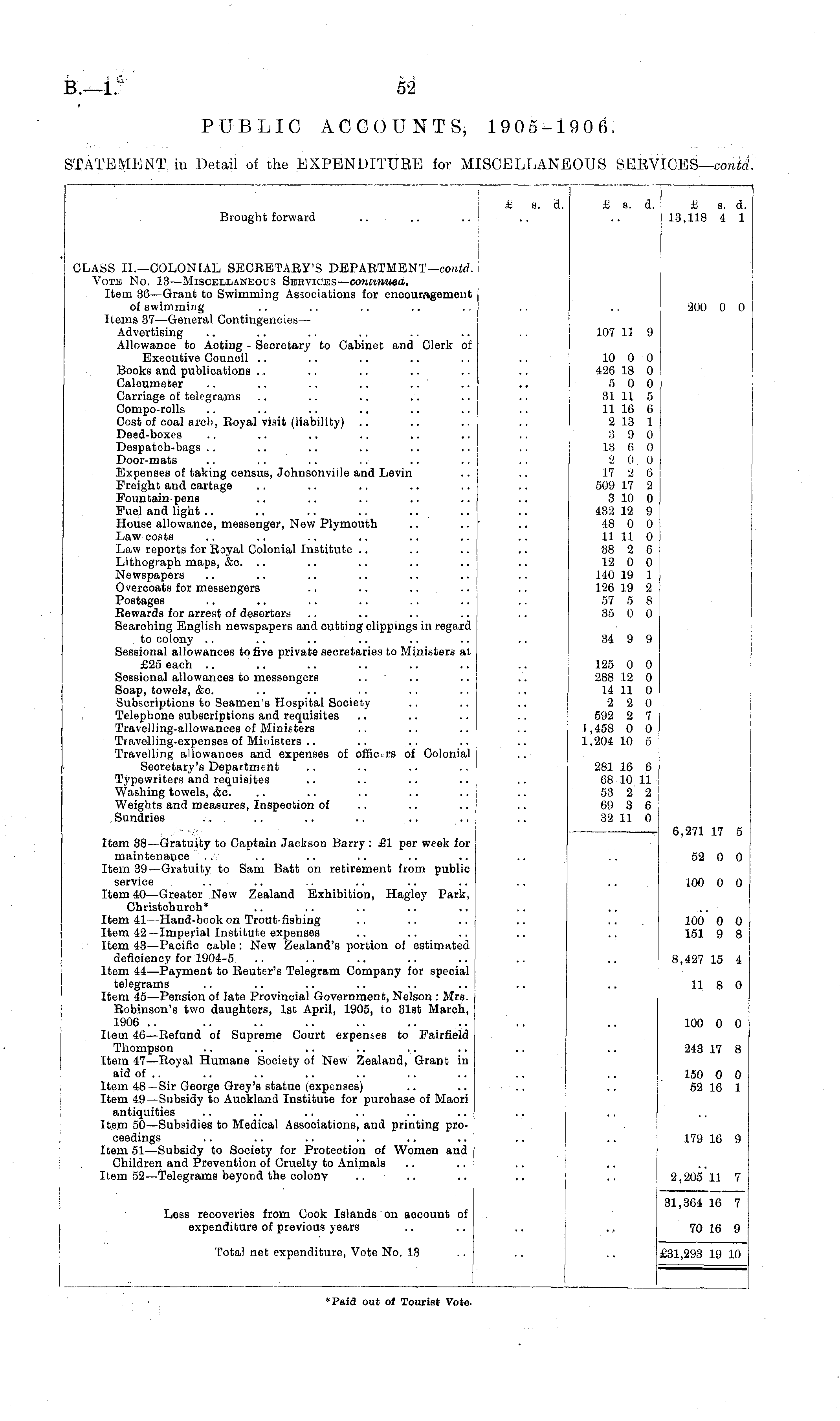 Brought forward s. ; s. a s. a. 13,118 4 1 1LASS II.—COLONIAL SECRETABY'3 DEPARTMENT— contd. Vote No. 13—Miscellaneous Seevices— conivnued. Item 36—Grant to Swimming Associations for enoouwigement of swimming Items 37—General Contingencies— Advertising Allowance to Acting - Secretary to Cabinet and Clerk of Executive Council Books and publications Calcumeter .. .. .. .. Carriage of telegrams Compo-rolls Cost of coal arch, Royal visit (liability) Deed-boxes Despatch-bags Door-mats Expenses of taking census, Johnsonviile and Levin Freight and cartage Fountain pens Fuel and light House allowance, messenger, New Plymouth Law costs Law reports for Royal Colonial Institute Lithograph maps, &c. Newspapers Overcoats for messengers Postages Rewards for arrest of deserters Searching English newspapers and cutting clippings in regard to colony Sessional allowances to five private secretaries to Ministers at £25 each Sessional allowances to messengers Soap, towels, &c. Subscriptions to Seamen's Hospital Society Telephone subscriptions and requisites Travelling-allowances of Ministers Travelling-expenses of Ministers Travelling allowances and expenses of officers of Colonial Secretary's Department Typewriters and requisites Washing towels, &c. Weights and measures, Inspection of . Sundries 107 11 9 10 0 0 426 18 0 5 0 0 31 11 5 11 16 6 2 13 1 3 9 0 13 6 0 2 0.0 17 2 6 509 17 2 3 10 0 432 12 9 48 0 0 11 11 0 38 2 6 12 0 0 140 19 1 126 19 2 57 5 8 35 0 0 300 0 0 34 9 9 125 0 0 288 12 0 14 11 0 2 2 0 592 2 7 1,458 0 0 1,204 10 5 281 16 6 68 10 11 53 2 2 69 3 6 32 11 0 Item 38—Gratuity to Captain Jackson Barry : £1 per week for maintenance .. Item 39 —Gratuity to Sam Batt on retirement from public service Item 40—Greater New Zealand Exhibition, Hagley Park, Christchurch* Item 41 —Hand-book on Trout-fishing Item 42 —Imperial Institute expenses Item 43 —Pacific cable : New Zealand's portion of estimated deficiency for 1904-5 Item 44—Payment to Reuter's Telegram Company for special telegrams Item 45 —Pension of late Provincial Government, Nelson : Mrs. Robinson's two daughters, 1st April, 1905, to 31st March, 1906 .. Item 46—Refund of Supreme Court expenses to Fairfield Thompson Item 47—Royal Humane Society of New Zealand, Grant in aid of .. Item 48-Sir George Grey's statue (expenses) Item 49 —Subsidy to Auckland Institute for purchase of Maori antiquities Item 50—Subsidies to Medical Associations, and printing proceedings Item 51—Subsidy to Society for Protection of Women and Children and Prevention of Cruelty to Animals Item 52—Telegrams beyond the colony 6,271 17 5 52 0 0 100 0 0 100 0 0 151 9 8 8,427 15 4 11 8 0 100 0 0 243 17 8 150 0 0 52 16 1 179 16 9 2,205'11 7 Less recoveries from Cook Islands on account of expenditure of previous years 31,364 16 7 70 16 9 Total net expenditure, Vote No. 13 £31,293 19 10 *Pai( of
