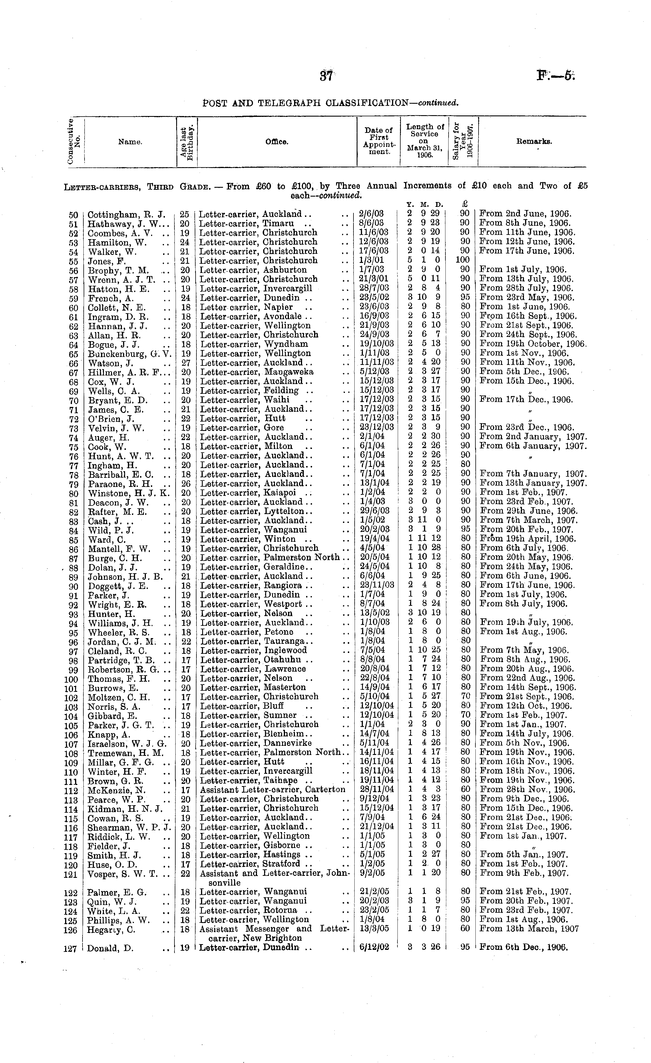 a> Id g Name. Office. Appoint- Ma ° c n h31 S£<A ment - 1906. I 3 Remarks. llST , ME-CARBIERS, THIRD Ga lDB. — Prom £60 to £100, by Thn each— continw ie Annual d. Inoremeni ts of !10 each and Two of £5 50 51 52 53 54 55 56 57 58 59 60 61 62 63 64 65 66 67 68 69 70 71 72 73 74 75 76 77 78 79 80 81 82 83 84 85 86 87 88 89 90 91 92 93 94 95 96 97 98 99 100 101 102 103 104 105 106 107 108 109 110 111 112 113 114 115 116 117 118 119 120 121 Cottingham, R. J. 25 Hathaway, J. W... 20 Coombes, A. V. .. j 19 Hamilton, W. .. 24 Walker, W. .. 21 Jones, F. .. 21 Brophy, T. M. ... 20 Wrenn, A. J. T. .. ! 20 Hatton, H. E. .. | 19 French, A. .. i 24 Collett, N. E. .. 18 Ingram, D. R. .. 18 Harman, J. J. ..20 Allan, H. R. .. 20 Bogue, J. J. .. 18 Bunckenburg, (i. V. 19 Watson, J. .. I 27 Hillmer, A. R. F... | 20 Cox, W. J. .. 19 Wells, C. A. .. 19 Bryant, E. D. .. 20 James, C. E. .. 21 O'Brien, J. .. 22 Velvin, J. W. .. 19 Auger, H. .. 22 Cook, W. .. 18 Hunt, A. W. T. .. 20 Ingham, H. .. 20 Barriball, E. C. .. 18 Paraone, R. H. .. 26 Winstone, H. J. K. 20 Deacon, J. W. .. 20 Rafter, M. E. .. 20 Cash, J. .. .. 18 Wild, P. J. .. 19 Ward, C. .. 19 Mantell, F. W. .. 19 Burge, C. H. .. 20 Dolan, J. J. .. 19 Johnson, H. J. B. 21 Doggett, J. E. .. 18 Parker, J. .. 19 Wright, E. R. .. 18 Hunter, H. .. 20 Williams, J. H. .. 19 Wheeler, R. S. .. 18 Jordan, C. J. M. .. 22 Cleland, R. C. .. 18 Partridge, T. B. .. 17 Robertson, R. G. .. 17 Thomas, F. H. .. 20 Burrows, E. .. 20 Moltzen, C. H. .. 17 Norris, S. A. .. 17 Gibbard, E. .. 18 Parker, J. G. T. .. 19 Knapp, A. .. 18 Israelson, W. J. G. 20 Tremewan, H. M. 18 Millar, G. F. G. .. 20 Winter, H. F. .. 19 Brown, G. R. .. 20 McKenzie, N. .. 17 Pearce, W. P. .. 20 Kidman, H. N. J. 21 Cowan, R. S. .. 19 Shearman, W. P. J. 20 Riddick, L. W. .. 20 Fielder, J. .. 18 Smith, H. J. .. 18 Huse, O. D. .. 17 Vosper, S. W. T. .. 22 Letter-carrier, Auckland Letter-carrier, Timaru Letter-carrier, Christchurch Letter-carrier, Christchurch Letter-carrier, Christchurch Letter-carrier, Christchurch Letter-carrier, Ashburton Letter-carrier, Christchurch Letter-carrier, Invercargill Letter-carrier, Dunedin Letter carrier, Napier Letter-carrier, Avondale Letter-carrier, Wellington Letter-carrier, Christchurch Letter-carrier, Wyndham Letter-carrier, Wellington Letter-carrier, Auckland Letter-carrier, Mangaweka Letter-carrier, Auckland Letter-carrier, Feilding Letter-oarrier, Waihi Letter-carrier, Auckland.. Letter-carrier, Hutt .. Letter-carrier, Gore Letter-carrier, Auckland.. Letter-carrier, Milton Letter-carrier, Auckland.. Letter-carrier, Auckland.. Letter-carrier, Auckland.. Letter-oarrier, Auckland.. Letter-carrier, Kaiapoi Letter-carrier, Auckland Letter carrier, Lyttelton.. Letter-carrier, Auckland.. Letter-oarrier, Wanganui Letter-carrier, Winton Letter-carrier, Christohurch Letter- carrier, Palmerston North .. Letter-carrier, Geraldine.. Letter-carrier, Auckland Letter-carrier, Rangiora Letter-carrier, Dunedin Letter-carrier, Westport Letter-oarrier, Nelson Letter-carrier, Auckland.. Letter-carrier, Petone Letter-carrier, Tauranga.. Letter-carrier, Inglewood Letter-carrier, Otahuhu Letter-oarrier, Lawrence Letter-carrier, Nelson Letter-carrier, Masterton Letter-carrier, Christchurch Letter-carrier, Bluff Letter-oarrier, Sumner Letter-carrier, Christchurch Letter-carrier, Blenheim.. Letter-carrier, Dannevirke Letter-carrier, Palmerston North.. Letter-oarrier, Hutt Letter-carrier, Invercargill Letter-carrier, Taihape .. Assistant Letter-carrier, Carterton Letter-carrier, Christchuroh Letter-oarrier, Christohurch Letter-carrier, Auckland.. Letter-carrier, Auckland.. Letter-carrier, Wellington Letter-carrier, Gisborne Letter-oarrier, Hastings Letter-carrier, Stratford Assistant and Letter-carrier, Johnsonville Letter-carrier, Wanganui Letter-carrier, Wanganui Letter-carrier, Botorua Letter-oarrier, Wellington Assistant Messenger and Lettercarrier, New Brighton Letter-carrier, Dunedin .. 2/6/03 8/6/03 11/6/03 12/6/03 17/6/03 1/3/01 1/7/03 21/3/01 28/7/03 23/5/02 23/6/03 16/9/03 21/9/03 24/9/03 19/10/03 1/11/03 11/11/03 5/12/03 15/12/03 15/12/03 17/12/03 17/12/03 17/12/03 23/12/03 2/1/04 6/1/04 6/1/04 7/1/04 7/1/04 13/1/04 1/2/04 1/4/03 29/6/03 1/5/02 20/2/03 19/4/04 4/5/04 20/5/04 24/5/04 6/6/04 23/11/03 1/7/04 8/7/04 13/5/02 1/10/03 1/8/04 1/8/04 , 7/5/04 8/8/04 20/8/04 22/8/04 14/9/04 5/10/04 12/10/04 12/10/04 1/1/04 14/7/04 5/11/04 14/11/04 16/11/04 18/11/04 19/11/04 28/11/04 9/12/04 15/12/04 7/9/04 21/12/04 1/1/05 1/1/05 5/1/05 1/2/05 9/2/05 Y. M. D. 2 9 29 2 9 23 2 9 20 2 9 19 2 0 14 5 10 2 9 0 5 0 11 2 8 4 3 10 9 2 9 8 2 6 15 2 6 10 2 6 7 2 5 13 2 5 0 2 4 20 2 3 27 2 3 17 2 3 17 2 3 15 2 3 15 2 3 15 2 3 9 2 2 30 2 2 26 2 2 26 2 2 25 2 2 25 2 2 19 2 2 0 3 0 0 2 9 3 3 11 0 3 19 1 11 12 1 10 28 1 10 12 1 10 8 1 9 25 2 4 8 19 0 1 8 24 3 10 19 2 6 0 18 0 18 0 1 10 25 1 7 24 1 7 12 1 7 10 1 6 17 1 5 27 1 5 20 1 5 20 2 3 0 1 8 13 1 4 26 1 4 17 1 4 15 1 4 13 1 4 12 14 3 1 3 23 1 3 17 1 6 24 1 3 11 13 0 13 0 1 2 27 12 0 1 1 20 £ 90 90 90 90 90 100 90 90 90 95 80 90 90 90 90 90 i 90 90 90 90 90 90 90 90 90 90 90 80 90 90 90 90 90 90 95 80 80 80 80 80 , 80 80 80 80 80 80 80 80 80 80 80 80 70 80 70 90 80 80 80 80 80 80 60 80 80 80 80 80 80 80 80 80 I : From 2nd June, 1906. From 8th June, 1906. From 11th June, 1906. From 12th June, 1906. From 17th June, 1906. From 1st July, 1906. From 13th July, 1906. From 28th July, 1906. From 23rd May, 1906. From 1st June, 1906. From 16th Sept., 1906. From 21st Sept., 1906. From 24th Sept., 1906. From 19th October, 1906. From 1st Nov., 1906. From 11th Nov., 1906. From 5th Dec, 1906. From 15th Deo., 1906. From 17th bee, 1906. From 23rd Dec, 1906. From 2nd January, 1907. From 6th January, 1907. From 7th January, 1907. From 13th January, 1907. From 1st Feb., 1907. From 23rd Feb., 1907. From 29th June, 1906. From 7th March, 1907. From 20th Feb., 1907. From 19th April, 1906. From 6th July, 1906. From 20th May, 1906. From 24th May, 1906. From 6th Jun
