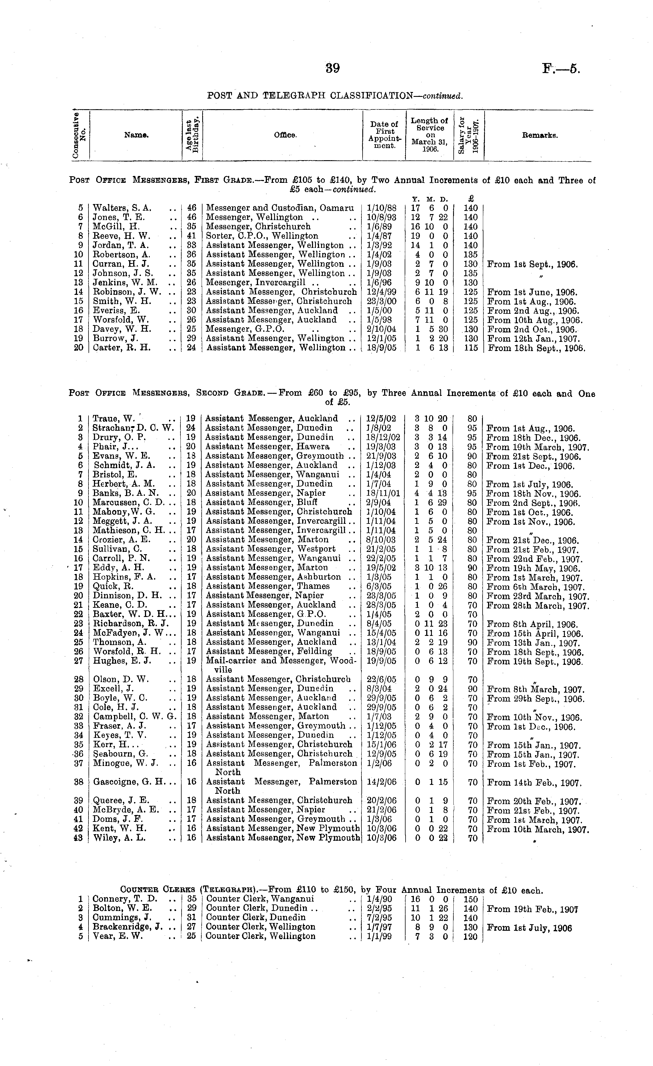 I Id i o Name. Office. Date of First Appointment. Length of 8 t Service g on frgf March 31, £>*S 1906. $ S Remarks. 'OS' D8T Office Mkssengebs, Fiest Gbade.—From £105 to £140, by Two Annual Increments of £10 each and Three of £5 eaoh— continued. 5 6 7 8 9 10 11 12 13 14 IS 16 17 18 19 20 Y. m. d. £ 5 Walters, S. A. .. I 46 Messenger and Custodian, Oamaru 1/10/88 17 6 0 140 6 Jones, T. E. .. 46 Messenger, Wellington .. .. 10/8/93 12 7 22 140 7 McGill, H. .. ! 35 Messenger, Christchurch .. 1/6/89 16 10 0 140 8 Reeve, H. W. .. 41 Sorter, O.P.O., Wellington .. 1/4/87 19 0 0 140 9 Jordan, T. A. .. 33 Assistant Messenger, Wellington .. 1/3/92 14 1 0 140 .0 Robertson, A. .. 36 Assistant Messenger, Wellington .. 1/4/02 4 0 0 135 .1 Curran, H. J. .. 35 Assistant Messenger, Wellington .. 1/9/03 2 7 0 130 From 1st Sept., 1906. .2 Johnson, J. S. .. 35 Assistant Messenger, Wellington .. 1/9/03 2 7 0 135 .3 Jenkins, W. M. .. 26 Messenger, Inveroargill .. .. 1/6/96 9 10 0 130 .4 Robinson, J. W. .. 23 Assistant Messenger, Christchurch 12/4/99 6 11 19 125 From 1st June, 1906. .5 Smith, W. H. .. 23 Assistant Christohurch 23/3/00 6 0 8 125 From 1st Aug., 1906. .6 Everiss, E. .. 30 Assistant Messenger, Auckland .. 1/5/00 5 11 0 125 From 2nd Aug., 1906. .7 Worsfold, W. .. 26 Assistant Messenger, Auckland .. 1/5/98 7 11 0 125 From 10th Aug., 1906. .8 Davey, W. H. .. 25 Messenger, G.P.O. .. .. 2/10/04 1 5 30 130 From 2nd Oct., 1906. .9 Burrow, J. .. 29 Assistant Messenger, Wellington .. 12/1/05 1 2 20 130 From 12th Jan., 1907. !0 Carter, R. H. .. | 24 Assistant Messenger, Wellington .. 18/9/05 1 6 13 115 From 18th Sept., 1906. dst Office Messengers, Second Gbade. — From £60 to £95, by Three Annual Increments of £10 each and One of £5. 'OS' 1 2 8 4 5 6 7 8 9 10 11 12 18 14 15 16 17 18 19 20 21 22 23 24 25 26 27 1 Traue, W. .. 19 Assistant Messenger, Auckland .. 12/5/02 3 10 20 80 2 C. W. 24 Assistant Messenger, Dunedin .. 1/8/02 3 8 0 95 From 1st Aug., 1906. 3 Drury, O. P. .. 19 Assistant Messenger, Dunedin .. 18/12/02 3 3 14 95 From 18th Dec, 1906. 4 Phair, J. .. .. 20 Assistant Messenger, Hawera .. 19/3/03 3 0 13 95 From 19th March, 1907. 5 Evans, W. E. .. 18 Assistant Messenger, Greyrnouth .. 21/9/03 2 6 10 90 From 21st Sept., 1906. 6 Schmidt, J. A. .. 19 Assistant Messenger, Auckland .. 1/12/03 2 4 0 80 From 1st Dec, 1906. 7 Bristol, E. .. 18 Assistant Messenger, Wanganui .. 1/4/04 2 0 0 80 8 Herbert, A. M. .. 18 Assistant Messenger, Dunedin .. 1/7/04 19 0 80 From 1st July, 1906. 9 Banks, B.A.N. .. 20 Assistant Messenger, Napier .. 18/11/01 4 4 13 95 From 18th Nov., 1906. .0 Marcussen, C. D. .. j 18 Assistant Messenger, Bluff .. 2/9/04 1 6 29 80 From 2nd Sept., 1906. .1 Mahony,W. G. .. 19 Assistant Messenger, Christchurch 1/10/04 16 0 80 From 1st Oct., 1906. .2 Meggett, J. A. .. 19 Assistant Messenger, Invercargill.. 1/11/04 15 0 80 From 1st Nov., 1906. .3 Mathieson, C. H. .. 17 Assistant Messenger, Invercargill.. 1/11/04 1 5 0 80 .4 Crozier, A. E. .. 20 Assistant Messenger, Marton .. 8/10/03 2 5 24 80 From 21st Dec, 1906. .5 Sullivan, C. .. 18 Assistant Messenger, Westport .. 21/2/05 11-8 80 From 21st Feb., 1907. .6 Carroll, P. N. .. 19 Assistant Messenger, Wanganui .. 22/2/05 117 80 From 22nd Feb., 1907. .7 Eddy, A. H. .. 19 Assistant Messenger, Marton .. 19/5/02 3 10 13 90 From 19th May, 1906. .8 Hopkins, F. A. .. 17 Assistant Messenger, Ashburton .. 1/3/05 110 80 From 1st March, 1907. .9 Quick, R. .. 18 Assistant Messenger, Thames .. 6/3/05 1 0 26 80 From 6th March, 1907. !0 Dinnison, D. H. .. 17 Assistant Messenger, Napier .. 23/3/05 10 9 80 From 23rd March, 1907. !1 Keane, CD. .. 17 Assistant Messenger, Auckland .. 28/3/05 10 4 70 From 28th March, 1907. 12 Baxter, W. D. H... 19 Assistant Messenger, G.P.O. .. 1/4/05 2 0 0 70 !3 Richardson, R. J. 19 Assistant Messenger, Dunedin .. 8/4/05 0 1123 70 From 8th April, 1906. 14 MoFadyen, J. W... 18 Assistant Messenger, Wanganui .. 15/4/05 0 1116 70 From 15th April, 1906. !5 Thomson, A. .. 18 Assistant Messenger, Auckland .. 13/1/04 2 2 19 90 From 13th Jan., 1907. 16 Worsfold, R H. .. 17 Assistant Messenger, Feilding .. 18/9/05 0 6 13 70 From 18th Sept., 1906. !7 Hughes, E. J. .. 19 Mail-oarrier and Messenger, Wood- 19/9/05 0 6 12 70 From 19th Sept., 1906. ville !8 Olson, D. W. .. 18 Assistant Messenger, Christchurch 22/6/05 0 9 9 70 !9 Excell, J. .. 19 Assistant Messenger, Dunedin .. 8/3/04 2 0 24 90 From 8th March, 1907. 10 Boyle, W. C. .. 19 Assistant Messenger, Auokland .. 29/9/05 0 6 2 70 From 29th Sept., 1906. 11 Cole, H.J. .. 18 Assistant Messenger, Auckland .. 29/9/05 0 6 2 70 12 Campbell, C. W. G. 18 Assistant Messenger, Marton .. 1/7/03 2 9 0 70 From 10th Nov., 1906. 13 Fraser, A. J. .. 17 Assistant Messenger, Greymouth .. 1/12/05 0 4 0 70 From 1st Dec, 1906. !4 Keyes, T. V. .. 19 Assistant Messenger, Dunedin .. 1/12/05 0 4 0 70 „ 15 Kerr, H. .. ,.. 19 Assistant Messenger, Christohurch 15/1/06 0 2 17 70 From 15th Jan., 1907. 16 geabourn, G. .. 18 Assistant Messenger, Ohristchurch 12/9/05 0 6 19 70 From loth Jan., 1907. 17 Minogue, W. J. .. 16 Assistant Messenger, Palmerston 1/2/06 0 2 0 70 From 1st Feb., 1907. North 18 Gascoigne, G. H. .. 16 Assistant Messenger, Palmerston 14/2/06 0 1 15 70 From 14th Feb 1907 North 19 Queree, J. E. .. 18 Assistant Messenger, Christchurch 20/2/06 0 19 70 From 20th Feb., 1907. :0 McBryde, A. E. .. 17 Assistant Messenger, Napier .. 21/2/06 0 18 70 From 21st Feb., 1907. : 1 Doms, J. F. .. 17 Assistant Messenger, Greymouth .. 1/3/06 0 10 70 From 1st March, 1907. :2 Kent, W. H. .. 16 Assistant Messenger, New Plymouth 10/3/06 0 0 22 70 From 10th March, 1907. :3 Wiley, A. L. .. 16 Assistant Messenger, New Plymouth 10/3/06 0 0 22 70 28 29 30 81 32 83 34 83 •36 37 38 39 40 41 42 43 Oounteb Clerks (Telegraph).—From £110 to £150, by Four Annual Increments of £10 each. 1 Connery, T. D. .. 35 i Counter Clerk, Wanganui .. 1/4/90 16 0 0 150 I 2 Bolton, W. E. .. 29 Counter Clerk, Dunedin .. .. 2/2/95 11 1 26 