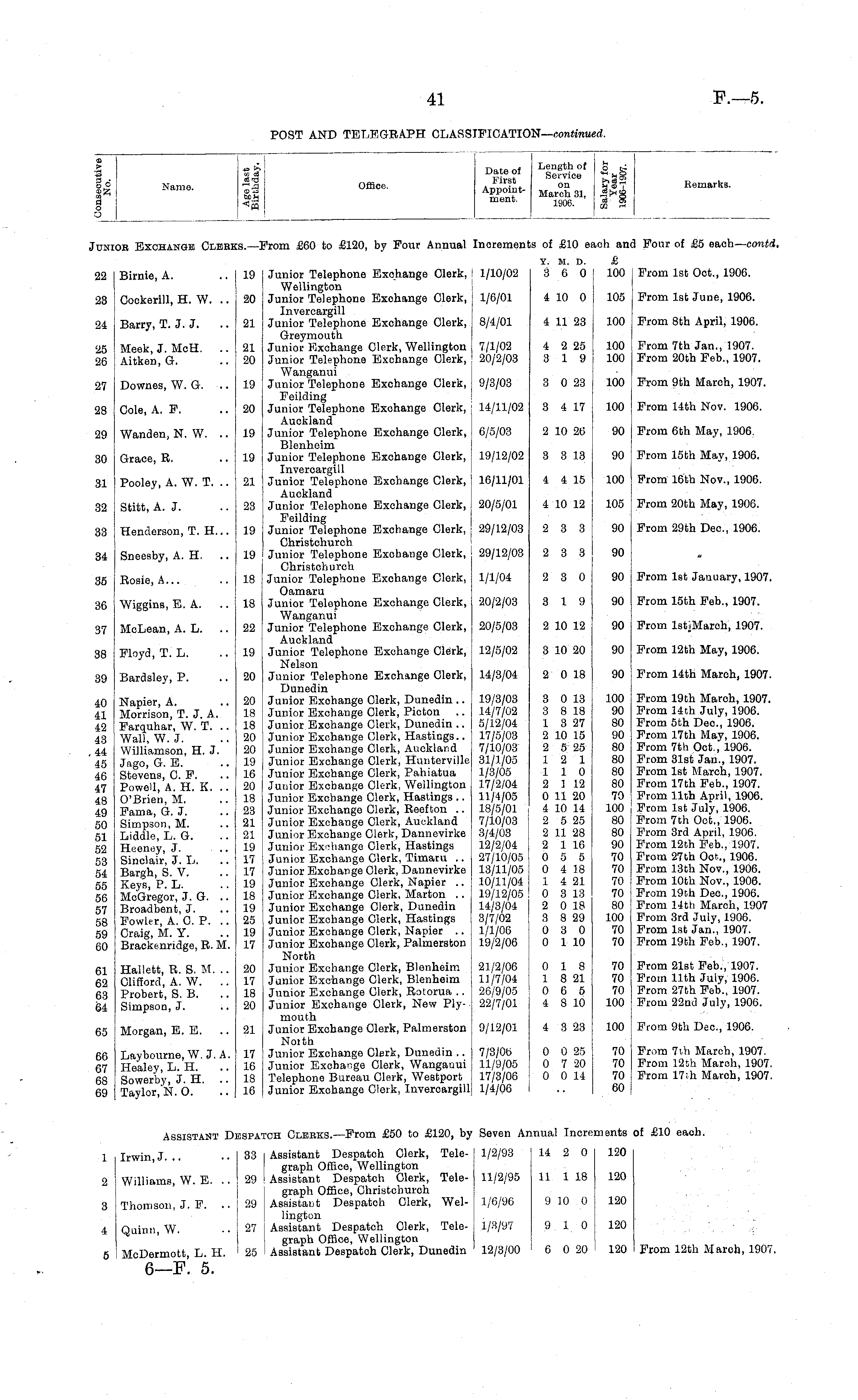I u Li Name. Office. Date of First Appointment. Length of o t^ Service "" h S on &f ■? March 81, St^S 1906. $ 3 Kemarka. UN' :or Exchange Clerks.—From £60 to £120, by Four Annual Inoremen ;s of £10 e; .oh and Fonr of £5 each— contd. Birnie, A. .. 19 Junior Telephone Exchange Clerk, I 1/10/02 Wellington Cockerill, H. W. .. 20 Junior Telephone Exohange Clerk, i 1/6/01 Invercargill Barry, T. J.J. .. 21 Junior Telephone Exchange Clerk, 8/4/01 Greymouth Meek, J. McH. .. 21 Junior Exchange Clerk, Wellington 7/1/02 Aitken, G. ..20 Junior Telephone Exchange Clerk, : 20/2/03 Wanganui Downes, W. G. .. 19 Junior Telephone Exchange Clerk, 9/3/03 Feilding Cole, A. F. .. 20 Junior Telephone Exohange Clerk, 14/11/02 Auckland Wanden, N. W. .. 19 Junior Telephone Exchange Clerk, ! 6/5/03 Blenheim Grace, R. .. 19 Junior Telephone Exchange Clerk, 19/12/02 Invercargill Pooley, A. W. T. .. 21 Junior Telephone Exchange Clerk, ; 16/11/01 Auckland Stitt, A. J. .. 23 Junior Telephone Exchange Clerk, 20/5/01 Feilding Henderson, T. H... 19 ] Junior Telephone Exchange Clerk, 29/12/03 Christchurch Sneesby, A. H. .. 19 Junior Telephone Exchange Clerk, 29/12/03 Christchurch Rosie, A... .. 18 Junior Telephone Exohanga Clerk, 1/1/04 Oamaru Wiggins, E. A. .. 18 Junior Telephone Exchange Clerk, 20/2/03 Wanganui McLean, A. L. .. 22 Junior Telephone Exchange Clerk, 20/5/03 Auckland Floyd, T. L. .. 19 Junior Telephone Exchange Clerk, 12/5/02 Nelson Bardsley, P. .. 20 Junior Telephone Exchange Clerk, 14/3/04 Dunedin Napier, A. .. 20 Junior Exohange Clerk, Dunedin .. 19/3/03 Morrison, T. J. A. 18 Junior Exohange Clerk, Picton .. j 14/7/02 Farquhar, W. T. .. 18 Junior Exchange Clerk, Dunedin .. I 5/12/04 Wall, W. J. .. 20 Junior Exchange Clerk, Hastings.. 17/5/03 Williamson, H. J. 20 Junior Exchange Clerk, Auckland 7/10/03 Jago, G. E. .. 19 Junior Exchange Clerk, Hunterviile 31/1/05 Stevens, C. F. .. 16 Junior Exchange Clerk, Pahiatua 1/3/05 Powell, A. H. K. .. 20 Junior Exchange Clerk, Wellington 17/2/04 O'Brien, M. .. 18 Junior Exchange Clerk, Hastings .. 11/4/05 Fama, G. J. .. 23 Junior Exchange Clerk, Reefton .. 18/5/01 Simpson, M. .. 21 Junior Exohange Clerk, Auckland 7/10/03 Liddle, L. G. .. 21 Junior Exchange Clerk, Dannevirke 3/4/03 Heeney, J. ... 19 Junior Exchange Clerk, Hastings 12/2/04 Sinclair, J. L. .. 17 Junior Exchange Clerk, Timaru .. 27/10/05 Bargh, S. V. .. 17 Junior Exchange Clerk, Dannevirke 13/11/05 Keys, P. L. .. 19 Junior Exchange Clerk, Napier .. 10/11/04 McGregor, J. G. .. 18 Junior Exchange Clerk, Marton .. 19/12/05 Broadbent, J. .. 19 Junior Exchange Clerk, Dunedin 14/3/04 Fowler, A. C. P. .. 25 Junior Exchange Clerk, Hastings 3/7/02 Craig, M. Y. .. 19 Junior Exchange Clerk, Napier .. 1/1/06 Brackenridge, R. M. 17 Junior Exchange Clerk, Palmerston 19/2/06 North Haliett, R. S. M. .. 20 Junior Exchange Clerk, Blenheim 21/2/06 Clifford, A. W. .. 17 Junior Exchange Clerk, Blenheim | 11/7/04 Probert, S. B. .. 18 Junior Exchange Clerk, Rotorua .. 26/9/05 Simpson, J. .. 20 Junior Exchange Clerk, New Ply- 22/7/01 mouth Morgan, E. E. .. 21 Junior Exchange Clerk, Palmerston 9/12/01 North Laybourne, W. J. A. 17 Junior Exchange Clerk, Dunedin .. 7/3/06 Healey, L. H. .. 16 Junior Exohange Clerk, Wangauui 11/9/05 Sower'by, J. H. .. 18 Telephone Bureau Clerk, Westport 17/3/06 Taylor,N. O. .. 16 Junior Exchange Clerk, Invercargill 1/4/06 Y. M. D. 3 6 0 100 From 1st Oct., 1906. 22 19 23 20 4 10 0 105 From 1st June, 1906. 24 2.1 4 11 23 100 From 8th April, 1906. 25 26 21 20 4 2 25 3 19 100 I From 7th Jan., 1907. 100 From 20th Feb., 1907. 27 19 3 0 23 100 From 9th March, 1907. 28 20 3 4 17 100 From 14th Nov. 1906. 29 19 2 10 26 90 From 6th May, 1906. 30 19 3 3 13 90 From ISth May, 1906. 31 21 4 4 15 100 From 16th Nov., 1906. 32 23 4 10 12 105 From 20th May, 1906. 33 19 2 3 3 90 From 29th Dec, 1906. 34 19 2 3 3 90 35 18 2 3 0 90 From 1st January, 1907. 36 18 3 1 9 90 From 15th Feb., 1907. 37 22 2 10 12 90 From lstiMaroh, 1907. 38 19 3 10 20 90 From 12th May, 1906. 39 20 2 0 18 90 From 14th March, 1907. 40 41 42 ■n 44 45 4G 47 48 49 50 51 52 53 54 55 56 57 58 59 60 20 IS 18 20 20 19 16 20 18 23 21 21 19 17 17 19 18 19 25 19 17 3 0 13 3 8 18 1 3 27 2 10 15 2 5 25 12 1 110 2 1 12 0 11 20 4 10 14 2 5 25 2 11 28 2 1 16 0 5 5 0 4 18 1 4 21 0 3 13 2 0 18 3 8 29 0 3 0 0 1 10 100 From 19th March, 1907. 90 From 14th July, 1906. 80 From 5th Dec, 1906. 90 From 17th May, 1906. 80 From 7th Oct., 1906. 80 From 31st Jan., 1907. 80 From 1st March, 1907. 80 From 17th Feb., 1907. 70 From 11th April, 1906. 100 From 1st July, 1906. 80 From 7th Oct., 1906. 80 From 3rd April, 1906. 90 From 12th Feb., 1907. 70 From 27th Oor., 1906. 70 From 13th Nov., 1906. 70 From 10th Nov., 1906. 70 From 19bh Dec, 1906. 80 From 14th March, 1907 100 From 3rd July, 1906. 70 From 1st Jan., 1907. 70 From 19th Feb., 1907. 61 62 63 64 20 17 18 20 0 18 1 8 21 0 6 5 4 8 10 70 From 21st Feb., 1907. 70 From 11th July, 1906. 70 From 27th Feb., 1907. 100 From 22nd July, 1906. 65 21 4 3 23 100 From 9th Dec, 1906. 66 67 68 69 17 16 18 16 0 0 25 0 7 20 0 0 14 70 From 7th March, 1907. 70 From 12sh March, 1907. 70 From 17;h March, 1907. 60 Assistant Despatch Clekks.—From £50 to £120, by Seven Aj inual Incre ments of £10 each. Irwin J. .. .. 33 Assistant Despatch Clerk, Tele- 1/2/93 graph Office, Wellington Williams, W. E. .. 29 i Assistant Despatch Clerk, Tele- 11/2/95 graph Office, Christchurch Thomson, J. F. ..129 Assistant Despatch Clerk, Wei- 1/6/96 lington Ouimi W .. 27 I Assistant Despatch Clerk, Tele- 1/3/97 graph Office, Wellington McDermott, L. H. ; 25 I Assistant Despatch Clerk, Dunedin ' 12/3/00 14 2 0 120 1 2 11 1 18 120 3 9 10 0 120 4 9 10 120 6 0 20 120 From 12th March, 1907.
