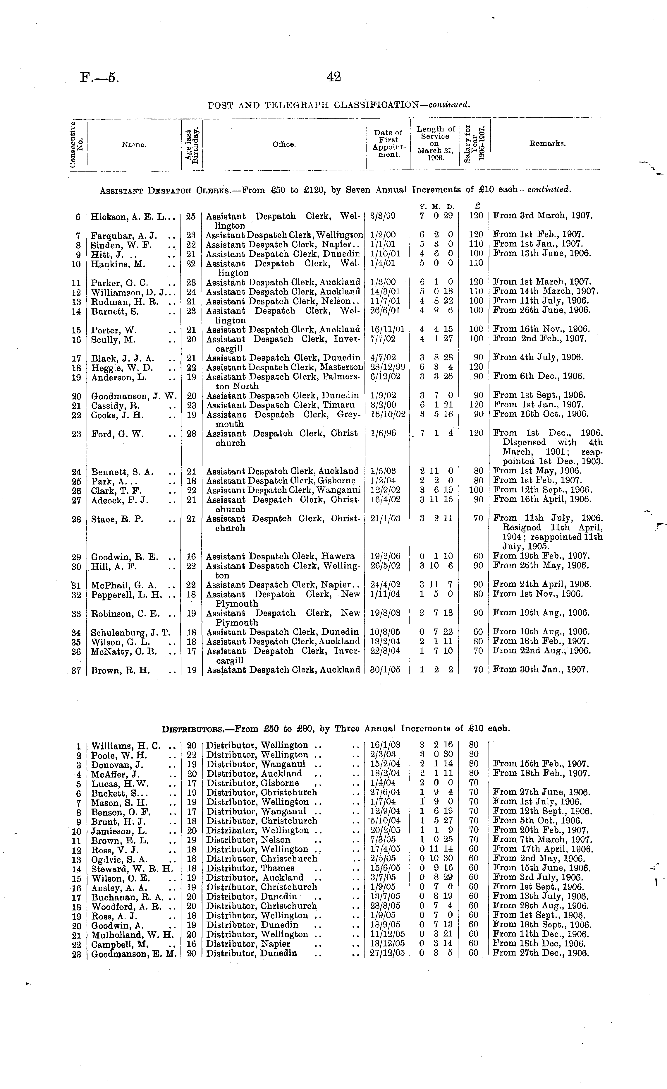 id a 8 Name. as Appoint- Ma - S1) ment 1906. J j- o ""i* Remarks. CO - j Assistant Despat rcH Ci Ilebks. —From £50 to £120, by Seven Annual Increment: of £10 each—continued. 'OH I 6 Hiokson, A. E. L... 25 25 Y. M. D. Assistant Despatoh Clerk, Wei- 3/3/99 7 0 29 lington Assistant Despatch Clerk, Wellington 1/2/00 6 2 0 Assistant Despatoh Clerk, Napier.. 1/1/01 5 3 0 Assistant Despatch Clerk, Dunedin 1/10/01 4 6 0 Assistant Despatch Clerk, Wei- 1/4/01 5 0 0 lington Assistant Despatch Clerk, Auckland 1/3/00 6 10 Assistant Despatch Clerk, Auckland 14/3/01 5 0 18 Assistant Despatch Clerk, Nelson.. 11/7/01 4 8 22 Assistant Despatch Clerk, Wei- 26/6/01 4 9 6 lington Assistant Despatch Clerk, Auckland 16/11/01 4 4 15 Assistant Despatch Clerk, Inver- 7/7/02 4 1 27 cargill Assistant Despatch Clerk, Dunedin 4/7/02 3 8 28 Assistant Despatch Clerk, Mastertor. 28/12/99 6 3 4 Assistant Despatch Clerk, Palmers- 6/12/02 .3 3 26 ton North Assistant Despatch Clerk, DuneJin 1/9/02 3 7 0 Assistant Despatch Clerk, Timaru 8/2/00 6 1 21 Assistant Despatch Clerk, Grey- 16/10/02 3 5 16 mouth Assistant Despatoh Clerk, Christ- 1/6/96 7 14 ohurch £ 120 From 3rd March, 1907. 6 7 8 9 10 7 8 9 10 Farquhar, A. J. Sinden, W. F. Hitt, J. .. Hankins, M. 23 22 21 22 23 22 21 22 120 From 1st Feb., 1907. 110 From 1st Jan., 1907. 100 From 13th June, 1906. 110 11 12 13 14 11 12 13 14 Parker, G. C. Williamson, D. J... Eudman, H. R. Burnett, S. 23 24 21 23 23 24 21 23 120 From 1st March, 1907. 110 From 14 th March, 3907. 100 From 11th July, 1906. 100 From 26th June, 1906. 15 16 15 16 Porter, W. Scully, M. 21 20 21 20 100 From 16th Nov., 1906. 100 From 2nd Feb., 1907. 17 18 19 17 18 19 Black, J. J. A. Heggie, W. D. Anderson, L. 21 22 19 21 22 19 90 From 4th July, 1906. 120 90 From 6th Dec, 1906. 20 21 22 20 21 22 Goodmanson, J. W. Cassidy, R. Cocks, J. H. 20 23 19 20 23 19 90 From 1st Sept., 1906. 120 From 1st Jan., 1907. 90 From 16th Oct., 1906. 23 23 24 25 26 27 Ford, G. W. Bennett, S. A. Park, A. .. Clark, T. F. Adcock, F. J. 28 28 21 18 22 21 Assistant Despatch Clerk, Auckland 1/5/03 2 110 Assistant Despatch Clerk, Gisborne 1/2/04 2 2 0 Assistant Despatch Clerk, Wanganui 12/9/02 3 6 19 Assistant Despatch Clerk, Christ 16/4/02 3 11 15 church Assistant Despatch Clerk, Christ- ! 21/1/03 3 2 11 churoh 120 From 1st Dec, 1906. Dispensed with 4th March, 1901; reappointed 1st Dec, 1903. 80 From 1st May, 1906. 80 From 1st Feb., 1907. 100 From 12th Sept., 1906, 90 From 16th April, 1906. 24 25 26 27 21 18 22 21 80 80 100 90 28 28 29 30 Stace, R. P. Goodwin, R. E. Hill, A. F. 21 16 22 21 Assistant Despatoh Clerk, Hawera 19/2/06 0 1 10 Assistant Despatch Clerk, Welling- 26/5/02 3 10 6 ton Assistant Despatch Clerk, Napier.. 24/4/02 3 11 7 Assistant Despatch Clerk, New 1/11/04 15 0 Plymouth Assistant Despatch Clerk, New 19/8/03 2 7 13 Plymouth Assistant Despatch Clerk, Dunedin 10/8/05 0 7 22 Assistant Despatch Clerk, Auckland 18/2/04 2 1 11 Assistant Despatch Clerk, Inver- 22/8/04 1 7 10 cargill Assistant Despatch Clerk, Auckland 30/1/05 12 2 70 From 11th July, 1906. Eesigned 11th April, 1904; reappointed 11th July, 1905. 60 From 19th Feb., 1907. 90 From 26th May, 1906. 70 29 30 16 22 60 90 '31 32 '31 32 McPhail, G. A. .. Pepperell, L. H. 22 18 22 18 90 80 90 From 24th April, 1906. 80 From 1st Nov., 1906. 33 33 Robinson, C. E. 19 19 90 90 From 19th Aug., 1906. 34 35 36 34 35 36 Schulenburg, J. T. Wilson, G. L. McNatty, C. B. 18 18 17 18 18 17 60 80 70 60 From 10th Aug., 1906. 80 From 18th Feb., 1907. 70 From 22nd Aug., 1906. 37 37 Brown, R. H. 19 19 70 70 From 30th Jan., 1907. Disa TBIBU1 1IB1 itobs. —From £50 to £80, by Three Annual Increments c Distributor, Wellington .. .. 16/1/03 3 2 16 Distributor, Wellington .. .. 2/3/03 3 0 30 Distributor, Wanganui .. .. 15/2/04 2 1 14 Distributor, Auckland .. .. 18/2/04 2 111 Distributor, Gisborne .. .. 1/4/04 2 0 0 Distributor, Christchurch .. 27/6/04 19 4 Distributor, Wellington .. .. 1/7/04 19 0 Distributor, Wanganui .. .. 12/9/04 1 6 19 Distributor, Christchurch .. 5/10/04 j 1 5 27 Distributor, Wellington .. .. 20/2/05 119 Distributor, Nelson .. .. 7/3/05 1 0 25 Distributor, Wellington .. .. 17/4/05 0 11 14 Distributor, Ohristchurch .. 2/5/05 0 10 30 Distributor, Thames .. .. 15/6/05 0 9 16 Distributor, Auckland .. .. 3/7/05 0 8 29 Distributor, Christchurch .. 1/9/05 0 7 0 Distributor, Dunedin .. .. 13/7/05 0 8 19 Distributor, Christchurch .. 28/8/05 0 7 4 Distributor, Wellington .. .. 1/9/05 0 7 0 Distributor, Dunedin .. .. 18/9/05 0 7 13 Distributor, Wellington .. .. 11/12/05 0 3 21 Distributor, Napier .. .. 18/12/05 0 3 14 Distributor, Dunedin .. .. 27/12/05 0 3 5 if £10 f £10 each. 8(1 1 2 3 i 5 6 7 8 9 10 11 12 13 14 15 16 17 18 19 20 21 22 23 1 2 3 4 5 6 7 8 9 10 11 12 13 14 15 16 17 18 19 20 21 22 23 Williams, H. C. .. Poole, W. H. Donovan, J. MoAffer, J. Lucas, H. W. Buckett, S Mason, S. H. Benson, 0. F. Brunt, H. J. Jamieson, L. Brown, E. L. Ross, V. J. Ogilvie, S. A. Steward, W. R. H. Wilson, C. E. Ansley, A. A. Buchanan, R. A. Woodford, A. R. .. Ross, A.J. Goodwin, A. Mulholland, W. H. Campbell, M. Goodmanson, E. M. 20 22 19 20 17 19 19 17 18 20 19 18 18 18 19 19 20 20 18 19 20 16 20 20 22 19 20 17 19 19 17 18 20 19 18 18 18 19 19 20 20 18 19 20 16 20 80 80 80 80 70 70 70 70 70 70 70 60 60 60 60 60 60 00 60 60 60 60 60 80 80 From 15th Feb., 1907. 80 From 18th Feb., 1907. 70 70 From 27th June, 1906. 70 From 1st July, 1906. 70 From 12th Sept., 1906. 70 From 5th Oct., 1906. 70 From 20th Feb., 1907. 70 From 7th March, 1907. 60 From 17th April, 1906. 60 From 2nd May, 1906. 60 From 15th June, 1906. 60 From 3rd July, 1906. 60 From 1st Sept., 1906. 60 From 13th July, 1906. 60 From 28th Aug., 1906. 60 From 1st Sept., 1906. 60 From 18th Sept., 1906. 60 From 11th Dec, 1906. 60 From 18th Dec, 1906. 60 From 27th Dec, 1906.
