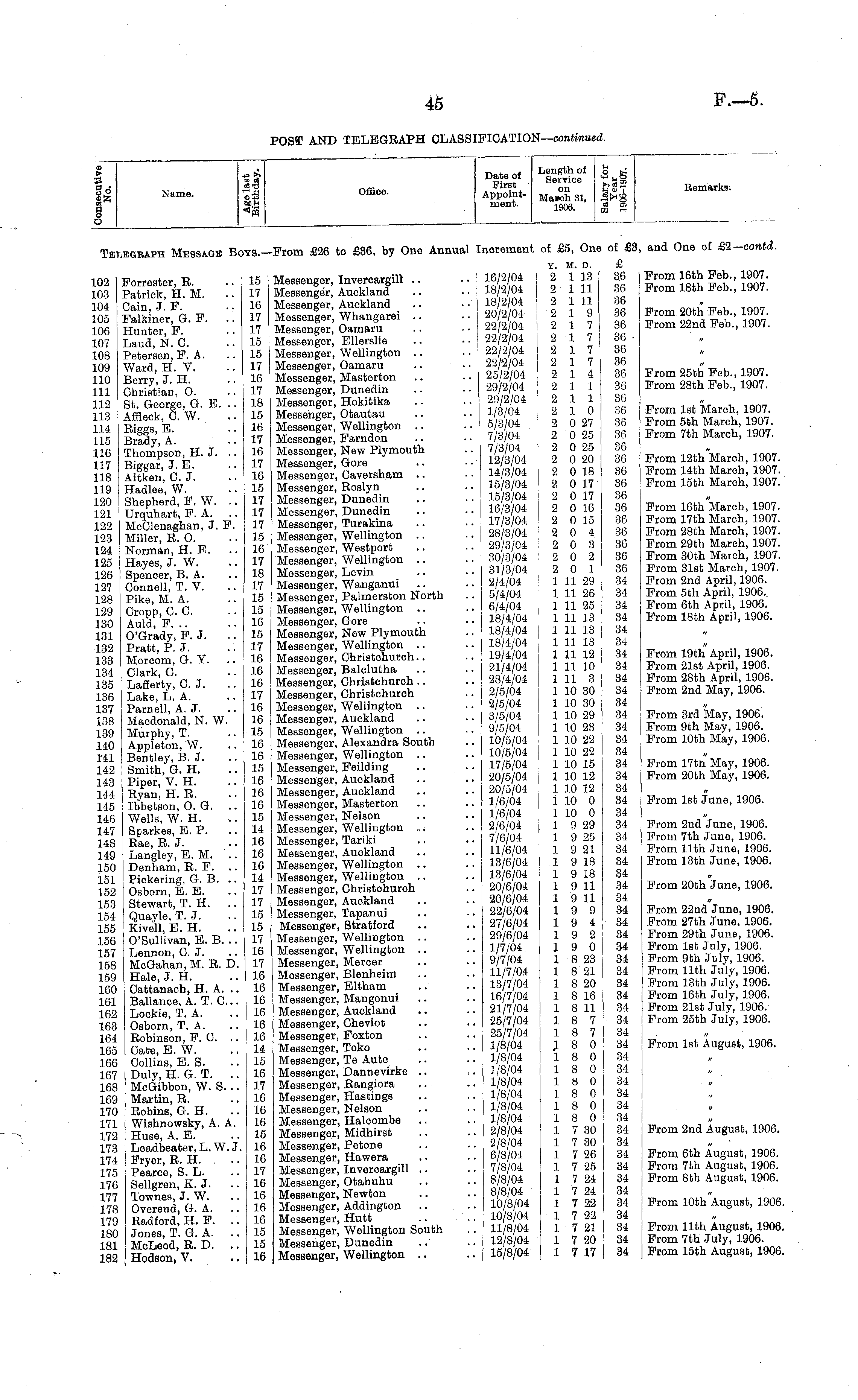 Name. •I §1 Offloe. _ . . Length of CO *H Remarks. ■From £26 to £36, by One Annual '. inorement. of £5, Oni of £3 and One of £2— contd. Tet KBGBAPH Message Bo iys.- £ 36 36 36 36 36 36 36 36 36 36 30 36 36 36 36 36 36 36 36 36 36 36 36 36 36 34 34 34 34 34 34 34 34 34 34 34 34 34 34 34 34 34 34 34 34 34 34 34 34 34 34 34 34 34 34 34 34 34 34 34 34 34 34 34 34 34 34 34 34 34 34 34 31 34 34 34 34 34 34 34 34 102 103 104 105 106 107 108 109 110 111 112 113 114 115 116 117 118 119 120 i 121 122 123 124 125 126 127 128 129 130 131 132 133 134 135 136 137 138 139 140 1'41 142 143 144 145 146 147 148 149 150 151 152 153 154 155 156 157 158 159 160 161 162 163 164 165 166 167 168 169 170 171 172 173 174 175 176 177 178 179 180 181 182 Forrester, R. Patrick, H. M. Cain, J. F. Falkiner, G. F. Hunter, F. Laud, N. C. Petersen, F. A. Ward, H. V. Berry, J. H. Christian, O. St. George, G. E. .. Affleck, C. W. Riggs, E. Brady, A. .. I Thompson, H. J. .. ! Biggar, J.E. Aitken, C. J. Hadlee, W. i Shepherd, F. W. Urquhart, F. A. McClenaghan, J. F. Miller, R. 0. Norman, H. E. Hayes, J. W. Spencer, B. A. Connell, T. V. Pike, M. A. Cropp, C. C. Auld, F. .. O'Grady, F. J. Pratt, P. J. Morcom, G. Y. Clark, C. Lafferty, C. J. j Lake, L. A. J Parnell, A. J. Macdonald, N. W. Murphy, T. Appleton, W. Bentley, B. J. Smith, G. H. ! Piper, V. H. Ryan, H. R. Ibbetson, 0. G. Wells, W. H. I Sparkes, E. P. Rae, R. J. Langley, E. M. Denham, R. F. .. Pickering, G. B. Osborn, E. E. Stewart, T. H. .. Quayle, T. J. Kivell, E. H. O'Sullivan, E. B. .. Lennon, C. J. McGahan, M. R. D. Hale, J. H. Cattanach, H. A. Ballance, A. T. C... Lockie, T. A. Osborn, T. A. Robinson, F. C. .. Gate, E. W. Collins, E. S. Duly, H. G. T. .. McGibbon, W. S. .. Martin, R. j Robins, G. H. I Wishnowsky, A. A. Huse, A. E. Leadbeater, L.W.J. Fryer, R. H. Pearce, S. L. Sellgren, K. J. Townes, J. W. Overend, G. A. i Radford, H. F. i Jones, T. G. A. MoLeod, R. D. Hodson, V. 15 17 16 17 17 15 15 17 16 17 18 15 16 17 16 17 16 15 17 17 17 15 16 17 18 17 15 15 16 15 17 16 16 16 17 16 16 15 16 16 15 16 16 16 15 14 16 16 16 14 17 17 15 15 17 16 17 16 16 16 16 16 16 ! 14 15 16 17 16 16 16 15 16 16 17 16 16 16 16 15 15 16 Messenger, Inveroargill Messenger, Auckland Messenger, Auckland .. Messenger, Whangarei Messenger, Oamaru Messenger, Ellerslie Messenger, Wellington Messenger, Oamaru .. Messenger, Masterton Messenger, Dunedin Messenger, Hokitika Messenger, Otautau Messenger, Wellington Messenger, Farndon Messenger, New Plymouth Messenger, Gore Messenger, Oaversham Messenger, Roslyn Messenger, Dunedin I Messenger, Dunedin Messenger, Turakina Messenger, Wellington Messenger, Westport Messenger, Wellington Messenger, Levin Messenger, Wanganui Messenger, Palmerston North Messenger, Wellington Messenger, Gore Messenger, New Plymouth Messenger, Wellington Messenger, Christchurch.. Messenger, Balelutha Messenger, Christchuroh Messenger, Christohuroh Messenger, Wellington Messenger, Auckland Messenger, Wellington Messenger, Alexandra South Messenger, Wellington Messenger, Feilding Messenger, Auckland Messenger, Auckland Messenger, Masterton Messenger, Nelson Messenger, Wellington ,,. Messenger, Tariki Messenger, Auckland Messenger, Wellington Messenger, Wellington Messenger, Ghristohurch Messenger, Auckland Messenger, Tapanui Messenger, Stratford Messenger, Wellington Messenger, Wellington Messenger, Meroer Messenger, Blenheim Messenger, Eltham Messenger, Mangonui Messenger, Auckland Messenger, Cheviot Messenger, Foxton Messenger, Toko Messenger, Te Aute Messenger, Dannevirke Messenger, Rangiora Messenger, Hastings Messenger, Nelson Messenger, Halcombe Messenger, Midhirst Messenger, Petone Messenger, Hawera _ Messenger, Invercargill Messenger, Otahuhu Messenger, Newton Messenger, Addington Messenger, Hutt Messenger, Wellington South Messenger, Dunedin Messenger, Wellington .. 16/2/04 18/2/04 18/2/04 20/2/04 22/2/04 22/2/04 22/2/04 22/2/04 25/2/04 29/2/04 29/2/04 ; 1/3/04 5/3/04 7/3/04 7/3/04 ! 12/3/04 14/3/04 15/3/04 1 15/3/04 16/3/04 ! 17/3/04 I 28/3/04 i 29/3/04 30/3/04 i 31/3/04 i 2/4/04 5/4/04 6/4/04 i 18/4/04 J i 18/4/04 I 18/4/04 I ; 19/4/04 21/4/04 28/4/04 j 2/5/04 ! 2/5/04 : 3/5/04 9/5/04 10/5/04 i 10/5/04 I j 17/5/04 20/5/04 20/5/04 1/6/04 1/6/04 2/6/04 7/6/04 I 11/6/04 ; 13/6/04 I 13/6/04 20/6/04 20/6/04 22/6/04 ; 27/6/04 29/6/04 1/7/04 9/7/04 11/7/04 13/7/04 16/7/04 21/7/04 25/7/04 25/7/04 1/8/04 1/8/04 1/8/04 1/8/04 1/8/04 1/8/04 1/8/04 2/8/04 2/8/04 6/8/04 7/8/04 8/8/04 8/8/04 10/8/04 10/8/04 11/8/04 12/8/04 15/8/04 Y. M. D. 2 1 13 2 1 11 2 1 11 2 19 2 17 2 17 2 17 2 17 2 14 2 1 1 2 11 2 10 2 0 27 2 0 25 2 0 25 2 0 20 2 0 18 2 0 17 2 0 17 2 0 16 2 0 15 2 0 4 2 0 3 2 0 2 2 0 1 1 11 29 1 11 26 1 11 25 1 11 13 I 1 11 13 ! 1 11 13 1 11 12 1 11 10 1 11 3 1 10 30 1 10 30 1 10 29 1 10 23 j 1 10 22 i 1 10 22 1 10 15 1 10 12 1 10 12 1 10 0 1 10 0 : 1 9 29 1 9 25 1 9 21 1 9 18 1 9 18 1 9 11 1 9 11 ; 1 9 9 ' 1 9 4 19 2 19 0 1 8 23 1 8 21 1 8 20 1 8 16 1 8 11 18 7 18 7 18 0 18 0 18 0 18 0 1 8 0 18 0 18 0 1 7 30 1 7 30 1 7 26 1 7 25 1 7 24 1 7 24 1 7 22 i 1 7 22 1 7 21 1 7 20 1 7 17 From 16th Feb., 1907. From 18th Feb., 1907. From 20th Feb., 1907. From 22nd Feb., 1907. From 25th Feb., 1907. From 28th Feb., 1907. From 1st March, 1907. From 5th March, 1907. From 7th March, 1907. From 12th March, 1907. From 14th March, 1907. From 15th March, 1907. From 16th March, 1907. From 17th March, 1907. From 28th March, 1907. From 29th March, 1907. From 30th March, 1907. From 31st March, 1907. From 2nd April, 1906. From 5th April, 1906. From 6th April, 1906. From 18th April, 1906. From 19th April, 1906. From 21st April, 1906. From 28th April, 1906. From 2nd May, 1906. From 3rd May, 1906. From 9th May, 1906. From 10th May, 1906. From 17tn May, 1906. From 20th May, 1906. From 1st June, 1906. From 2nd June, 1906. From 7th June, 1906. From 11th June, 1906. From 13th June, 1906. From 20th June, 1906. From 22nd June, 1906. From 27th June, 1906. From 29th June, 1906. From 1st Ju