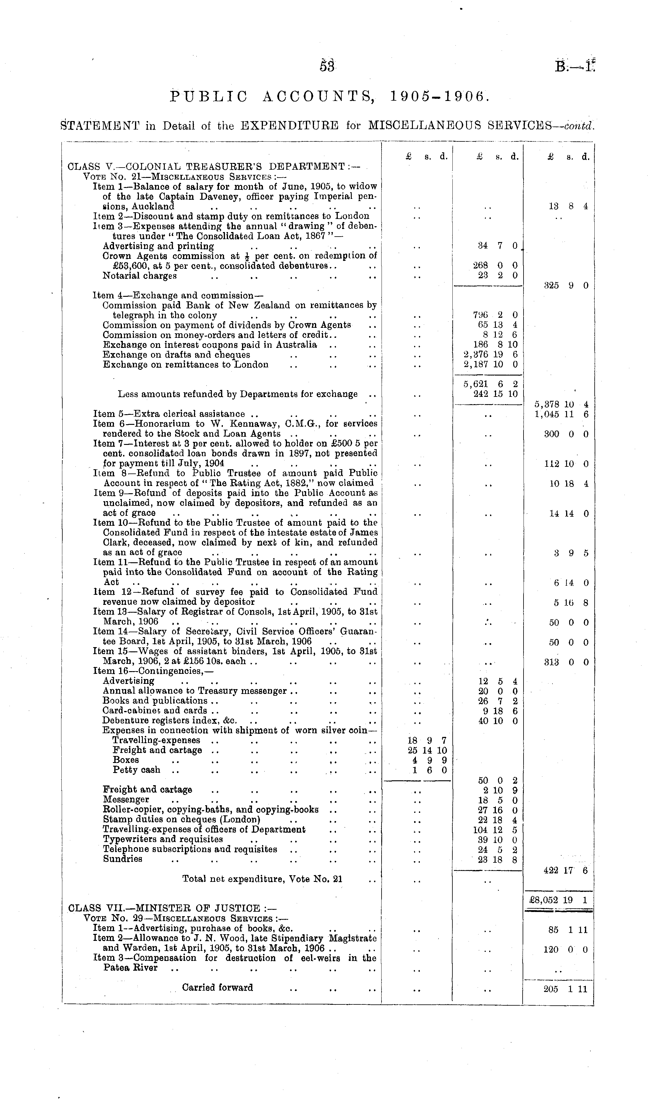 (LASS V.-COLONIAL TREASURER'S DEPARTMENT:— Vote No. 21 —Miscellaneous Services :— Item 1 —Balance of salary for month of June, 1905, to widow of the late Captain Daveney, officer paying Imperial pensions, Auckland Item 2—Discount and stamp duty on remittances to London Iiem 3—Expenses attending the annual "drawing " of debentures under " The Consolidated Loan Act, 1867 " — Advertising and printing Crown Agents commission at J per cent, on redemption of £53,600, at 5 per cent., consolidated debentures.. Notarial charges £ s. d. £ s. d. M s. d. 13 8 4 34 7 0 268 0 0 23 2 0 325 9 0 Item 4—Exchange and commission— Commission paid Bank of New Zealand on remittances by telegraph in the colony Commission on payment of dividends by Crown Agents Commission on money-orders and letters of credit.. Exchange on interest coupons paid in Australia Exchange on drafts and cheques Exchange on remittances to London 796 2 0 65 13 4 8 12 6 186 8 10 2,376 19 6 2,187 10 0 Less amounts refunded by Departments for exchange .. 5,621 6 2 242 15 10 Item 5—Extra clerical assistance Item 6 —Honorarium to W. Kennaway, C.M.G., for services rendered to the Stock and Loan Agents Item 7 —Interest at 3 per cent, allowed to holder on £500 5 per cent, consolidated loan bonds drawn in 1897, not presented for payment till July, 1904 Item 8—Refund to Public Trustee of amount paid Public Account in respect of " The Rating Act, 1882," now claimed Item 9 —Refund of deposits paid into the Public Account as unclaimed, now olaimed by depositors, and refunded as an act of grace Item 10—Refund to the Public Trustee of amount paid to the Consolidated Fund in respect of the intestate estate of James Clark, deceased, now claimed by next of kin, and refunded as an act of grace Item 11—Refund to the Public Trustee in respect of an amount paid into the Consolidated Fund on account of the Rating Aot .. Item 12—Refund of survey fee paid to Consolidated Fuad revenue now claimed by depositor Item 13—Salary of Registrar of Consols, 1st April, 1905, to 31st March, 1906 .. Item 14—Salary of Secretary, Civil Service Officers' Guarantee Board, 1st April, 1905, to 31st March, 1906 Item 15—Wages of assistant binders, 1st April, 1905, to 31st March, 1906, 2 at £156 10s. each Item 16—Contingencies,— Advertising Annual allowance to Treasury messenger Books and publications Card-cabinet and cards Debenture registers index, &c. Expenses in connection with shipment of worn silver coin— Travelling-expenses Freight and cartage Boxes .. .. .. .. ,. ,. Petty cash .. .. .. .. ,,. 5,378 10 4 1,045 11 6 300 0 0 112 10 0 10 18 4 14 14 0 3 9 5 6 14 0 5 16 8 50 0 0 50 0 0 313 0 0 12 5 4 20 0 0 26 Y 2 9 18 6 40 10 0 18 9 7 25 14 10 4 9 9 16 0 50 0 2 2 10 9 18 5 0 27 16 0 22 18 4 104 12 5 39 10 0 24 5 2 23 18 8 Freight and cartage Messenger Roller-copier, copying-baths, and oopying-books Stamp duties on cheques (London) Travelling-expenses of officers of Department Typewriters and requisites Telephone subscriptions and requisites Sundries Total net expenditure, Vote No. 21 422 17 6 iLASS VII.—MINISTER OF JUSTICE :— Vote No. 29 —Miscellaneous Services :— Item 1—Advertising, purchase of books, &c. Item 2—Allowance to J. N. Wood, late Stipendiary Magistrate and Warden, 1st April, 1905, to 31st March, 1906 Item 3—Compensation for destruction of eel-weirs in the Patea River £8,052 19 1 85 1 11 120 0 0 Carried forward 205 1 11