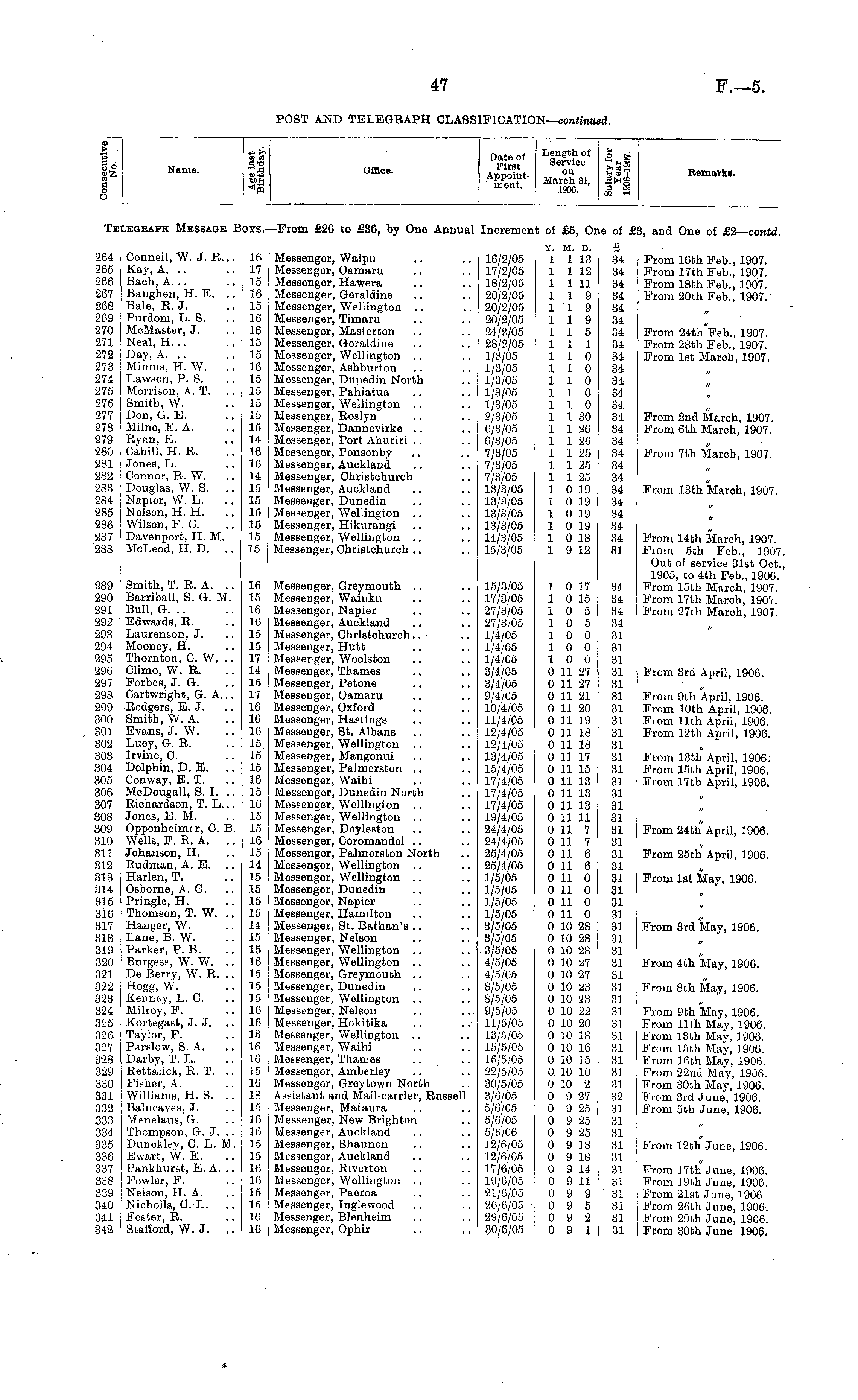 g h § O Name. Office. Date of First Appointment. Length of Service on March 81, 1906. 02 »H Remarks. Tβ: uegraph Message I )YS.--Prom £26 to £36, by One Annual Increment of £5, Oi ie of £! i, and One of £2— contd. !64 !65 !66 !67 !68 !69 !70 !71 !72 !73 !74 !75 !76 !77 !78 !79 !80 !81 !82 !83 !84 j !85 I 186 187 !88 Oonnell, W. J. R... Kay, A Bach, A... Baughen, H. E. Bale, R. J. Purdom, L. S. McMaster, J. Neal, H. .. Day, A. .. Minnis, H. W. .. Lawson, P. S. Morrison, A. T. Smith, W. Don, G. E. Milne, E. A. Ryan, E. Cahill, H. R. Jones, L. Connor, R. W. Douglas, W. S. Napier, W. L. Nelson, H. H. Wilson, P. 0. Davenport, H. M. McLeod, H. D. 16 17 15 16 15 16 16 15 15 16 15 15 15 15 15 14 16 16 U 15 15 15 15 15 15 Messenger, Waipu - Messenger, Oamaru Messenger, Hawera Messenger, Geraldine Messenger, Wellington Messenger, Timaru Messenger, Mast erton Messenger, Geraldine Messenger, Wellington Messenger, Ashburton Messenger, Dunedin North Messenger, Pahiatua Messenger, Wellington Messenger, Roslyn Messenger, Dannevirke Messenger, Port Ahuriri Messenger, Ponsonby Messenger, Auckland Messenger, Ghristehuroh Messenger, Auckland Messenger, Dunedin Messenger, Wellington Messenger, Hikurangi Messenger, Wellington Messenger, Christchurch 16/2/05 , 17/2/05 18/2/05 20/2/05 20/2/05 20/2/05 24/2/05 28/2/05 1/3/05 1/3/05 1/3/05 1/3/05 1/3/05 2/3/05 6/3/05 6/3/05 7/3/05 7/3/05 7/3/05 13/3/05 13/3/05 13/3/05 13/3/05 14/3/05 15/3/05 Y. M. D. 1 1 13 1 1 12 1 1 11 119 119 119 115 1 1 1 110 110 110 110 110 1 1 30 1 1 26 1 1 26 1 1 25 1 1 25 1 1 25 1 0 19 1 0 19 1 0 19 1 0 19 1 0 18 1 9 12 £ 34 34 34 34 34 34 34 34 34 34 34 34 34 34 34 34 34 34 34 34 34 34 34 34 31 From 16th Feb., 1907. From 17th Feb., 1907. From 18th Feb., 1907. From 20th Feb., 1907. From 24th Feb., 1907. From 28th Feb., 1907. From 1st March, 1907. From 2nd March, 1907. From 6th March, 1907. From 7th March, 1907. From 13th March, 1907. Smith, T. R. A. Barriball, S. G. M. Bull, G. .. Edwards, R. Laurenson, J. Mooney, H. Thornton, C. W. .. Climo, W. R. Forbes, J. G. Cartwright, G. A... Rodgers, E. J. Smith, W. A. Evans, J. W. Lucy, G. R. Irvine, 0. Dolphin, D. E. Conway, E. T. McDougall, S. I. Richardson, T. L... Jones, E. M. Oppenheimtr, C. B. Wells, F. R. A. Johanson, H. Rudman, A. E. Harlen, T. Osborne, A. G. Pringle, H. Thomson, T. W. Hanger, W. Lane, B. W. Parker, P. B. Burgess, W. W. .. De Berry, W. R. Hogg, W. Kenney, L. C. Milroy, F. Kortegast, J. J. Taylor, F. Parslow, S. A. Darby, T. L. Rettalick, R. T. Fisher, A. Williams, H. S. .. Balncaves, 3. Menelaus, G. Thompson, G. J. Dunckley, C. L. M. Ewart, W. E. Pankhurst, E. A. .. Fowler, F. Nelson, H. A. Nicholls, C. L. Foster, R. Stafford, W. J, ,. Messenger, Greymouth Messenger, Waiuku Messenger, Napier Messenger, Auckland Messenger, Christchurch.. Messenger, Hutt Messenger, Woolston Messenger, Thames Messenger, Petone Messenger, Oamaru Messenger, Oxford Messenger, Hastings Messenger, St. Albans Messenger, Wellington Messenger, Mangonui Messenger, Palmerston Messenger, Waihi Messenger, Dunedin North Messenger, Wellington Messenger, Wellington Messenger, Doyleston Messenger, Coromandel Messenger, Palmerston North Messenger, Wellington Messenger, Wellington Messenger, Dunedin Messenger, Napier Messenger, Hamilton Messenger, St. Bathan's Messenger, Nelson Messenger, Wellington Messenger, Wellington Messenger, Greymouth Messenger, Dunedin Messenger, Wellington Messenger, Nelson Messenger, Hokitika Messenger, Wellington Messenger, Waihi Messenger, Thames Messenger, Amberley Messenger, Greytown North Assistant and Mail-carrier, Russell Messenger, Mataura Messenger, New Brighton Messenger, Auckland Messenger, Shannon Messenger, Auckland Messenger, Riverton Messenger, Wellington Messenger, Paeroa Messenger, Inglewood Messenger, Blenheim Messenger, Ophir .. ,, 15/3/05 17/3/05 27/3/05 27/3/05 1/4/05 1/4/05 1/4/05 3/4/05 3/4/05 9/4/05 10/4/05 11/4/05 12/4/05 12/4/05 13/4/05 15/4/05 17/4/05 17/4/05 17/4/05 19/4/05 24/4/05 24/4/05 25/4/05 25/4/05 1/5/05 1/5/05 1/5/05 1/5/05 3/5/05 3/5/05 3/5/05 4/5/05 4/5/05 8/5/05 8/5/05 9/5/05 11/5/05 13/5/05 15/5/05 16/5/05 22/5/05 30/5/05 3/6/05 5/6/05 5/6/05 5/6/06 12/6/05 12/6/05 17/6/05 19/6/05 21/6/05 26/6/05 29/6/05 30/6/05 1 0 17 1 0 15 10 5 10 5 10 0 10 0 10 0 0 11 27 0 11 27 0 11 21 0 11 20 0 11 19 0 11 18 0 11 18 0 11 17 0 11 15 0 11 13 0 11 13 0 11 13 0 11 11 0 11 7 0 11 7 0 11 6 0 11 6 0 11 0 0 11 0 0 11 0 0 11 0 0 10 28 0 10 28 0 10 28 0 10 27 0 10 27 0 10 23 0 10 23 0 10 22 0 10 20 0 10 18 0 10 16 0 10 15 0 10 10 0 10 2 0 9 27 0 9 25 0 9 25 0 9 25 0 9 18 0 9 18 0 9 14 0 9 11 0 9 9 0 9 5 0 9 2 0 9 1 34 34 34 34 31 31 31 31 31 31 31 31 31 31 31 31 31 31 31 31 31 31 31 31 31 31 31 81 31 31 31 31 31 31 31 31 31 31 31 31 31 31 32 31 31 31 31 31 31 31 31 I 31 j 31 31 From 14th March, 1907. From 5th Feb., 1907 Out of service 31st Oct. 1905, to 4th Feb., 1906. From 15th March, 1907. From 17th March, 1907. From 27th March, 1907. >89 !90 !91 !92 !93 !94 S9S !96 !97 !98 299 iOO SOI !02 SOS S04 505 106 S07 S08 S09 110 ill !12 il8 {14 516 316 yj 7 518 519 520 521 522 323 324 m 320 m 328 329 380 33.1 332 333 334 335 330 337 338 339 540 341 342 16 15 16 16 15 15 17 14 15 17 16 16 16 15 15 15 16 15 16 15 15 16 15 14 15 15 15 15 14 15 15 .16 15 15 15 16 16 13 16 16 15 16 18 15 1G 16 15 15 16 16 15 15 16 16 From 3rd April, 1906. From 9th April, 1906. From 10th April, 1906. From 11th April, 1906. From 12th April, 1906. From 13th April, 1906. From 15lh April, 1906. From 17th April, 1906. From 24th April, 1906. From 25th" April, 1906. From 1st May, 1906. u From 3rd May, 1906. From 4th May, 1906. From 8th May, 1906. From 9th May, 1906. From 11th May, 1906. From 13th May, 1906. From 15th May, 1906. From 16th May, 1906. From 22nd May, 1906. From 30th May, 1906. From 3rd June, 1906. From 5th June, 1906. From 12th June, 1906. From 17th June, 1906. From 19th June, 1906. From 21st June, 1906. From 26th June, 1906. From 29th June, 1906. From 30th June 1906.