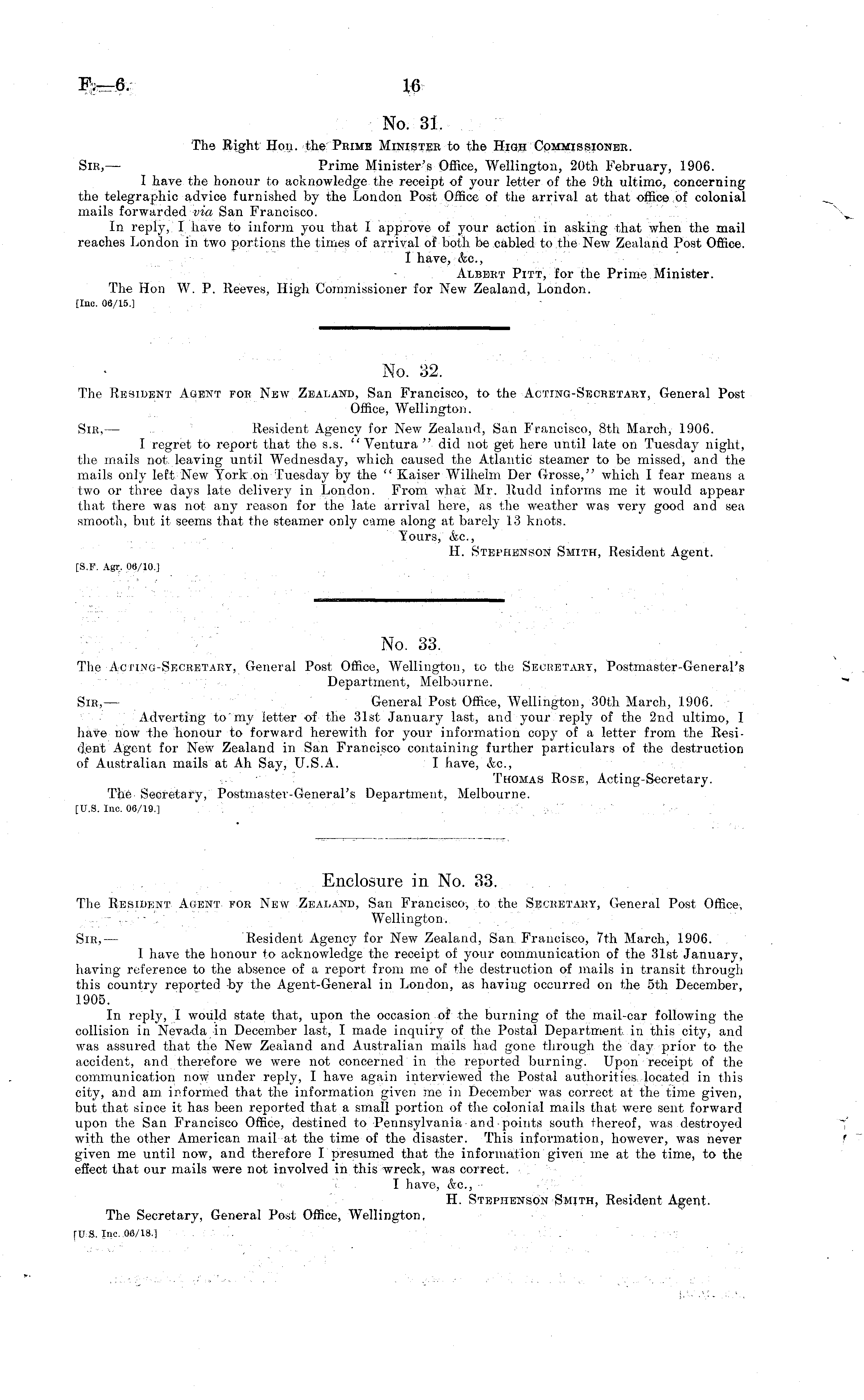 No. 33. The Acting-Secretary, General Post Office, Wellington, to the Secretary, Postmaster-General's Department, Melbourne. Sir, — General Post Office, Wellington, 30th March, 1906. Adverting to'my letter of the 31st January last, and your reply of the 2nd ultimo, I have now the honour to forward herewith for your information copy of a letter from the Resident Agent for New Zealand in San Francisco containing further particulars of the destruction of Australian mails at Ah Say, U.S.A. I have, &c, Thomas Rose, Acting-Secretary. The Secretary, Postmaster-General's Department, Melbourne. [U.S. Inc. 06/19.] : ' ;. "