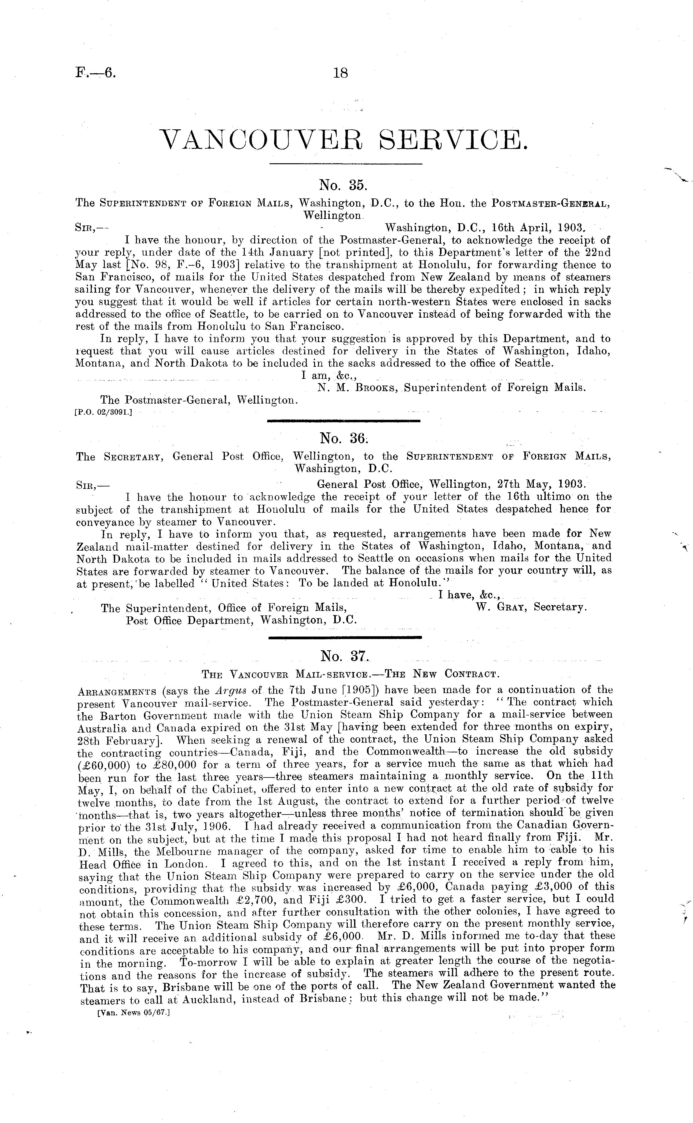 No. 37. The Vancouver Mail-service.—The New Contract. Arrangements (says the Argus of the 7th June [1905]) have been made for a continuation of the present Vancouver mail-service. The Postmaster-General said yesterday: "The contract which the Barton Government made with the Union Steam Ship Company for a mail-service between Australia and Canada expired on the 31st May [having been extended for three months on expiry, 28th February]. When seeking a renewal of the contract, the Union Steam Ship Company asked the contracting countries—Canada, Fiji, and the Commonwealth—to increase the old subsidy (£60,000) to £80,000 for a term of three years, for a service much the same as that which had been run for the last three years —three steamers maintaining a monthly service. On the. 11th May, I, on behalf of the Cabinet, offered to enter into a new contract at the old rate of subsidy for twelve months, to date from the Ist August, the contract to extend for a further period of twelve months—that is, two years altogether —unless three months' notice of termination should be given prior to'the 31st July, 1906. I had already received a communication from the Canadian Government on the subject,"but at the time I made this proposal I had not heard finally from Fiji. Mr. D. Mills, the Melbourne manager of the company, asked for time to enable him to cable to his Head Office in London. I agreed to this, and on the Ist instant I received a reply from him, saying that the Union Steam Ship Company were prepared to carry on the service under the old conditions, providing that the subsidy was increased by £6,000, Canada paying £3,000 of this amount, the Commonwealth £2,700, and Fiji £300. I tried to get a faster service, but I could not obtain this concession, and niter further consultation with the other colonies, I have agreed to these terms. The Union Steam Ship Company will therefore carry on the present monthly service, and it will receive an additional subsidy of £6,000. Mr. D. Mills informed me to-day that these conditions are acceptable to his company, and our final arrangements will be put into proper form in the morning. To-morrow I will be able to explain at greater length the course of the negotiations and the reasons for the increase of subsidy. The steamers will adhere to the present route. That is to say, Brisbane will be one of the ports of call. The New Zealand Government wanted the steamers to call at Auckland, instead of Brisbane: but this change will not be made." [Van. News 05/67.]