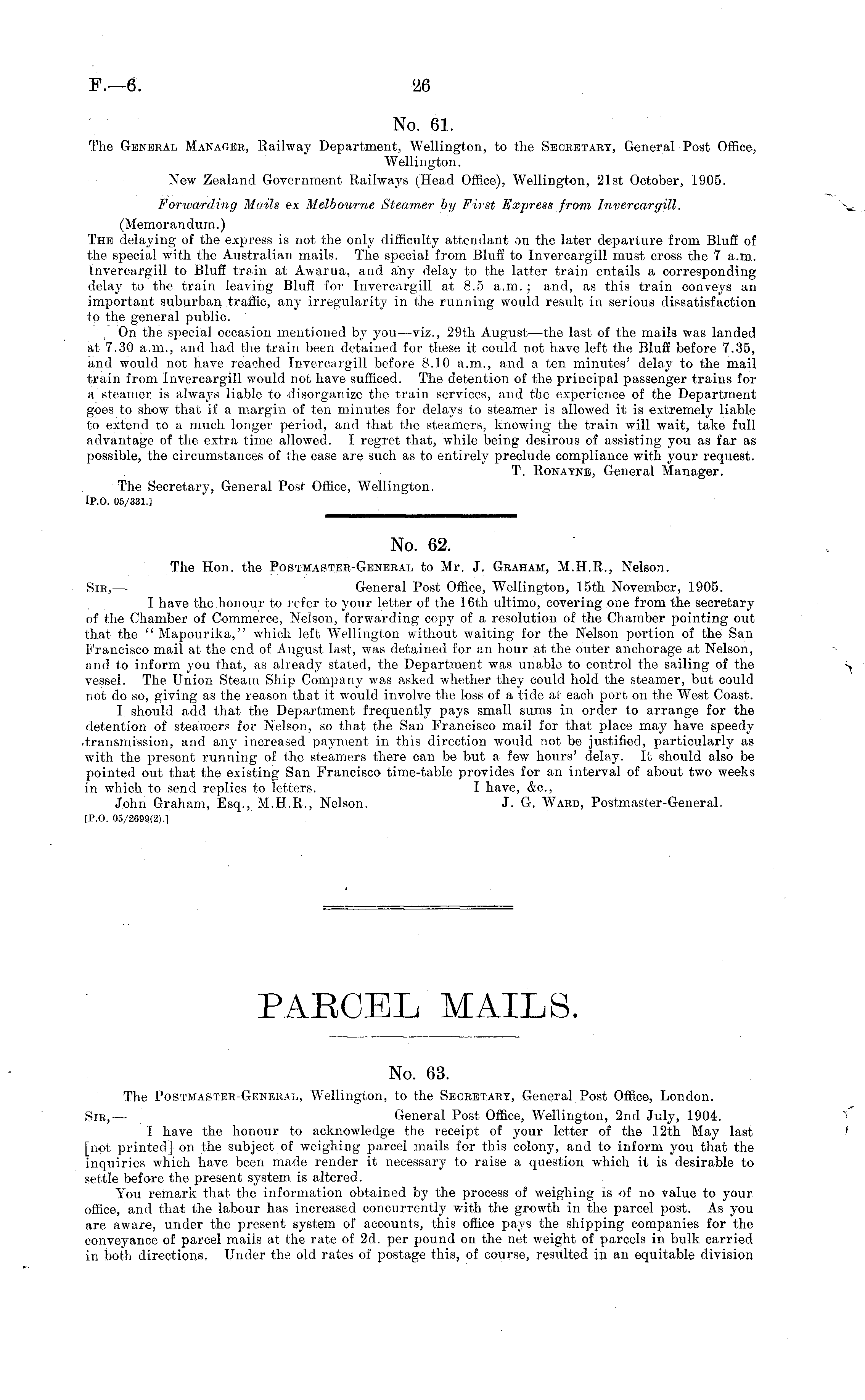 No. 63. The Postmaster-General, Wellington, to the Secretary, General Post Office, London. Sir,— General Post Office, Wellington, 2nd July, 1904. I have the honour to acknowledge the receipt of your letter of the 12th May last [not printed] on the subject of weighing parcel mails for this colony, and to inform you that the inquiries which have been made render it necessary to raise a question which it is desirable to settle before the present system is altered. You remark that the information obtained by the process of weighing is of no value to your office, and that the labour has increased concurrently with the growth in the parcel post. As you are aware, under the present system of accounts, this office pays the shipiping companies for the conveyance of parcel mails at the rate of 2d. per pound on the net weight of parcels in bulk carried in both directions, Under the old rates of postage this, of course, resulted in an equitable division