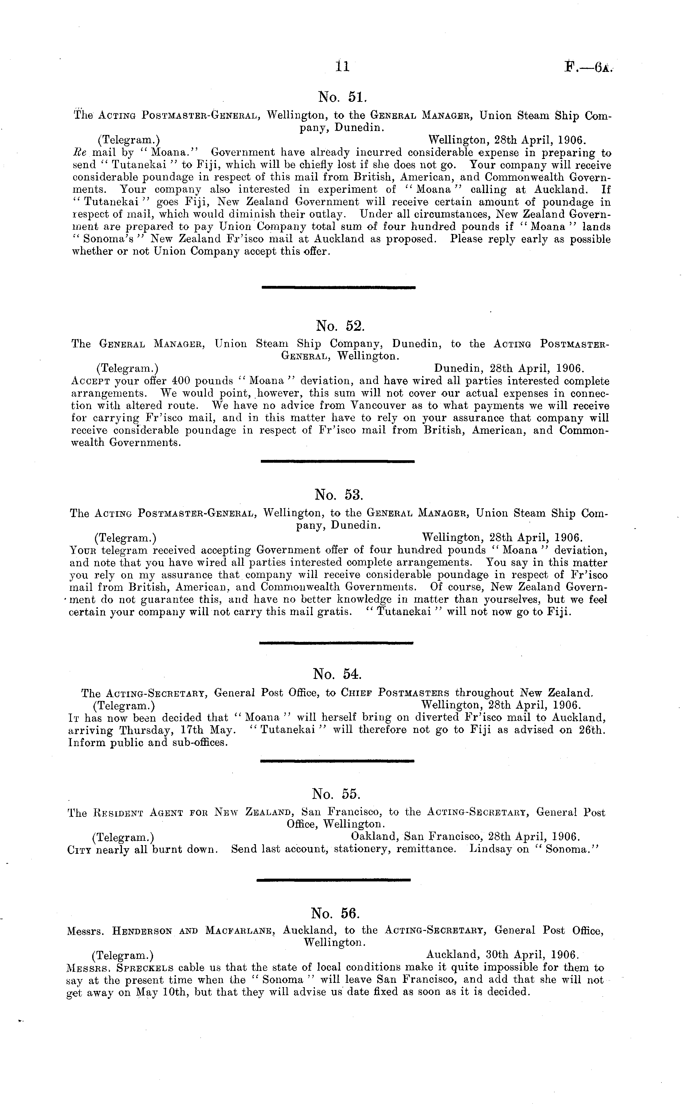 No. 51. The Acting Postmaster-General, Wellington, to the General Manager, Union Steam Ship Company, Dunedin. (Telegram.) Wellington, 28th April, 1906. Be mail by "Moana." Government have already incurred considerable expense in preparing to send " Tutanekai "to Fiji, which will be chiefly lost if she does not go. Your company will receive considerable poundage in respect of this mail from British, American, and Commonwealth Governments. Your company also interested in experiment of "Moana" calling at Auckland. If " Tutanekai " goes Fiji, New Zealand Government will receive certain amount of poundage in respect of mail, which would diminish their outlay. Under all circumstances, New Zealand Government are prepared to pay Union Company total sum of four hundred pounds if " Moana " lands " Sonoma's " New Zealand Fx'isco mail at Auckland as proposed. Please reply early as possible whether or not Union Company accept this offer.