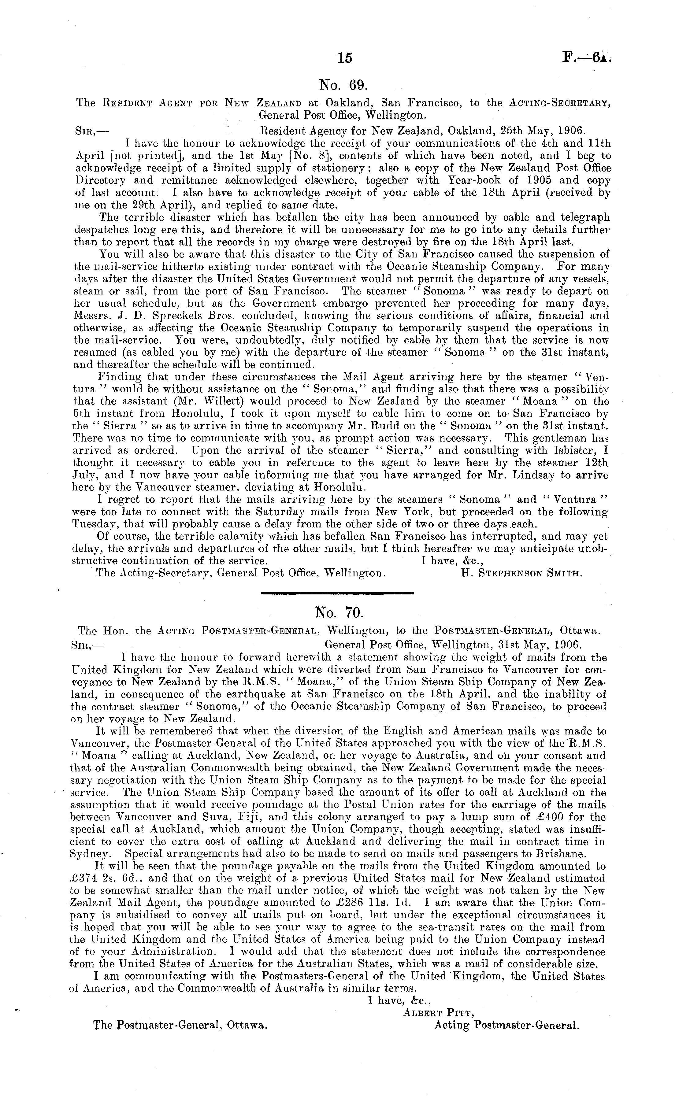 No. 69. The Resident Agent for New Zealand at Oakland, San Francisco, to the Acting-Secretary, General Post Office, Wellington. Sir, — Resident Agency for New Zealand, Oakland, 25th May, 1906. I have the honour to acknowledge the receipt of your communications of the 4th and 11th April [not printed], and the Ist May [No. B], contents of which have been noted, and I beg to acknowledge receipt of a limited supply of stationery; also a copy of the New Zealand Post Office Directory and remittance acknowledged elsewhere, together with Year-book of 1905 and copy of last account. I also have to acknowledge receipt of your cable of the 18th April (received by me on the 29th April), and replied to same date. The terrible disaster which has befallen the city has been announced by cable and telegraph despatches long ere this, and therefore it will be unnecessary for me to go into any details further than to report that all the records in my charge were destroyed by fire on the 18th April last. You will also be aware that this disaster to the City of San Francisco caused the suspension of the mail-service hitherto existing under contract with the Oceanic Steamship Company. For many days after the disaster the United States Government would not permit the departure of any vessels, steam or sail, from the port of San Francisco. The steamer " Sonoma " was ready to depart on her usual schedule, but as the Government embargo prevented her proceeding for many days, Messrs. J. D. Spreckels Bros, concluded, knowing the serious conditions of affairs, financial and otherwise, as affecting the Oceanic Steamship Company to temporarily suspend the operations in the mail-service. You were, undoubtedly, duly notified by cable by them that the service is now resumed (as cabled you by me) with the departure of the steamer " Sonoma " on the 31st instant, and thereafter the schedule will be continued. Finding that under these circumstances the Mail Agent arriving here by the steamer "Ventura " would be without assistance on the " Sonoma," and finding also that there was a possibility that the assistant (Mr. Willett) would proceed to New Zealand by the steamer "Moana" on the oth instant from Honolulu, I took it upon myself to cable him to come on to San Francisco by the " Sierra " so as to arrive in time to accompany Mr. Rudd on the " Sonoma " on the 31st instant. There was no time to communicate with you, as prompt action was necessary. This gentleman has arrived as ordered. Upon the arrival of the steamer " Sierra," and consulting with Isbister, I thought it necessary to cable you in reference to the agent to leave here by the steamer 12th July, and I now have your cable informing me that you have arranged for Mr. Lindsay to arrive here by the Vancouver steamer, deviating at Honolulu. I regret to report that the mails arriving here by the steamers " Sonoma " and " Ventura " were too late to connect with the Saturday mails from New York, but proceeded on the followingTuesday, that will probably cause a delay from the other side of two or three days each. Of course, the terrible calamity which has befallen San Francisco has interrupted, and may yet delay, the arrivals and departures of the other mails, but I think hereafter we may anticipate unobstructive continuation of the service. I have, &c, The Acting-Secretary, General Post Office, Wellington. H. Stephenson Smith.