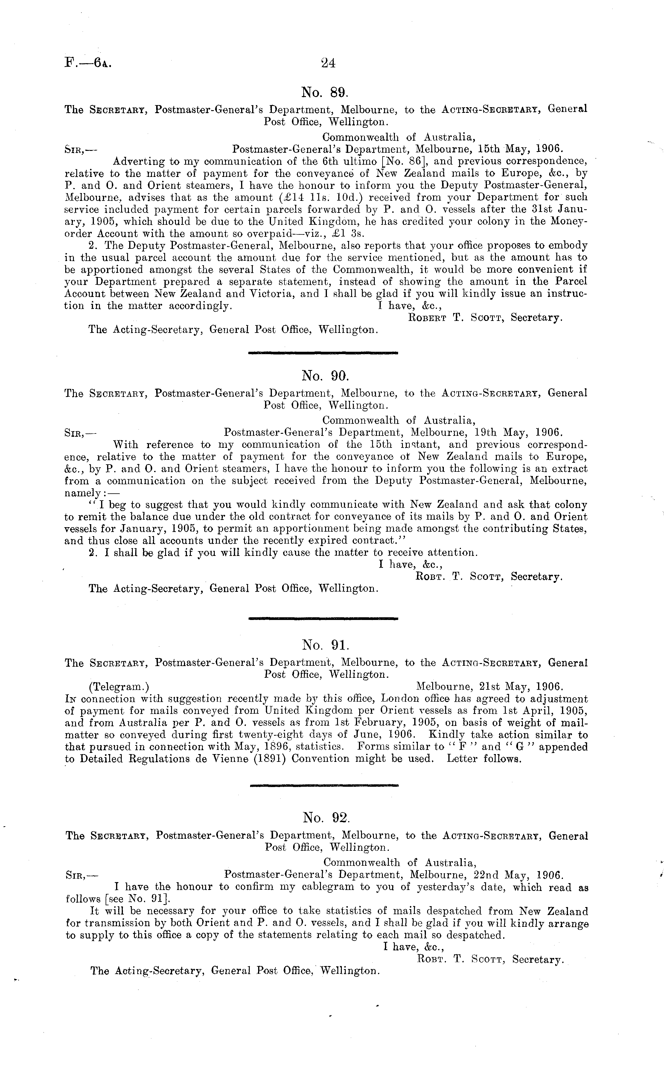 No. 90. The Secretary, Postmaster-General's Department, Melbourne, to the Acting-Secretary, General Post Office, Wellington. Commonwealth of Australia, Sir, — Postmaster-General's Department, Melbourne, 19th May, 1906. With reference to my communication of the 15th instant, and previous correspondence, relative to the matter of payment for the conveyance of New Zealand mails to Europe, &c, by P. and O. and Orient steamers, I have the honour to inform you the following is an extract from a communication on the subject received from the Deputy Postmaster-General, Melbourne, namely: — " I beg to suggest that you would kindly communicate with New Zealand and ask that colony to remit the balance due under the old contract for conveyance of its mails by P. and 0. and Orient vessels for January, 1905, to permit an apportionment being made amongst the contributing States, and thus close all accounts under the recently expired contract." 2. I shall be glad if you will kindly cause the matter to receive attention. I have, &c, Robt. T. Scott, Secretary. The Acting-Secretary, General Post Office, Wellington.