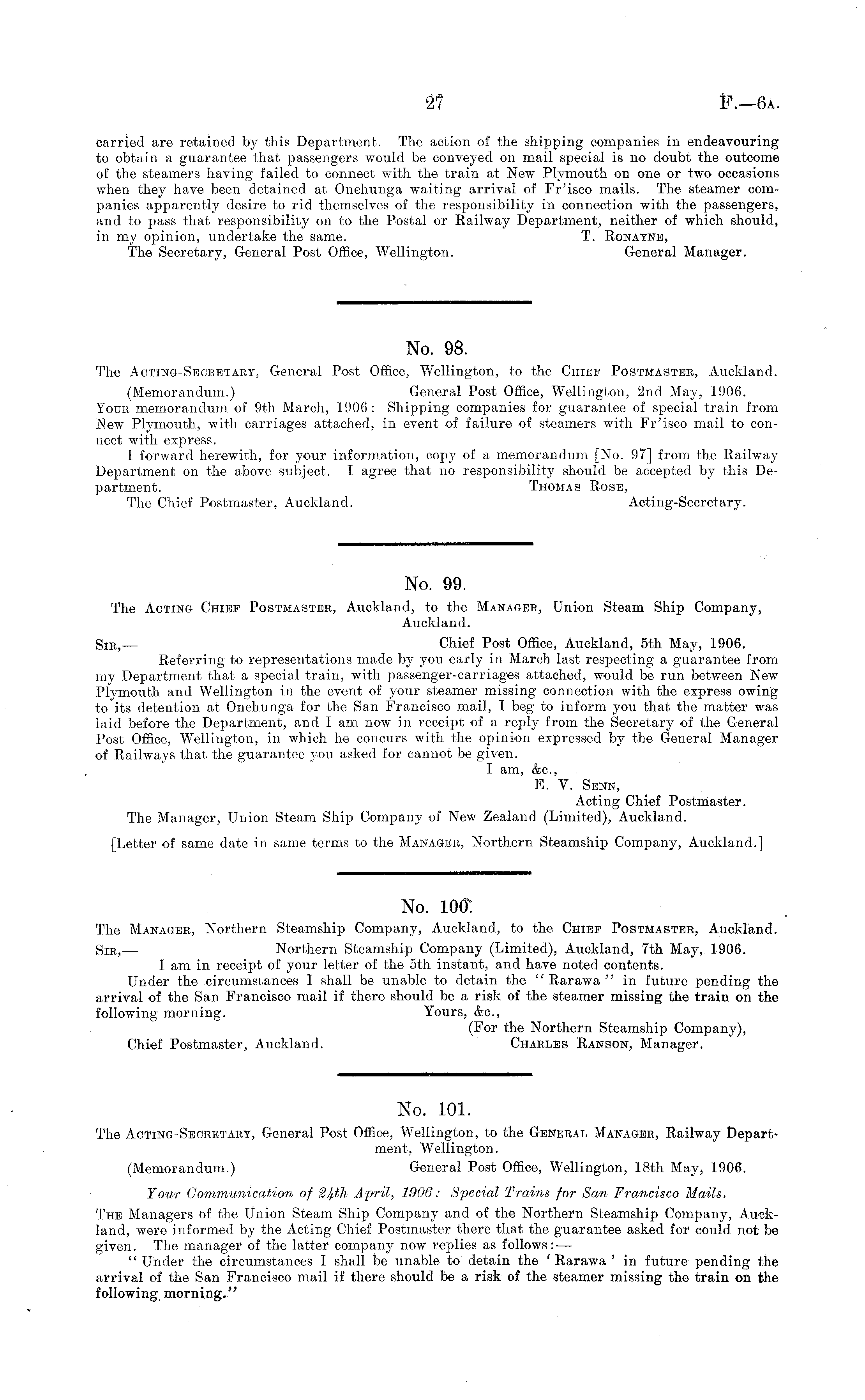 No. 99. The Acting Chief Postmaster, Auckland, to the Manager, Union Steam Ship Company, Auckland. Sir,— Chief Post Office, Auckland, sth May, 1906. Referring to representations made by you early in March last respecting a guarantee from my Department that a special train, with passenger-carriages attached, would be run between New Plymouth and Wellington in the event of your steamer missing connection with the express owing to its detention at Onehunga for the San Francisco mail, I beg to inform you that the matter was laid before the Department, and I am now in receipt of a reply from the Secretary of the General Post Office, Wellington, in which he concurs with the opinion expressed by the General Manager of Railways that the guarantee you asked for cannot be given. I am, &c, E. V. Senn, Acting Chief Postmaster. The Manager, Union Steam Ship Company of New Zealand (Limited), Auckland. [Letter of same date in same terms to the Manager, Northern Steamship Company, Auckland.]