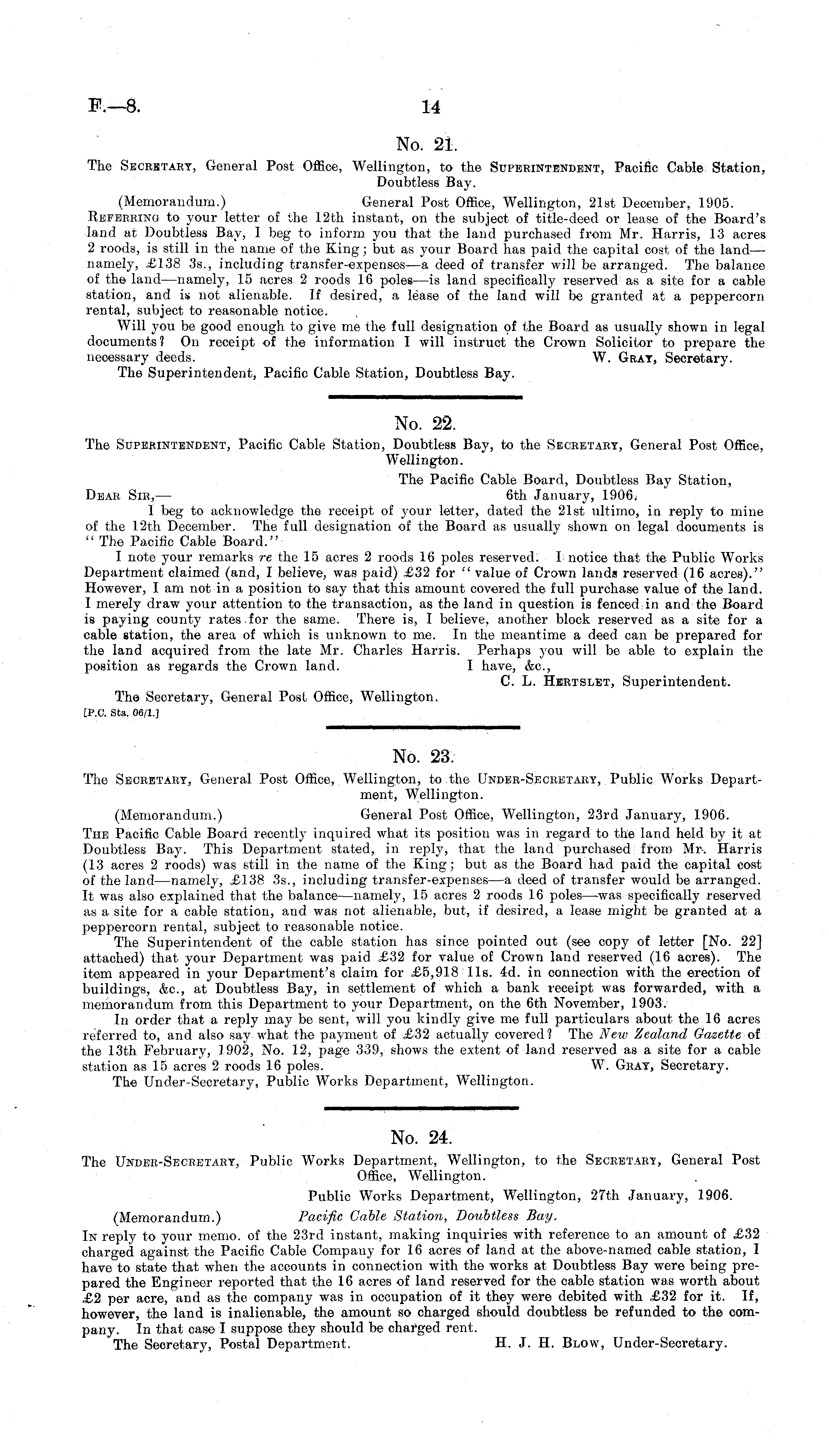 No. 24. The Under-Secretary, Public Works Department, Wellington, to the Secretary, General Post Office, Wellington. Public Works Department, Wellington, 27th January, 1906. (Memorandum.) Pacific Gable Station, Doubtless Bay. In reply to your memo, of the 23rd instant, making inquiries with reference to an amount of £32 charged against the Pacific Cable Company for 16 acres of land at the above-named cable station, I have to state that when the accounts in connection with the works at Doubtless Bay were being prepared the Engineer reported that the 16 acres of land reserved for the cable station was worth about £2 per acre, and as the company was in occupation of it they were debited with £32 for it. If, however, the land is inalienable, the amount so charged should doubtless be refunded to the company. In that case I suppose they should be charged rent. The Secretary, Postal Department. H. J. H. Blow, Under-Secretary.