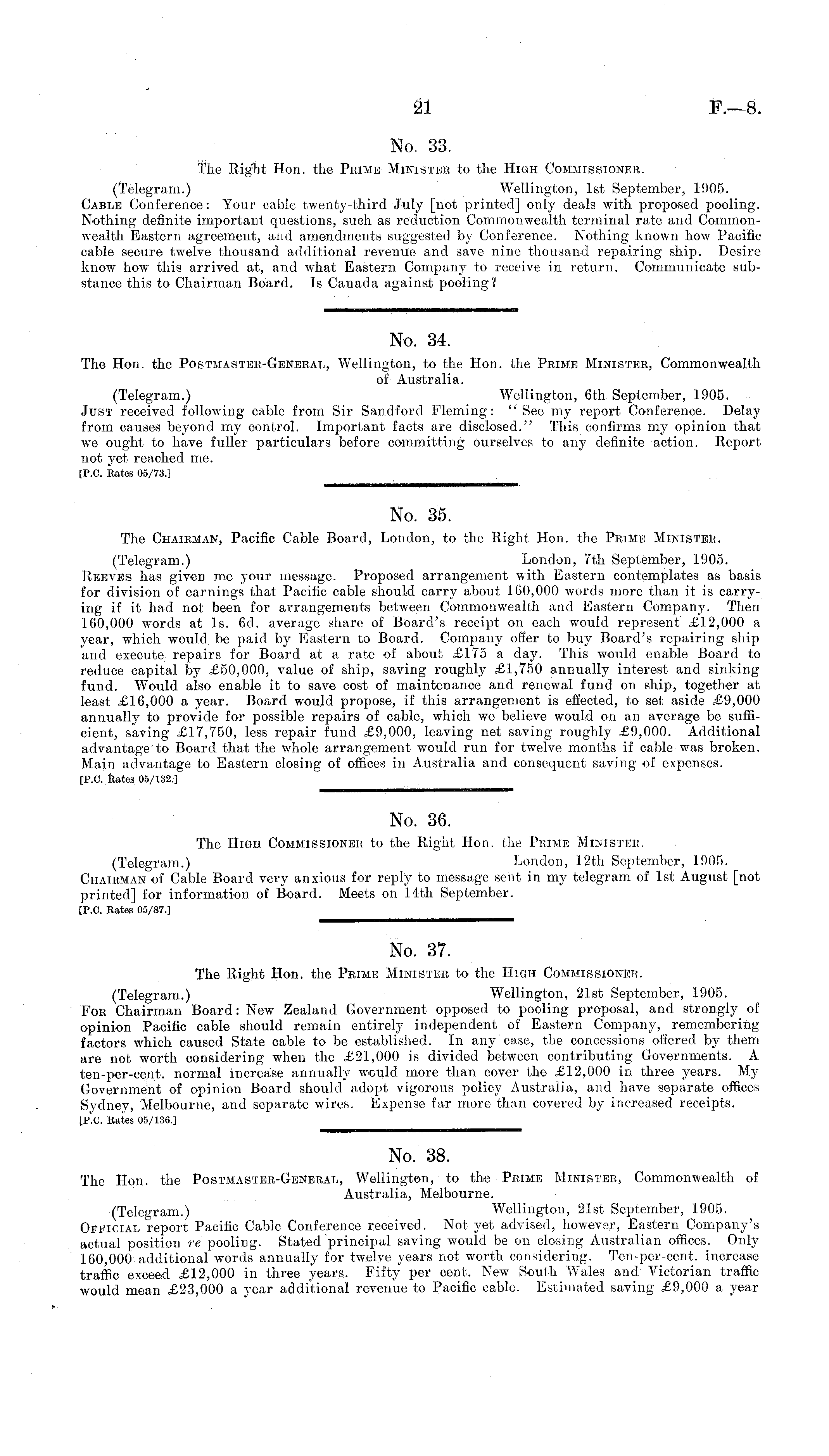 No. 33. The Right Hon. the Prime Minister to the High Commissioner. (Telegram.) Wellington, Ist September, 1905. Cable Conference: Your cable twenty-third July [not printed] only deals with proposed pooling. Nothing definite important questions, such as reduction Commonwealth terminal rate and Commonwealth Eastern agreement, and amendments suggested by Conference. Nothing known how Pacific cable secure twelve thousand additional revenue and save nine thousand repairing ship. Desire know how this arrived at, and what Eastern Company to receive in return. Communicate substance this to Chairman Board. Is Canada against pooling?