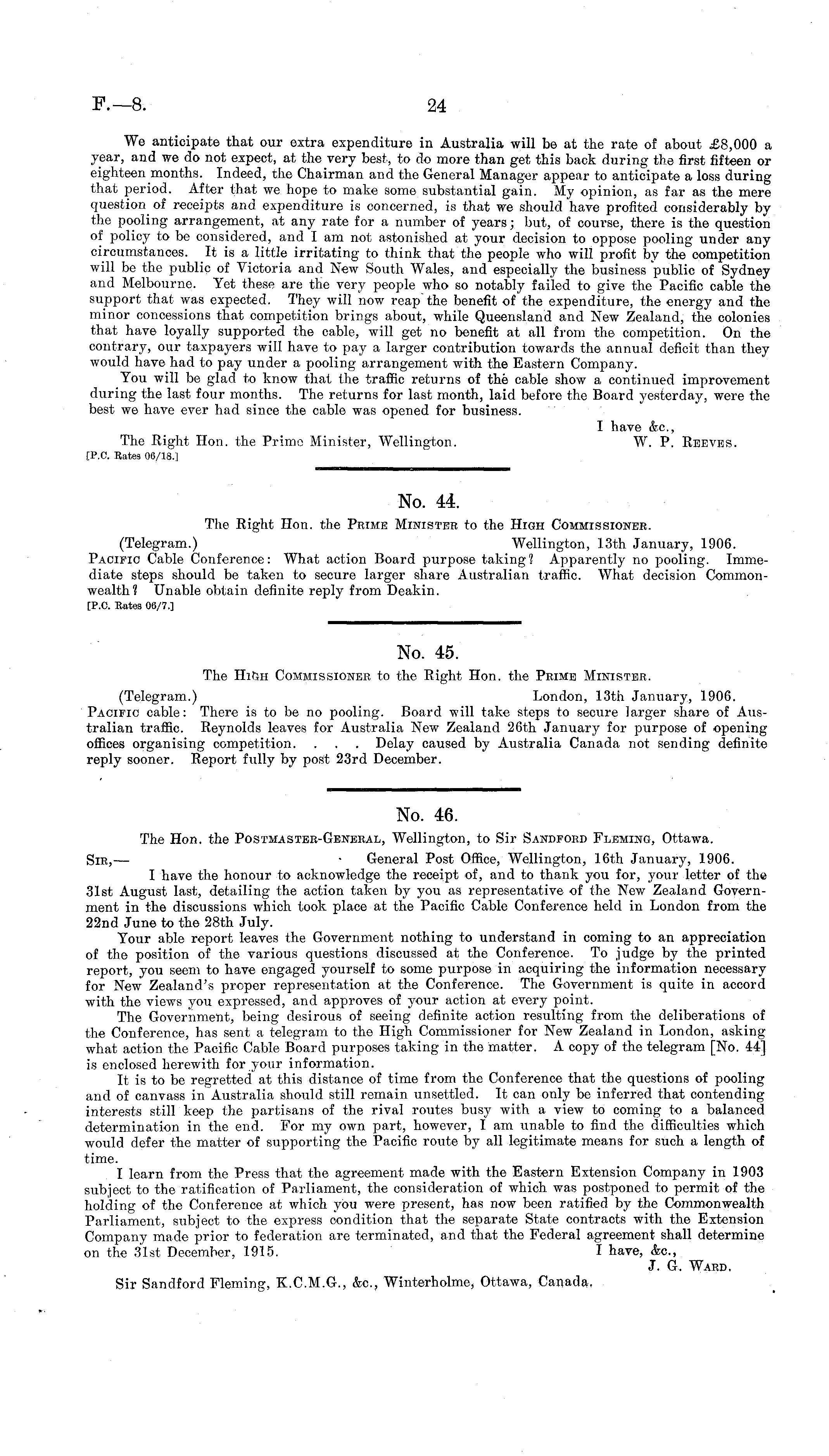 No. 46. The Hon. the Postmaster-General, Wellington, to Sir Sandford Fleming, Ottawa. Sir, — • General Post Office, Wellington, 16th January, 1906. I have the honour to acknowledge the receipt of, and to thank you for, your letter of the 31st August last, detailing the action taken by you as representative of the New Zealand Government in the discussions which took place at the Pacific Cable Conference held in London from the 22nd June to the 28th July. Your able report leaves the Government nothing to understand in coming to an appreciation of the position of the various questions discussed at the Conference. To judge by the printed report, you seem to have engaged yourself to some purpose in acquiring the information necessary for New Zealand's proper representation at the Conference. The Government is quite in accord with the views you expressed, and approves of your action at every point. The Government, being desirous of seeing definite action resulting from the deliberations of the Conference, has sent a telegram to the High Commissioner for New Zealand in London, asking what action the Pacific Cable Board purposes taking in the matter. A copy of the telegram [No. 44] is enclosed herewith for .your information. It is to be regretted at this distance of time from the Conference that the questions of pooling and of canvass in Australia should still remain unsettled. It can only be inferred that contending interests still keep the partisans of the rival routes busy with a view to coming to a balanced determination in the end. For my own part, however, I am unable to find the difficulties which would defer the matter of supporting the Pacific route by all legitimate means for such a length of time. I learn from the Press that the agreement made with the Eastern Extension Company in 1903 subject to the ratification of Parliament, the consideration of which was postponed to permit of the holding of the Conference at which you were present, has now been ratified by the Commonwealth Parliament, subject to the express condition that the separate State contracts with the Extension Company made prior to federation are terminated, and that the Federal agreement shall determine on the 31st December, 1915. I have, &c, J. G. Ward. Sir Sandford Fleming, K.C.M.G., &c, Winterholme, Ottawa, Canada,