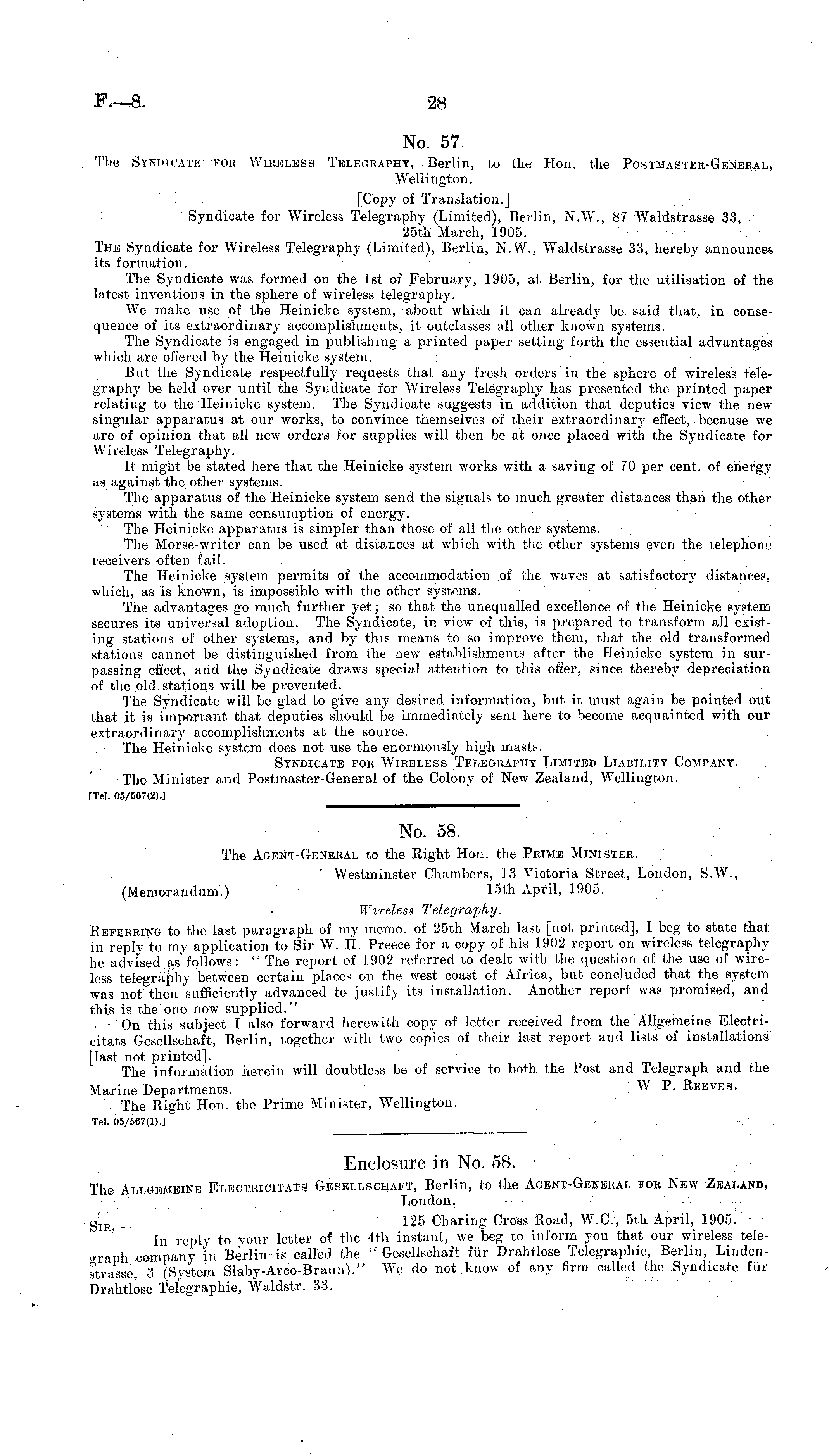 Enclosure in No. 58. The Allgemeine Electrioitats Gesellschaft, Berlin, to the Agent-General for New Zealand, London. : - 125 Charing Cross Road, W.C., sth April, 1905. In reply to your letter of the 4th instant, we beg to inform you that our wireless telegraph company in Berlin is called the "Gesellschaft fur Drahtlose Telegraphic, Berlin, Lindenstrasse, 3 (System Slaby-Arco-BraunV We do not know of any firm called the Syndicate. fur Drahtlose Telegraphic, Waldstr. 33.