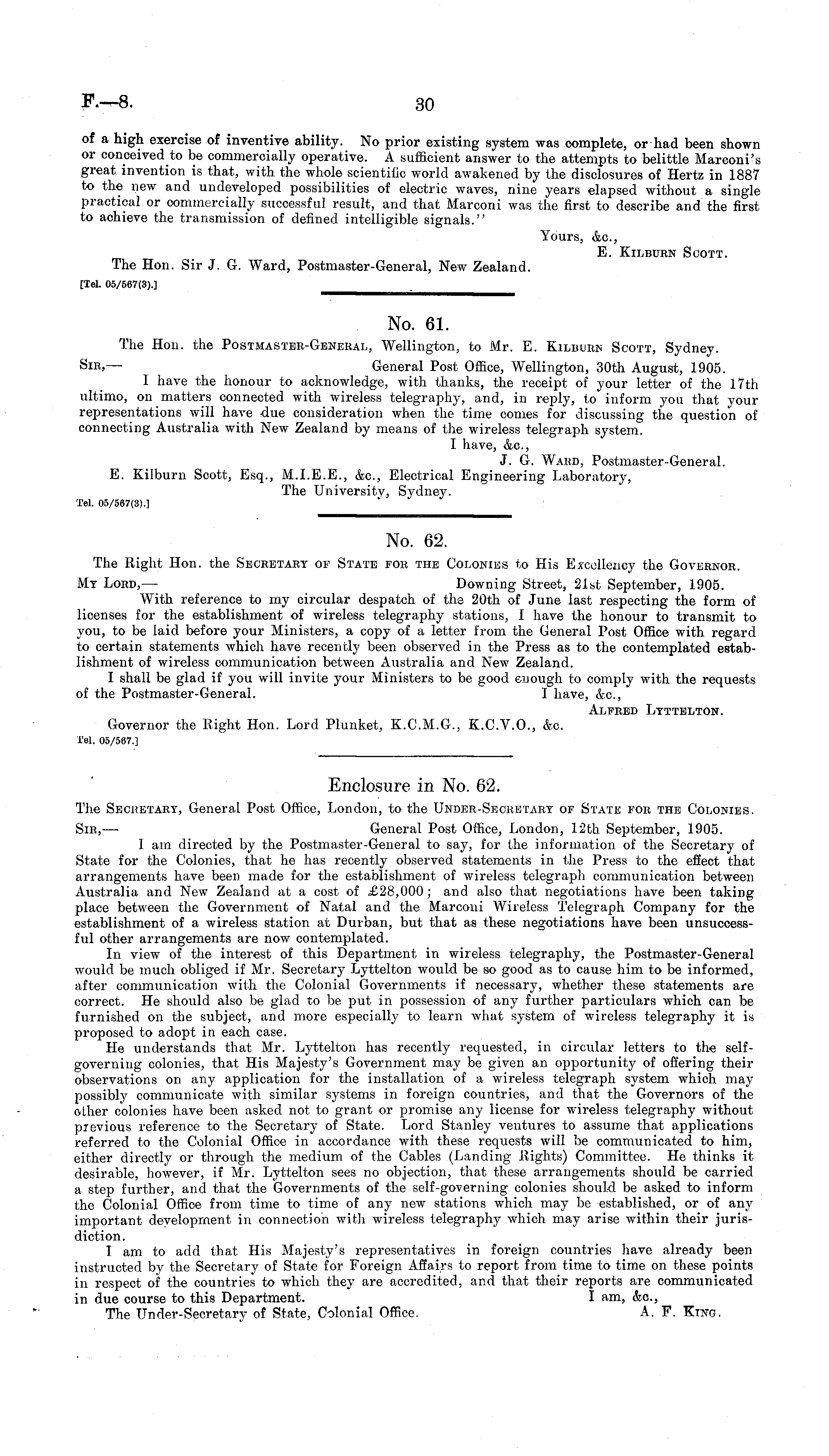 No. 62. The Right Hon. the Secretary of State for the Colonies to His Excellency the Governor. My Lord, — Downing Street, 21st September, 1905. With reference to my circular despatch of the 20th of June last respecting the form of licenses for the establishment of wireless telegraphy stations, I have the honour to transmit to you, to be laid before your Ministers, a copy of a letter from the General Post Office with regard to certain statements which have recently been observed in the Press as to the contemplated establishment of wireless communication between Australia and New Zealand. I shall be glad if you will invite your Ministers to be good enough to comply with the requests of the Postmaster-General. I have, &c, Alfred Lyttelton. Governor the Right Hon. Lord Plunket, K.C.M.G., X.C.V.0., &c. X'el. 05/567.]