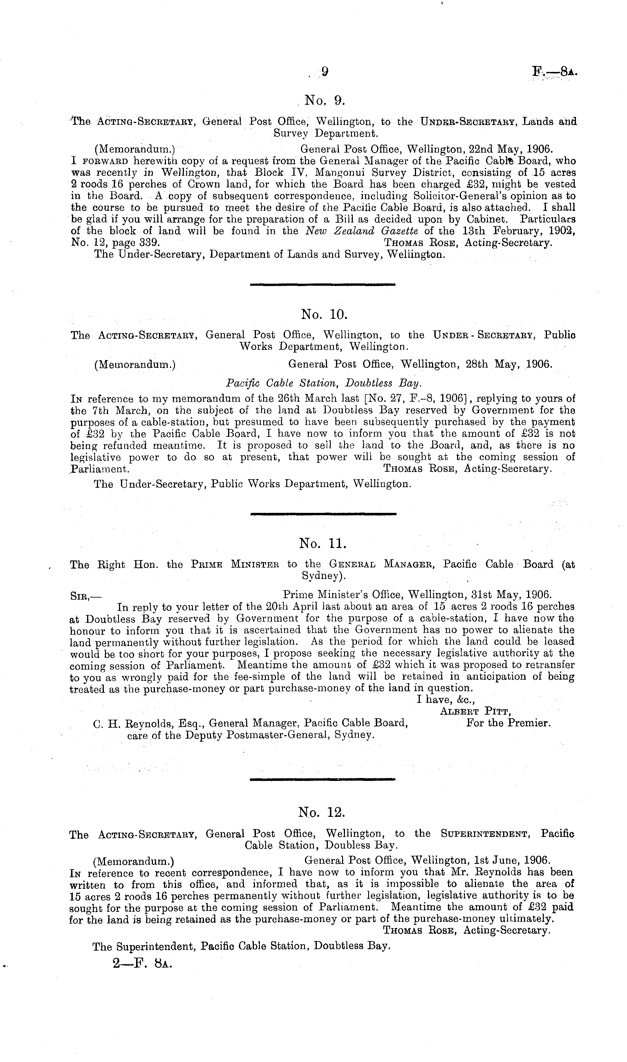 No. 10. The Acting-Secretary, General Post Office, Wellington, to the Under - Secretary, Public Works Department, Wellington. (Memorandum.) General Post Office, Wellington, 28th May, 1906. Pacific Cable Station, Doubtless Bay. In reference to my memorandum of the 26th March last [No. 27, F.-8, 1906], replying to yours of the 7th March, on the subject of the land at Doubtless Bay reserved by Government for the purposes of a cable-station, but presumed to have been subsequently purchased by the payment of £32 by the Pacific Cable Board, I have now to inform you that the amount of £32 is not being refunded meantime. It is proposed to sell the land to the Board, and, as there is no legislative power to do so at present, that power will be sought at the coming session of Parliament. Thomas Rose, Acting-Secretary. The Under-Secretary, Public Works Department, Wellington.