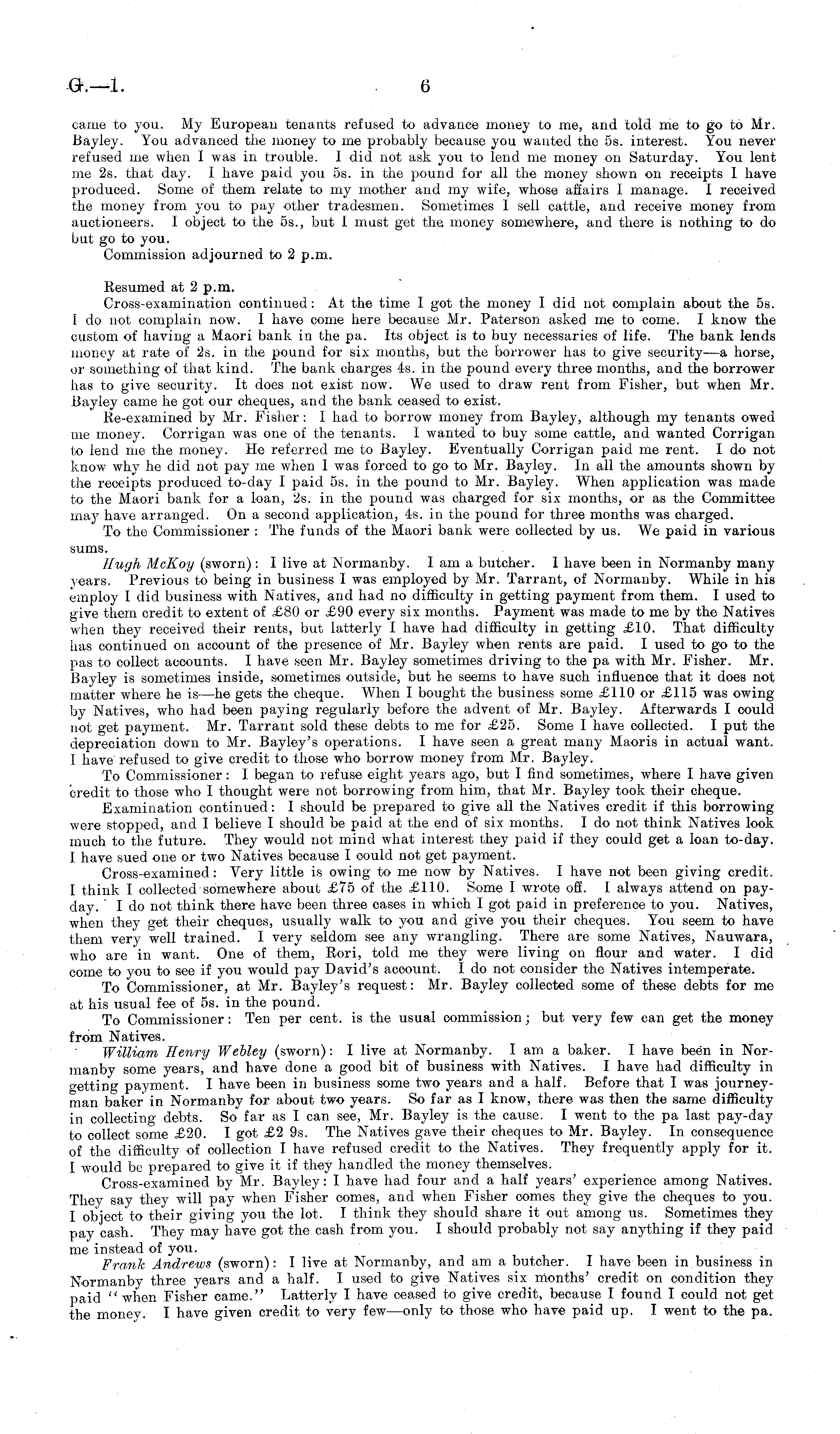 came to you. My Eluropean tenants refused to advance money to me, and told me to go to Mr. Bayley. You advanced the money to me probably because you wanted the ss. interest. You never refused me when I was in trouble. I did not ask you to lend me money on Saturday. You lent me 2s. that day. I have paid you ss. in the pound for all the money shown on receipts I have produced. Some of them relate to my mother and my wife, whose affairs I manage. I received the money from you to pay other tradesmen. Sometimes I sell cattle, and receive money from auctioneers. I object to the 55., but I must get the money somewhere, and there is nothing to do but go to you. Commission adjourned to 2 p.m. Resumed at 2 p.m. Cross-examination continued: At the time I got the money I did not complain about the ss. Ido not complain now. I have come here because Mr. Paterson asked me to come. I know the custom of having a Maori bank in the pa. Its object is to buy necessaries of life. The bank lends money at rate of 2s. in the pound for six months, but the borrower has to give security—a horse, or something of that kind. The bank charges 4s. in the pound every three months, and the borrower has to give security. It does not exist now. We used to draw rent from Fisher, but when Mr. Bayley came he got our cheques, and the bank ceased to exist. Re-examined by Mr. Fisher : I had to borrow money from Bayley, although my tenants owed me money. Corrigan was one of the tenants. I wanted to buy some cattle, and wanted Corrigan to lend me the money. He referred me to Bayley. Eventually Corrigan paid me rent. Ido not know why he did not pay me when I was forced to go to Mr. Bayley. In all the amounts shown by the receipts produced to-day I paid ss. in the pound to Mr. Bayley. When application was made to the Maori bank for a loan, 2s. in the pound was charged for six months, or as the Committee may have arranged. On a second application, 4s. in the pound for three months was charged. To the Commissioner : The funds of the Maori bank were collected by us. We paid in various sums. Hugh McKoy (sworn): I live at Normanby. lam a butcher. I have been in Normanby many years. Previous to being in business I was employed by Mr. Tarrant, of Normanby. While in his employ I did business with Natives, and had no difficulty in getting payment from them. I used to give them credit to extent of £80 or £90 every six months. Payment was made to me by the Natives when they received their rents, but latterly I have had difficulty in getting £10. That difficulty has continued on account of the presence of Mr. Bayley when rents are paid. I used to go to the pas to collect accounts. I have seen Mr. Bayley sometimes driving to the pa with Mr. Fisher. Mr. Bayley is sometimes inside, sometimes outside, but he seems to have such influence that it does not matter where he is—he gets the cheque. When I bought the business some £110 or £115 was owing by Natives, who had been paying regularly before the advent of Mr. Bayley. Afterwards I could not get payment. Mr. Tarrant sold these debts to me for £25. Some I have collected. I put the depreciation down to Mr. Bayley's operations. I have seen a great many Maoris in actual want. I have refused to give credit to those who borrow money from Mr, Bayley. To Commissioner: I began to refuse eight years ago, but I find sometimes, where I have given credit to those who I thought were not borrowing from him, that Mr. Bayley took their cheque. Examination continued: I should be prepared to give all the Natives credit if this borrowingwere stopped, and I believe I should be paid at the end of six months. Ido not think Natives look much to the future. They would not mind what interest they paid if they could get a loan to-day. I have sued one or two Natives because I could not get payment. Cross-examined: Very little is owing to me now by Natives. I have not been giving credit. I think I collected somewhere about £75 of the £110. Some I wrote off. I always attend on payday. Ido not think there have been three cases in which I got paid in preference to you. Natives, when they get their cheques, usually walk to you and give you their cheques. You seem to have them very well trained. I very seldom see any wrangling. There are some Natives, Nauwara, who are in want. One of them, Rori, told me they were living on flour and water. I did come to you to see if you would pay David's account. Ido not consider the Natives intemperate. To Commissioner, at Mr. Bayley's request: Mr. Bayley collected some of these debts for me at his usual fee of ss. in the pound. To Commissioner : Ten per cent, is the usual commission; but very few can get the money from Natives. William Henry Webley (sworn): I live at Normanby. lam a baker. I have been in Normanby some years, and have done a good bit of business with Natives. I have had difficulty in getting payment. I have been in business some two years and a half. Before that I was journeyman baker in Normanby for about two years. So far as I know, there was then the same difficulty in collecting debts. So far as I can see, Mr. Bayley is the cause. I went to the pa last pay-day to collect some £20. I got £2 9s. The Natives gave their cheques to Mr. Bayley. In consequence of the difficulty of collection I have refused credit to the Natives. They frequently apply for it. I would be prepared to give it if they handled the money themselves. Cross-examined by Mr. Bayley: I have had four and a half years' experience among Natives. They say they will pay when Fisher comes, and when Fisher comes they give the cheques to you. I object"to their giving you the lot. I think they should share it out among us. Sometimes they pay cash. They may have got the cash from you. I should probably not say anything if they paid me instead of you. Frank Andrews (sworn): I live at Normanby, and am a butcher. I have been in business in Normanby three years and a half. I used to give Natives six months' cred