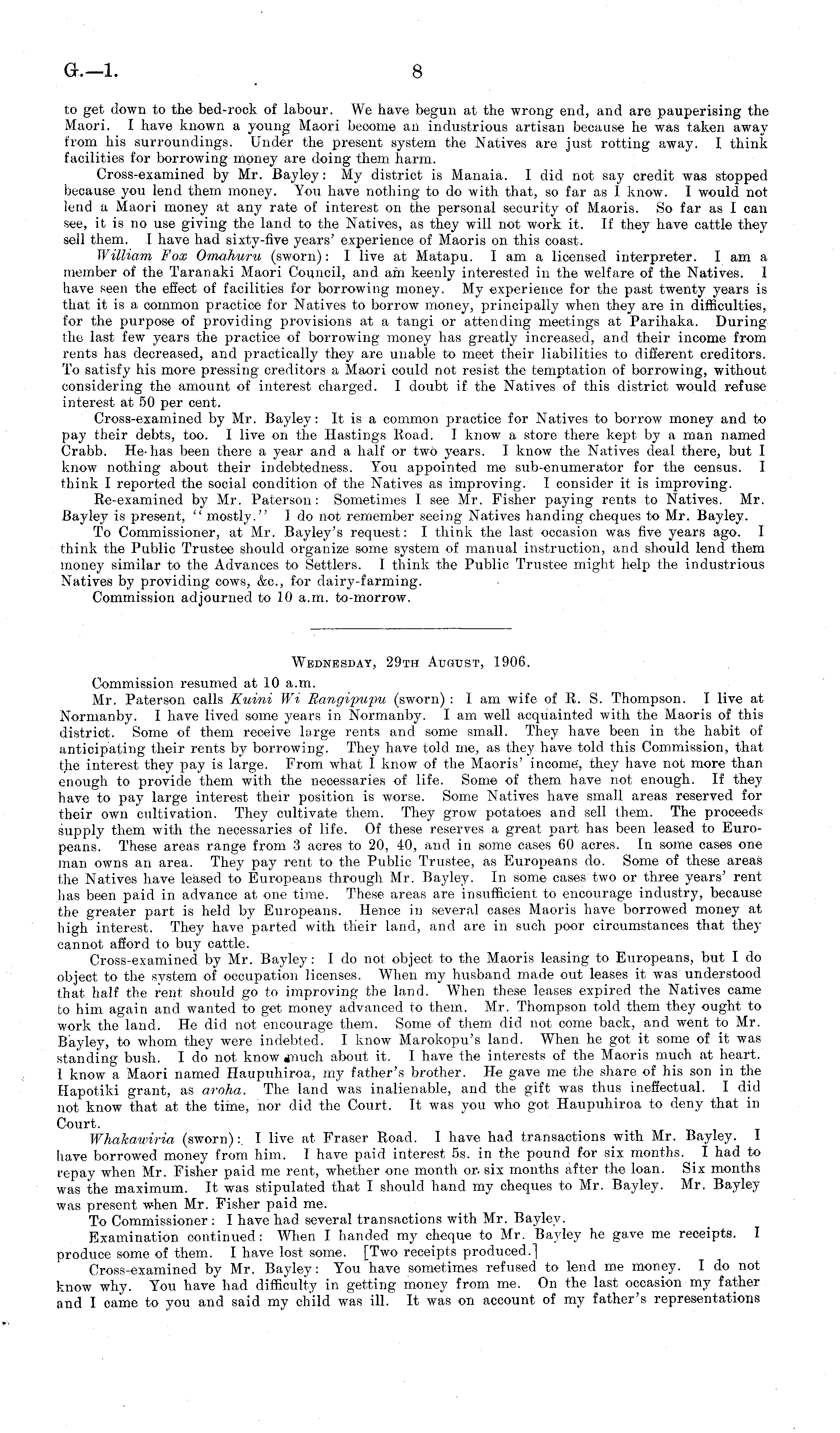 to get down to the bed-rock of labour. We have begun at the wrong end, and are pauperising the Maori. I have known a young Maori become an industrious artisan because he was taken away from his surroundings. Under the present system the Natives are just rotting away. I think facilities for borrowing money are doing them harm. Cross-examined by Mr. Bayley: My district is Manaia. I did not say credit was stopped because you lend them money. You have nothing to do with that, so far as I know. I would not lend a Maori money at any rate of interest on the personal security of Maoris. So far as I can see, it is no use giving the land to the Natives, as they will not work it. If they have cattle they sell them. I have had sixty-five years' experience of Maoris on this coast. William Fox Omahuru (sworn): I live at Matapu. I am a licensed interpreter. I am a member of the Taranaki Maori Council, and am keenly interested in the welfare of the Natives. I have seen the effect of facilities for borrowing money. My experience for the past twenty years is that it is a common practice for Natives to borrow money, principally when they are in difficulties, for the purpose of providing provisions at a tangi or attending meetings at Parihaka. During the last few years the practice of borrowing money has greatly increased, and their income from rents has decreased, and practically they are unable to meet their liabilities to different creditors. To satisfy his more pressing creditors a Maori could not resist the temptation of borrowing, without considering the amount of interest charged. I doubt if the Natives of this district would refuse interest at 50 per cent. Cross-examined by Mr. Bayley: It is a common practice for Natives to borrow money and to pay their debts, too. I live on the Hastings Road. I know a store there kept by a man named Crabb. He- has been there a year and a half or two years. I know the Natives deal there, but I know nothing about their indebtedness. You appointed me sub-enumerator for the census. I think I reported the social condition of the Natives as improving. I consider it is improving. Re-examined b}' Mr. Paterson: Sometimes I see Mr. Fisher paying rents to Natives. Mr. Bayley is present, " mostly." Ido not remember seeing Natives handing cheques to Mr. Bayley. To Commissioner, at Mr. Bayley's request: I think the last occasion was five years ago. I think the Public Trustee should organize some system of manual instruction, and should lend them money similar to the Advances to Settlers. I think the Public Trustee might help the industrious Natives by providing cows, &c, for dairy-farming. Commission adjourned to 10 a.m. to-morrow.