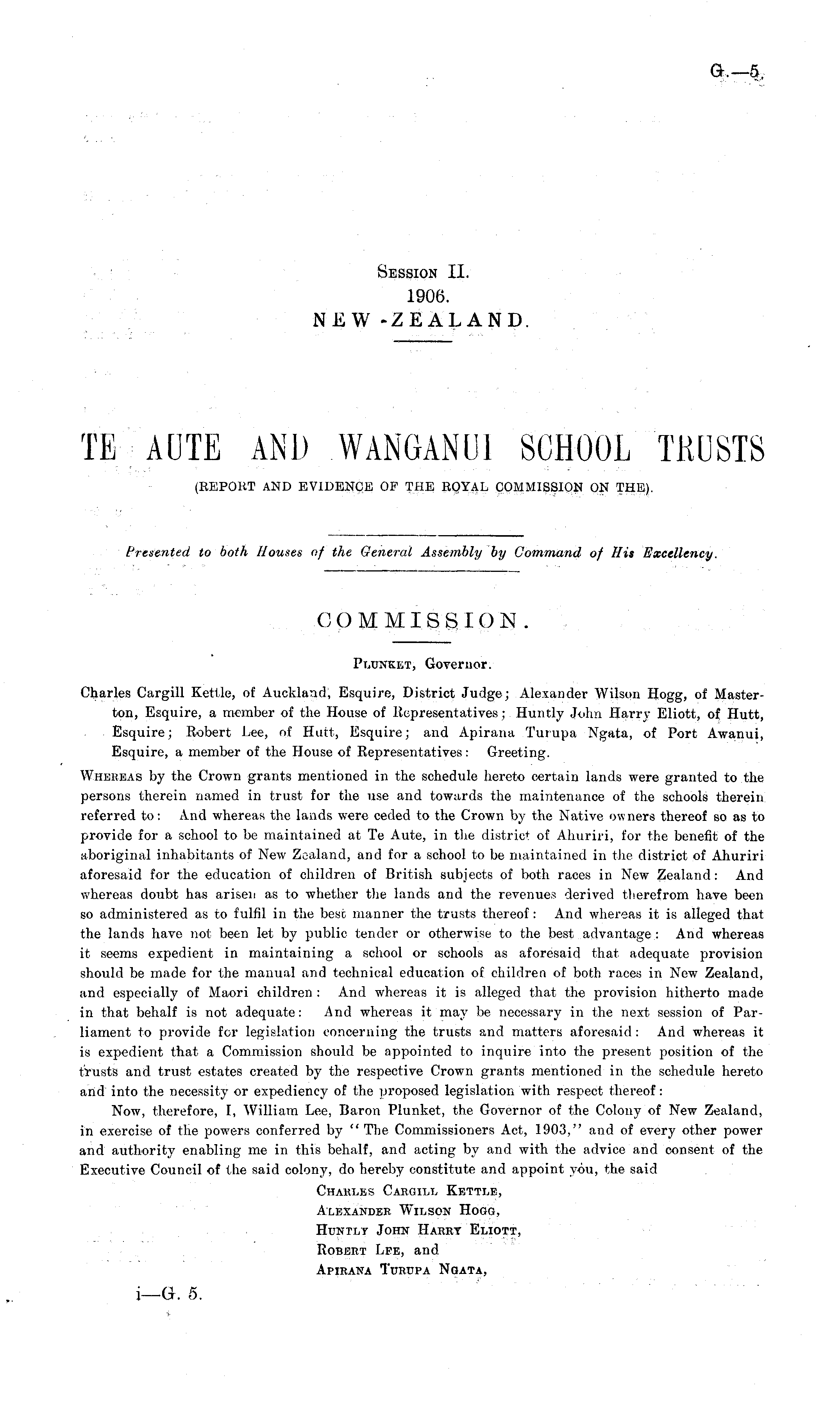 Pmjnket, Governor. Charles Cargill Kettle, of Auckland, Esquire, District Judge; Alexander Wilson Hogg, of Masterton, Esquire, a member of the House of Representatives; Huntly John Harry Eliott, of Hutt, Esquire; Robert Lee, of Hutt, Esquire; and Apirana Turupa Ngata, of Port Awanui, Esquire, a member of the House of Representatives: Greeting. Whereas by the Crown grants mentioned in the schedule hereto certain lands were granted to the persons therein named in trust for the use and towards the maintenance of the schools therein referred to: And whereas the lands were ceded to the Crown by the Native owners thereof so as to provide for a school to be maintained at Te Aute, in the district of Ahuriri, for the benefit of the aboriginal inhabitants of New Zealand, and for a school to be maintained in the district of Ahuriri aforesaid for the education of children of British subjects of both races in New Zealand: And whereas doubt has arisen as to whether the lands and the revenues derived therefrom have been so administered as to fulfil in the best manner the trusts thereof: And whereas it is alleged that the lands have not been let by public tender or otherwise to the best advantage : And whereas it seems expedient in maintaining a school or schools as aforesaid that adequate provision should be made for the manual and technical education of children of both races in New Zealand, and especially of Maori children : And whereas it is alleged that the provision hitherto made in that behalf is not adequate: And whereas it may be necessary in the next session of Parliament to provide for legislation concerning the trusts and matters aforesaid: And whereas it is expedient that a Commission should be appointed to inquire into the present position of the trusts and trust estates created by the respective Crown grants mentioned in the schedule hereto and into the necessity or expediency of the proposed legislation with respect thereof: Now, therefore, I, William Lee, Baron Plunket, the Governor of the Colony of New Zealand, in exercise of the powers conferred by "The Commissioners Act, 1903," and of every other power and authority enabling me in this behalf, and acting by and with the advice and consent of the Executive Council of the said colony, do hereby constitute and appoint you, the said Chaeles Cargill Kettle, Alexander Wilson Hogg, Huntly John Habet Eliott, Robert Lee, and Apirana Tueupa Ngata,